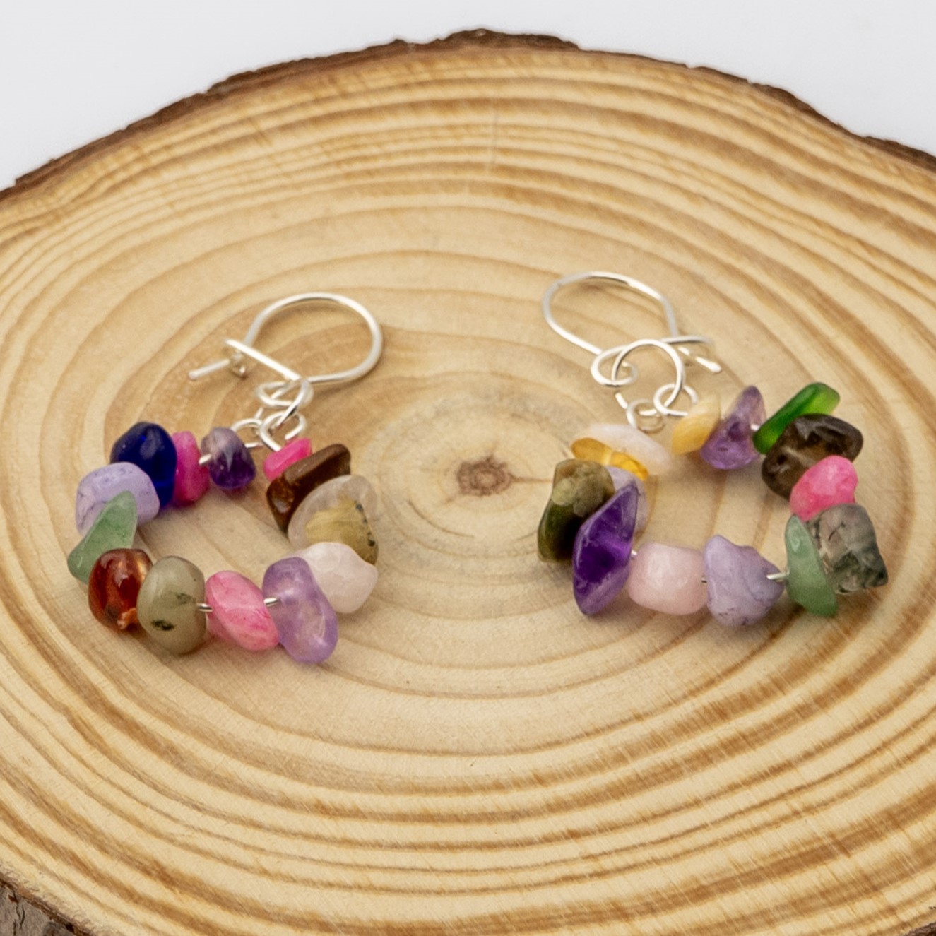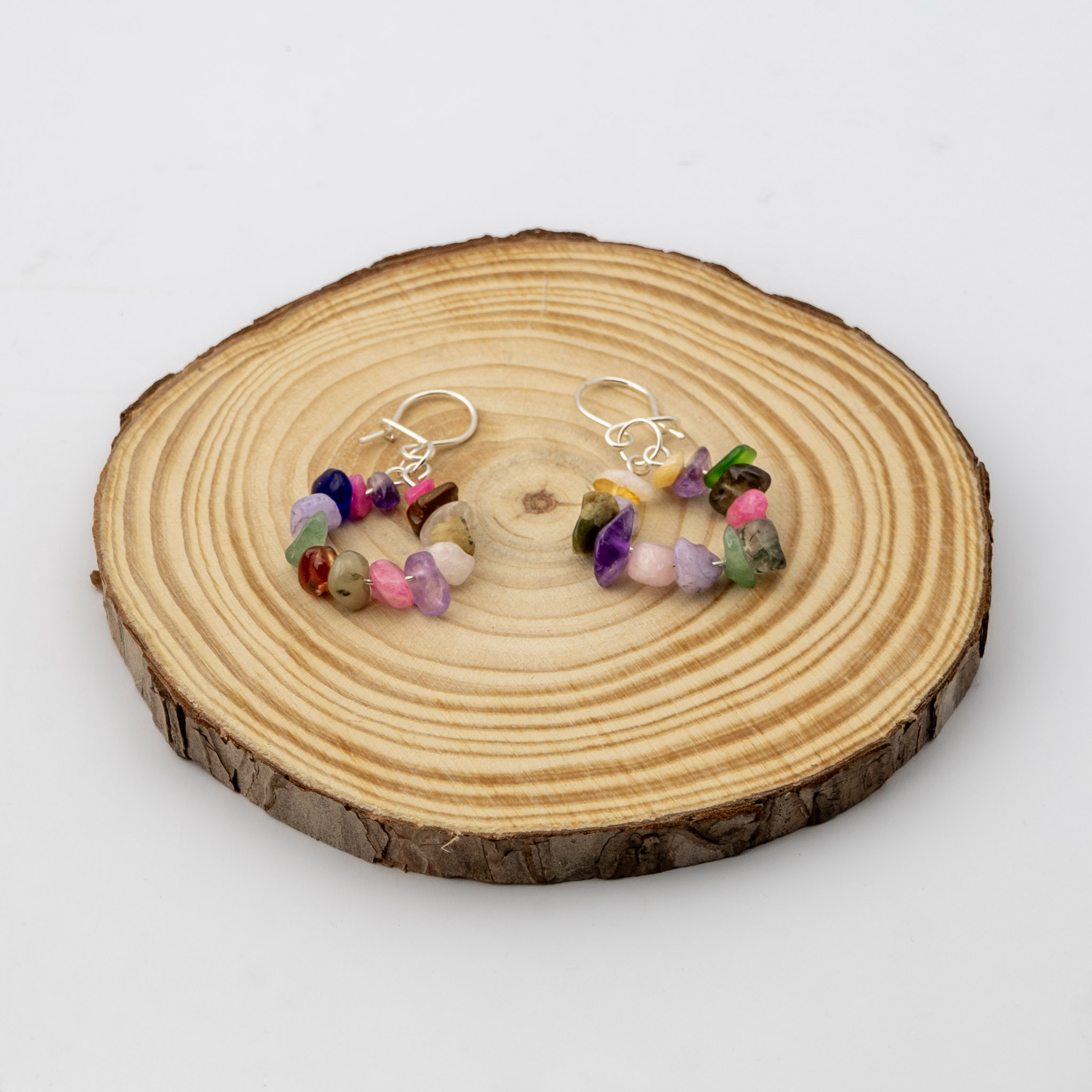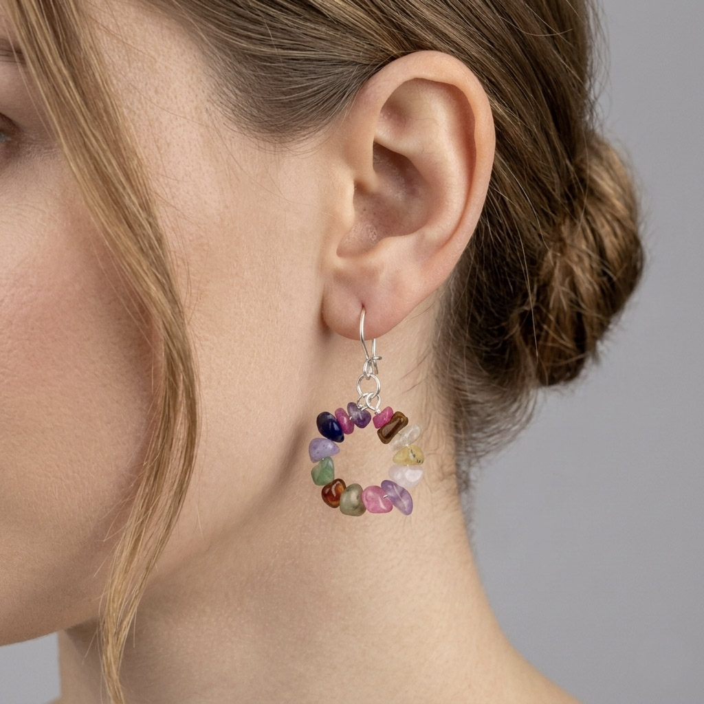 Estos aros artesanales combinan un mix de piedras naturales, cada una con sus tonos y texturas únicas, creando un diseño vibrante y lleno de carácter. Los ganchos enchapados en plata aportan un acabado elegante que realza la belleza de la composición. Una pieza ligera, versátil y original, ideal para quienes buscan un accesorio con color, energía y estilo.