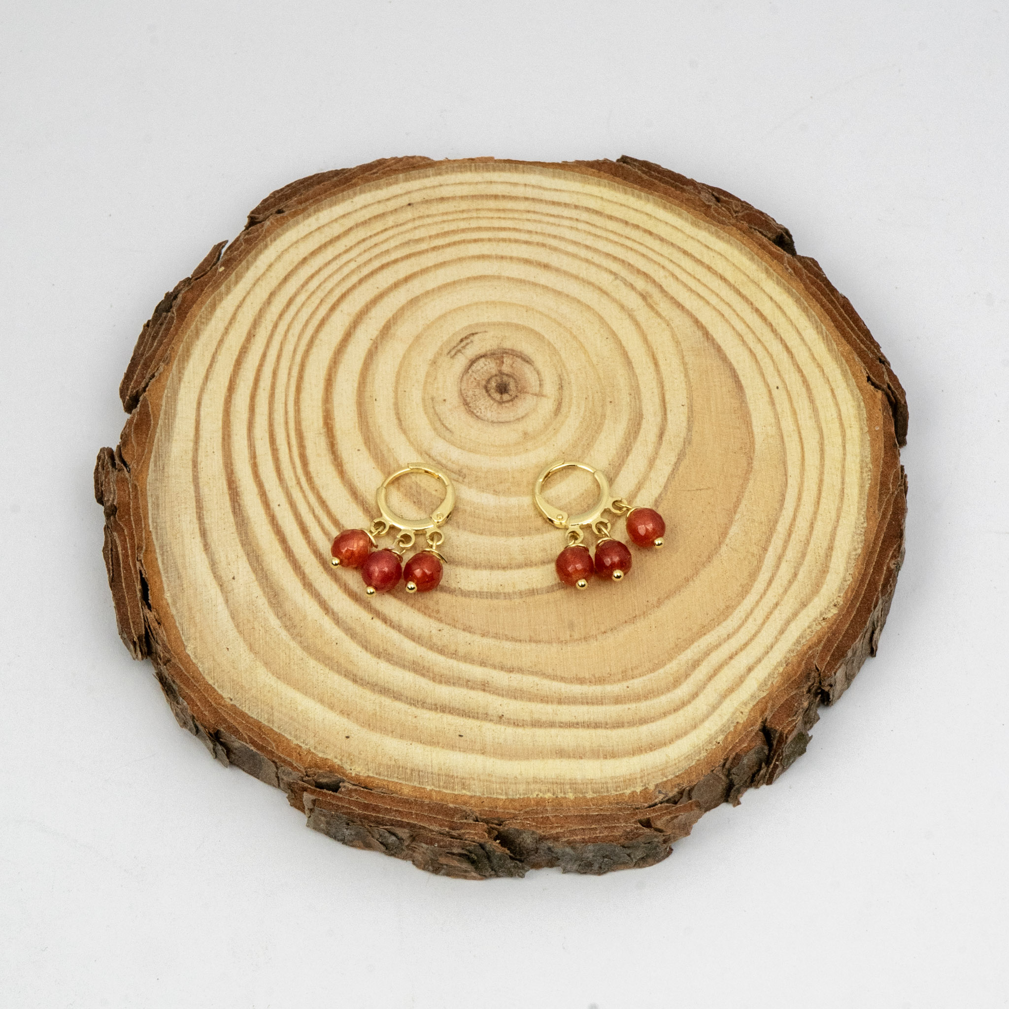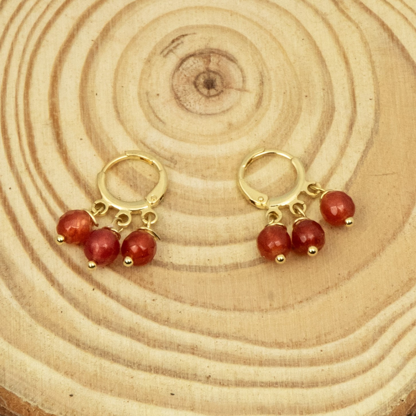 Aros confeccionados con ágatas rojas de intenso color, realzadas por ganchos enchapados en oro, creando un accesorio elegante y versátil, ideal para dar un toque de color y sofisticación a cualquier look.