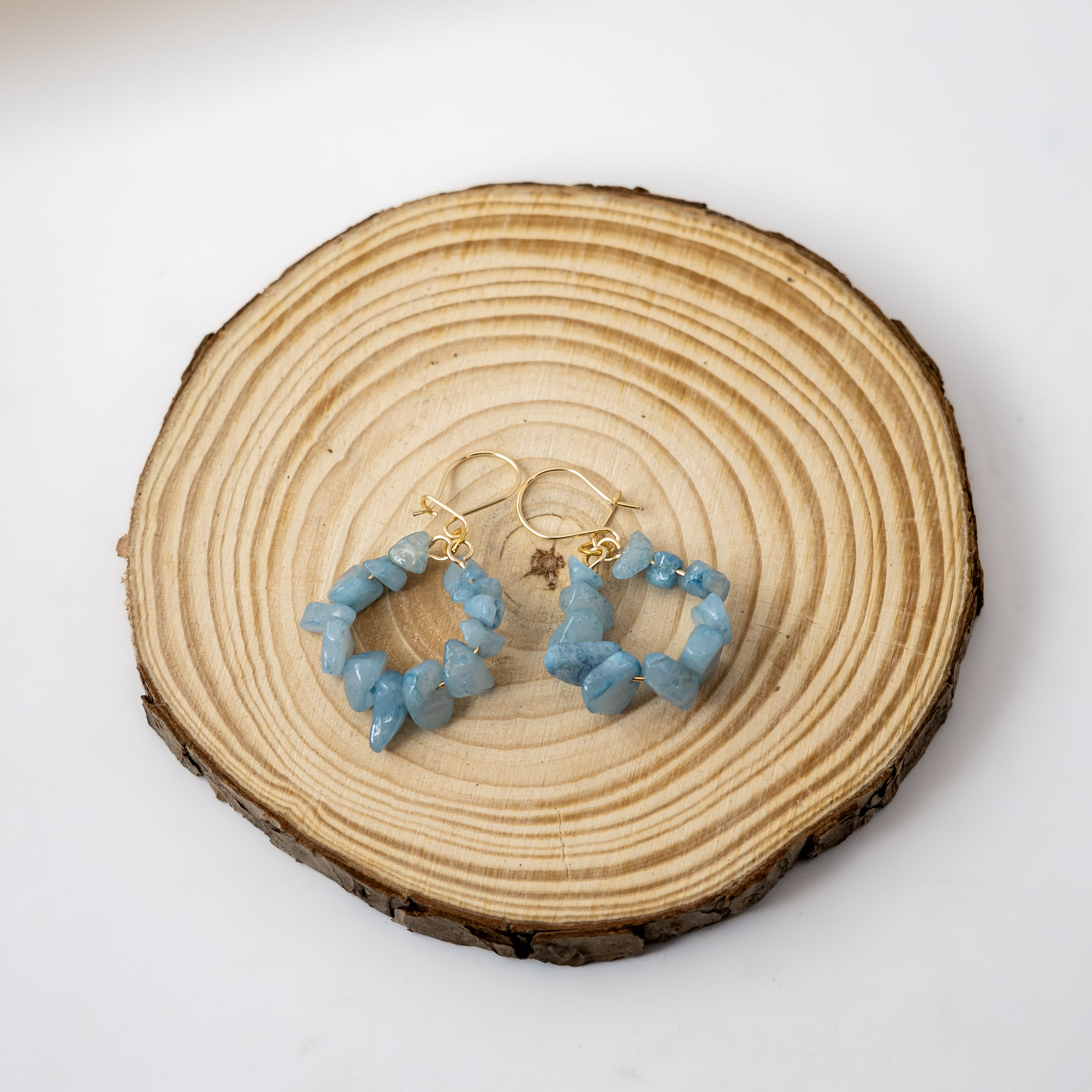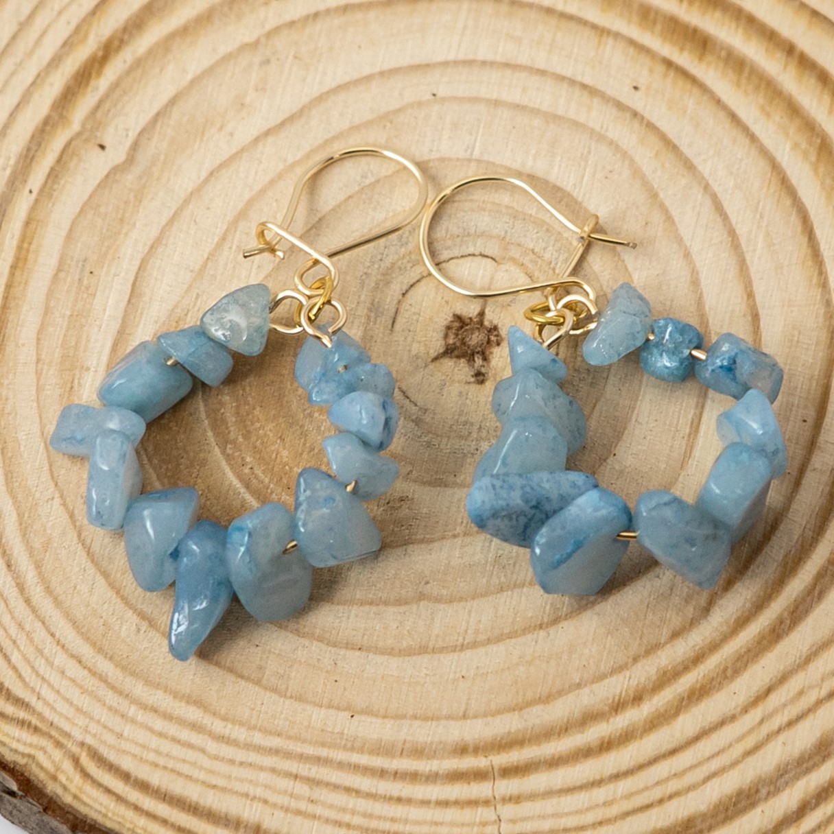 Los Aros Angelita están elaborados con delicados chips de angelita, una piedra que aporta calma y serenidad, montados en ganchos enchapados en oro para un acabado elegante y duradero. Su diseño ligero y natural los convierte en el complemento perfecto para añadir un toque sutil y sofisticado a cualquier look.