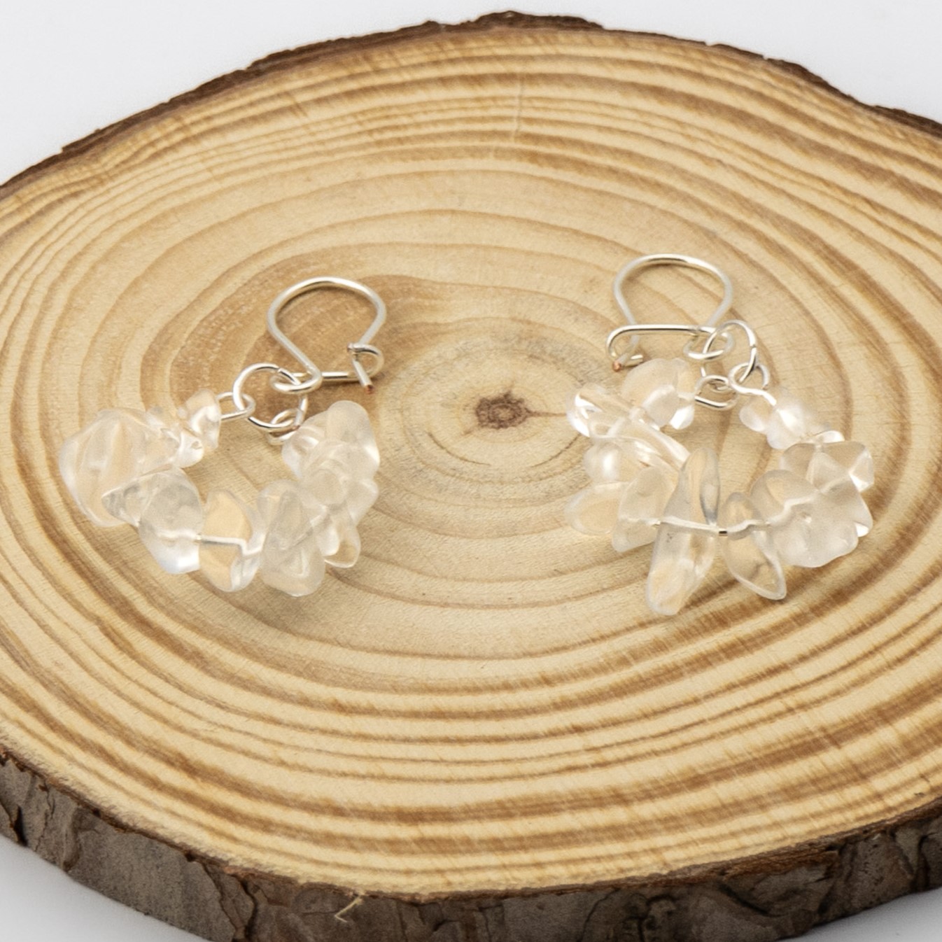 Estos aros artesanales están elaborados con cuarzo cristal, una piedra apreciada por su transparencia y elegancia natural. Su diseño limpio y luminoso se complementa con un gancho enchapado en plata, que resalta la pureza y sofisticación de la pieza. Ligeros y versátiles, son perfectos para el uso diario o como un regalo especial que aporta un toque de frescura y estilo atemporal.