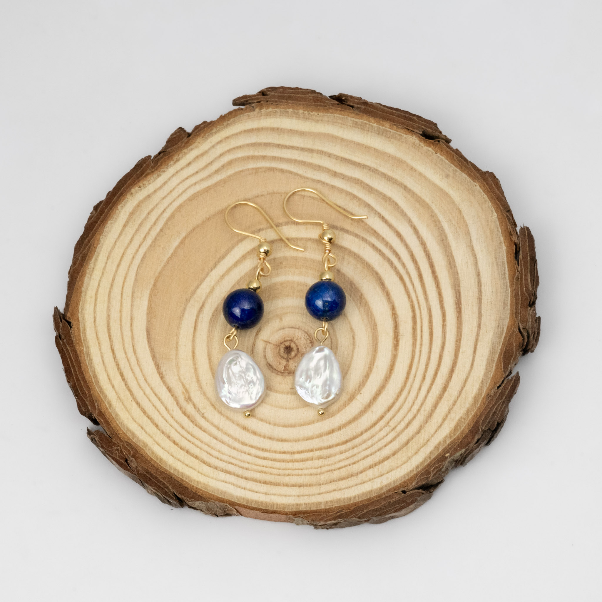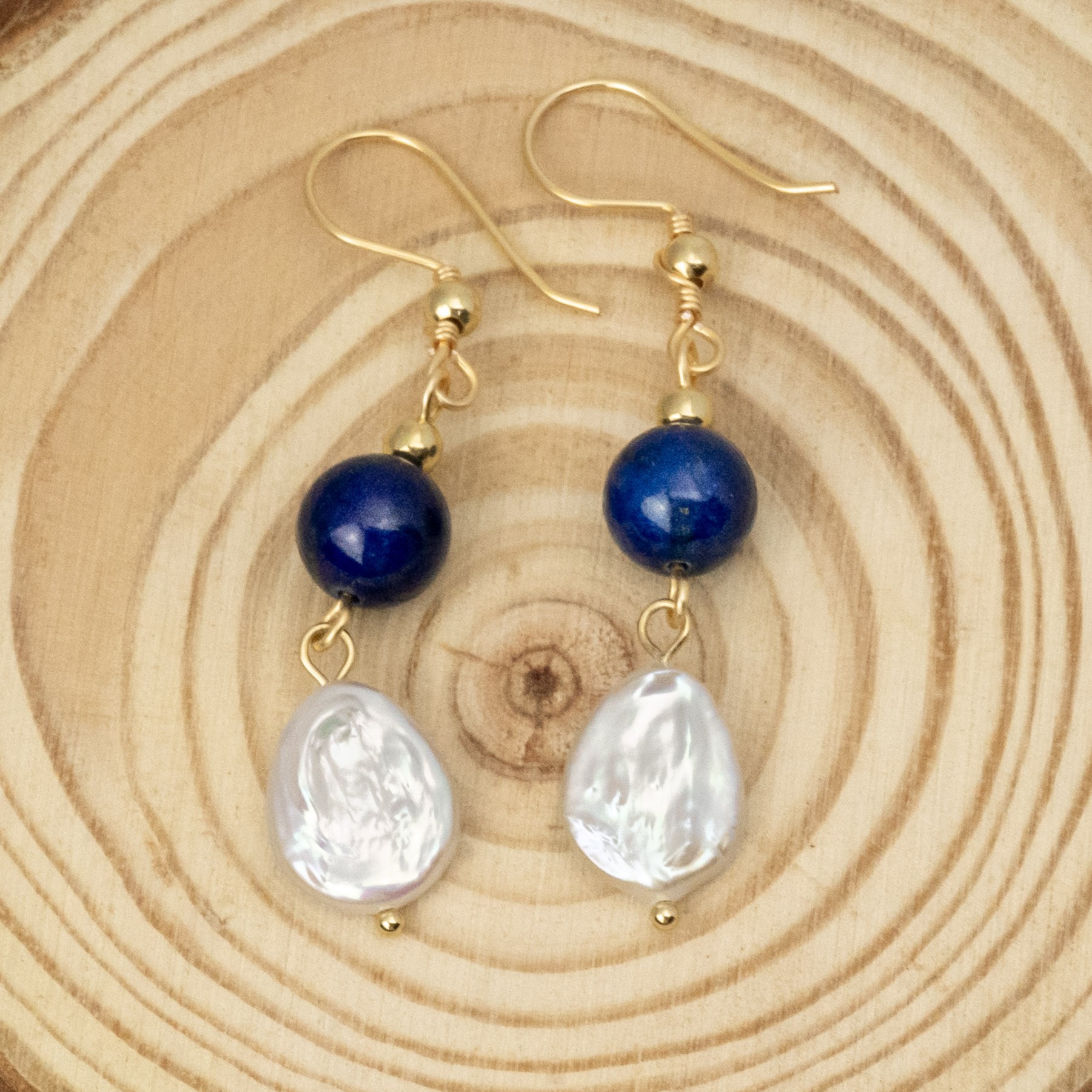 Profundos y elegantes, estos aros combinan el azul intenso del lapislázuli con la suavidad de la piedra barroca. Los ganchos y separadores enchapados en plata aportan un brillo sutil que resalta su belleza natural. Perfectos para quienes buscan una joya artesanal con historia y sofisticación.