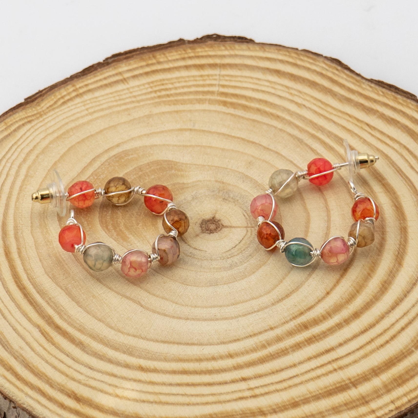 Estos aros artesanales combinan un mix de ágatas coloridas, cada una con sus tonos y vetas naturales que crean un diseño alegre y único. Los ganchos enchapados en plata aportan un acabado elegante que resalta la belleza de cada piedra. Ligeros y versátiles, son perfectos para el uso diario o como un regalo especial que aporta color, armonía y estilo a cualquier look.