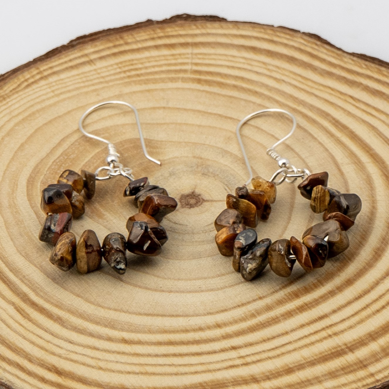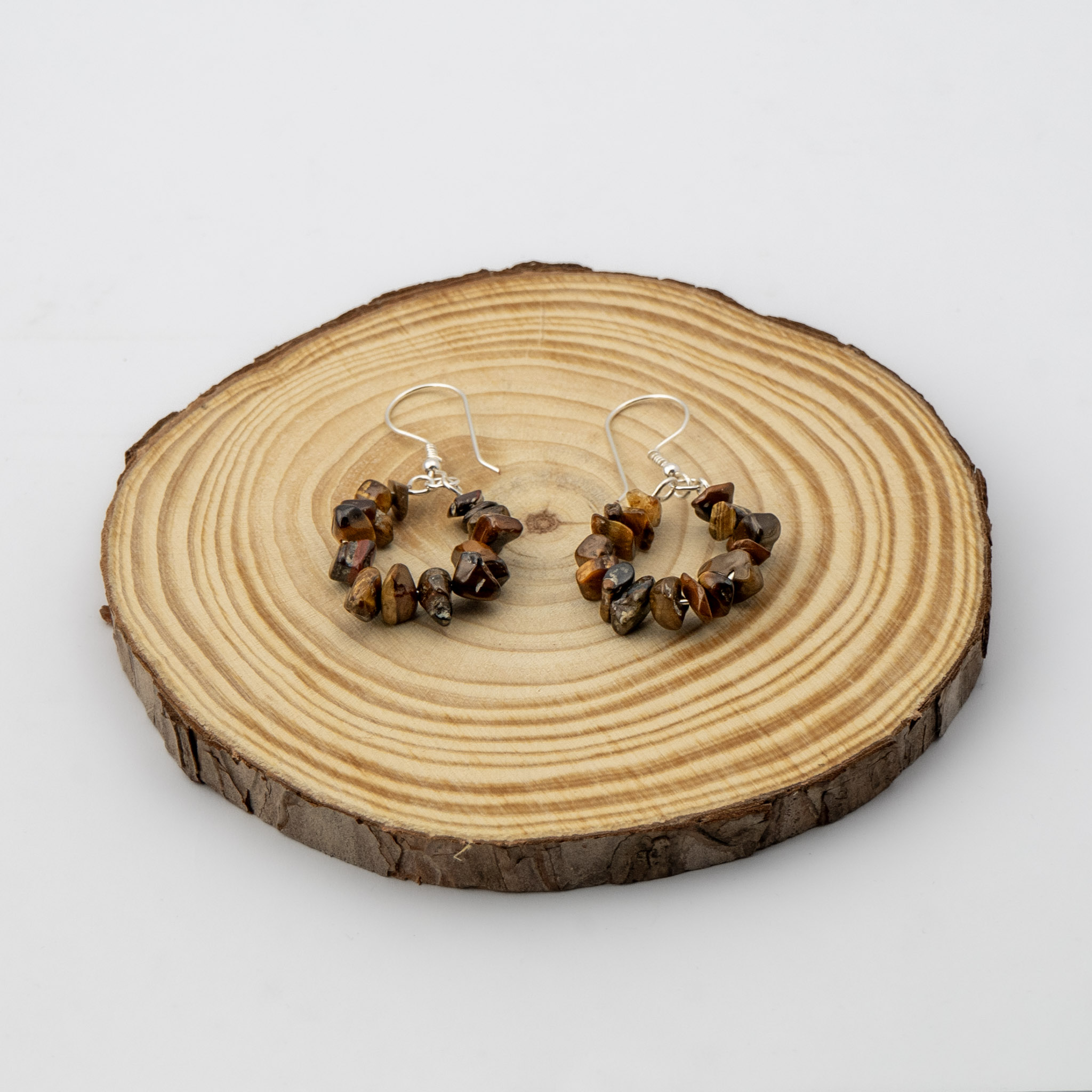 Estos aros artesanales están elaborados con ojo de tigre, piedra reconocida por sus tonos marrones dorados y su brillo distintivo que evoca fuerza y elegancia. El diseño se complementa con ganchos enchapados en plata, que realzan la calidez natural de la piedra. Ligeros y versátiles, son ideales para el uso diario o como un regalo especial que aporta carácter y estilo atemporal.