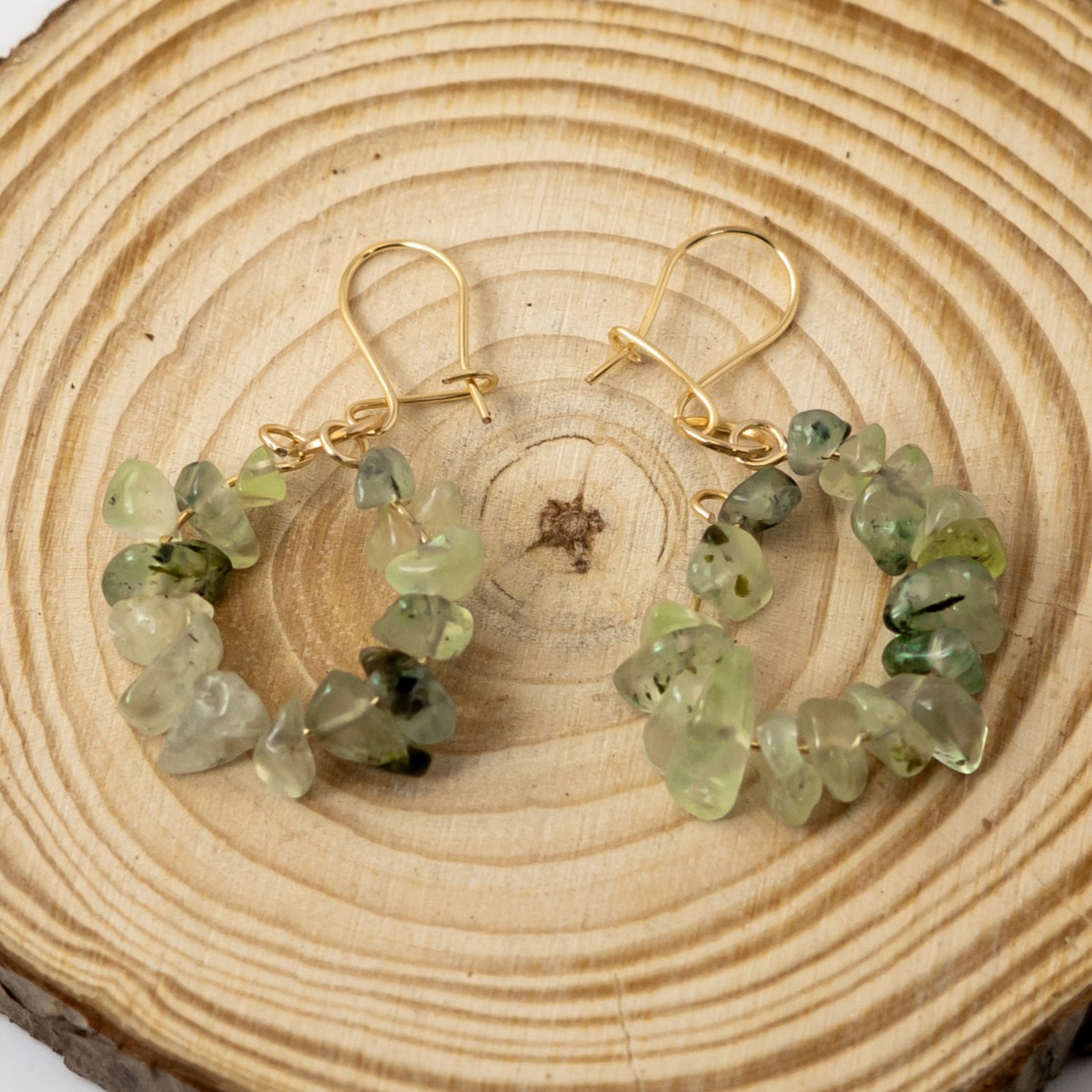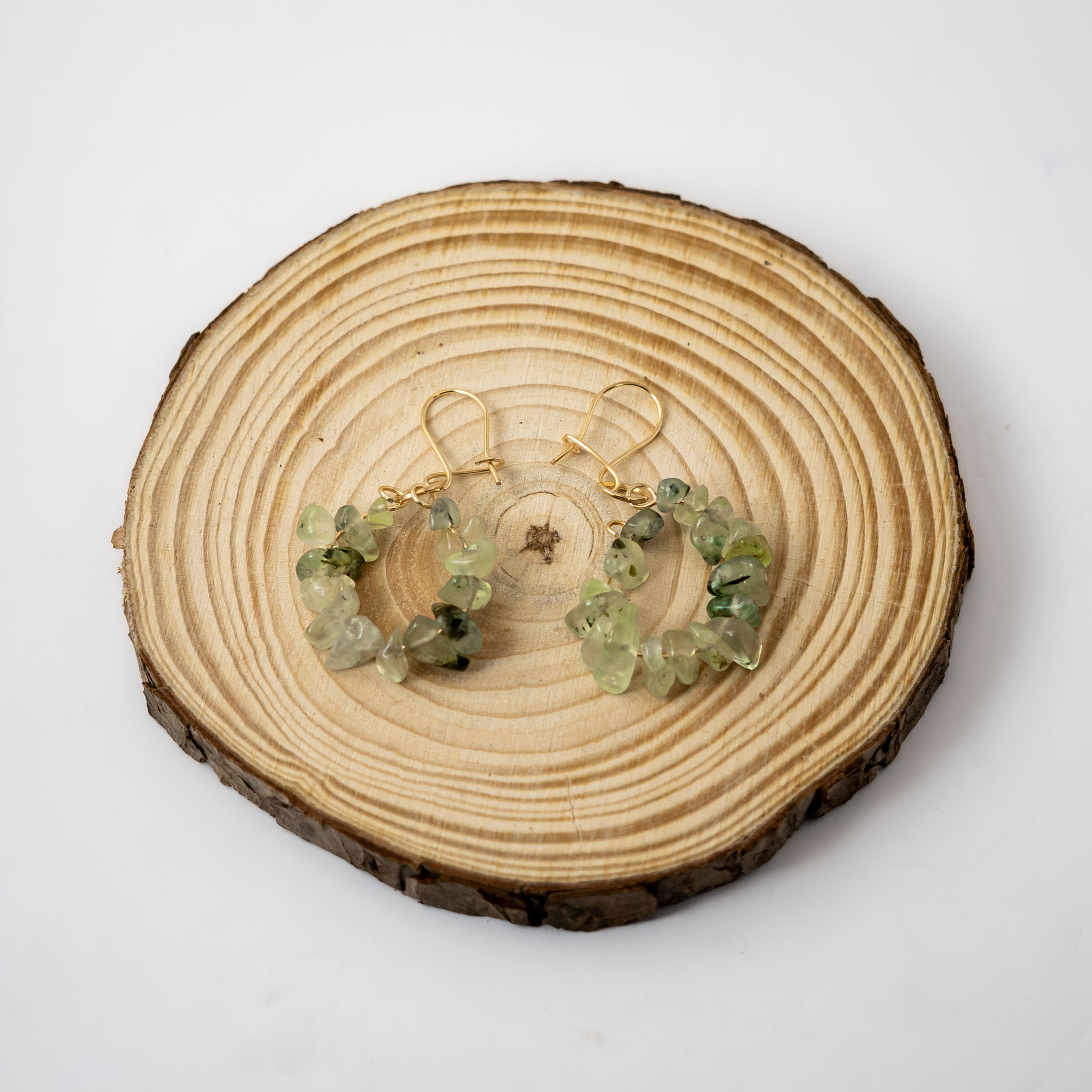 Los Aros Prehnita combinan la suavidad de sus tonos verde claro con la elegancia de los ganchos enchapados en oro. Esta piedra, asociada a la calma y la claridad interior, aporta un aire delicado y armonioso al diseño. Ideales para complementar atuendos neutros o naturales, entregando un toque sutil de color y sofisticación.