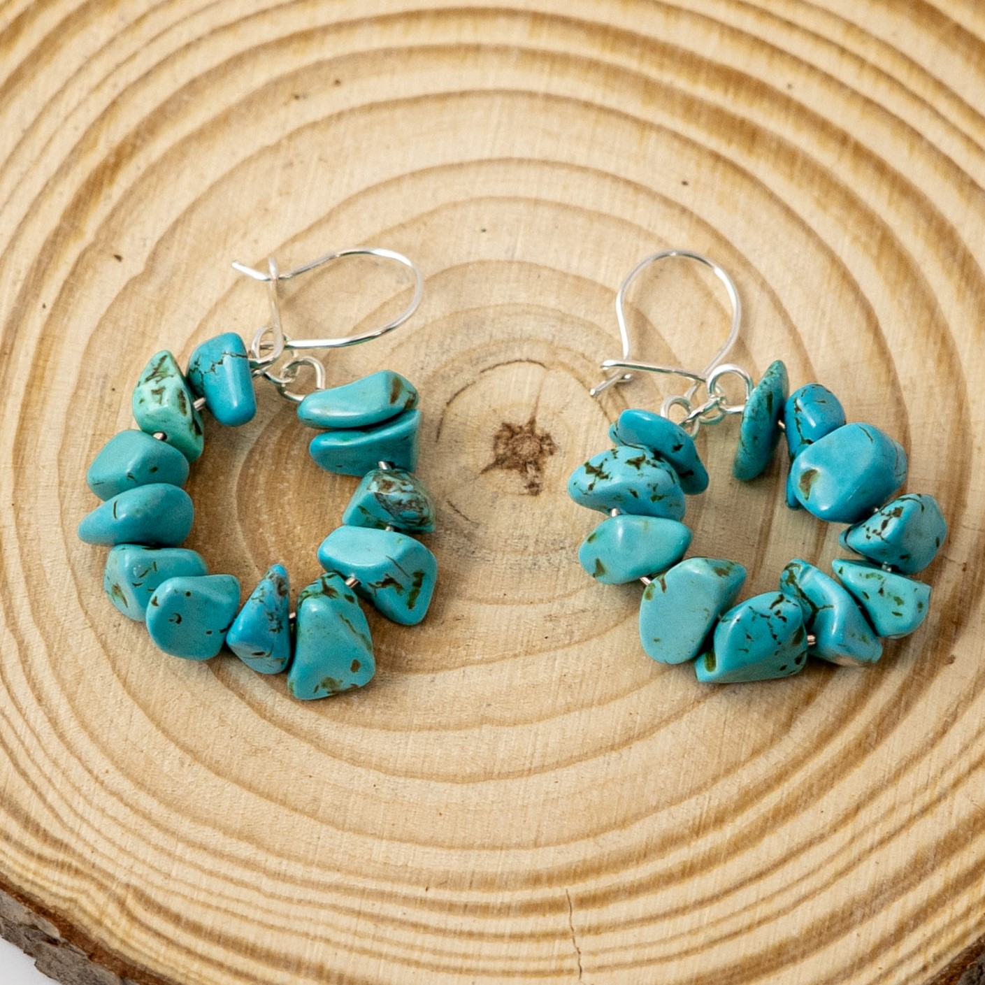 Los Aros Turquesa destacan por la belleza orgánica de sus piedras turquesa, conocidas por sus tonos vibrantes y su energía protectora. Montados con ganchos enchapados en plata, son livianos y cómodos de usar, ideales para acompañar estilos bohemios, casuales o con inspiración natural.