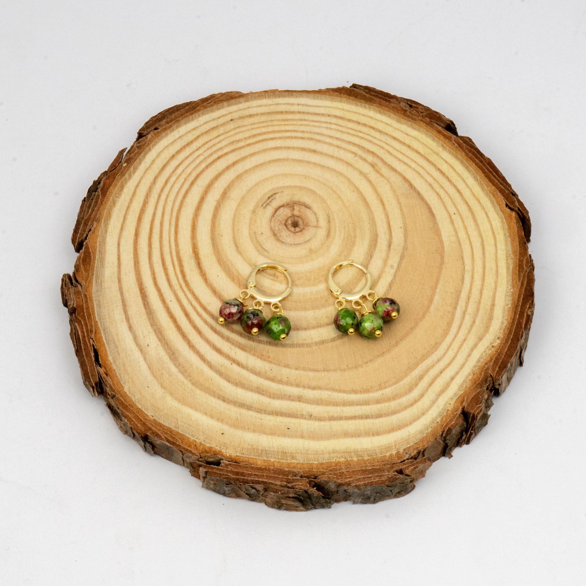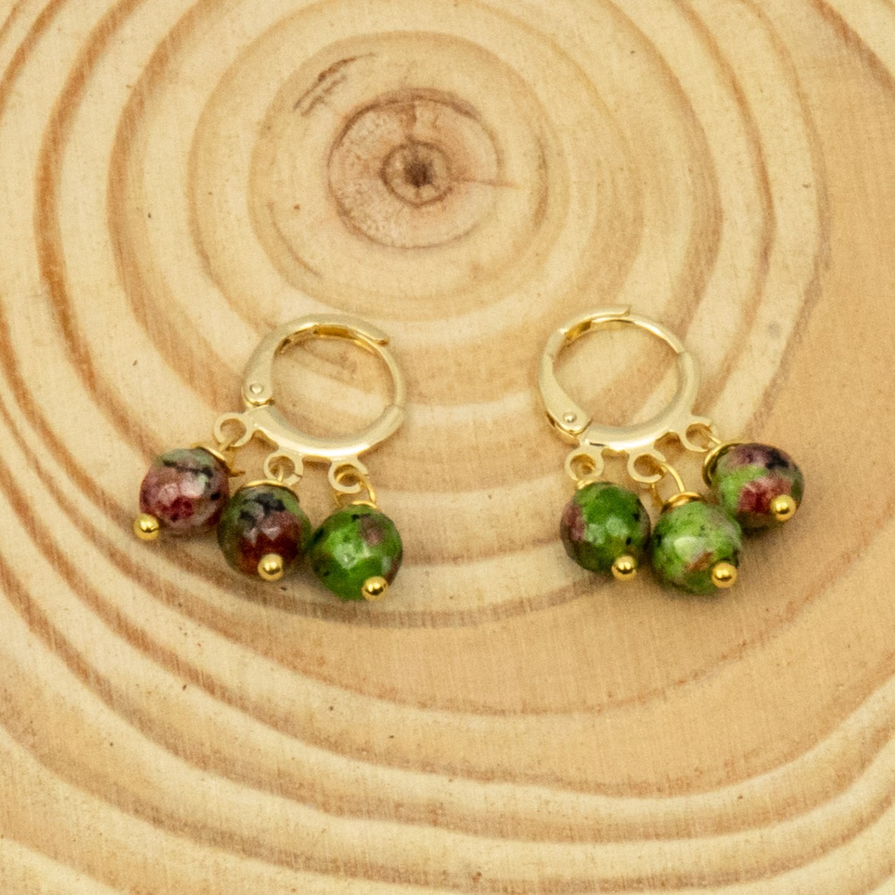 Aros confeccionados con zoicita rubí, con tonos verdes y rojos que contrastan de manera armoniosa, y ganchos enchapados en oro que aportan un acabado elegante y sofisticado, perfectos para destacar con un accesorio artesanal único.