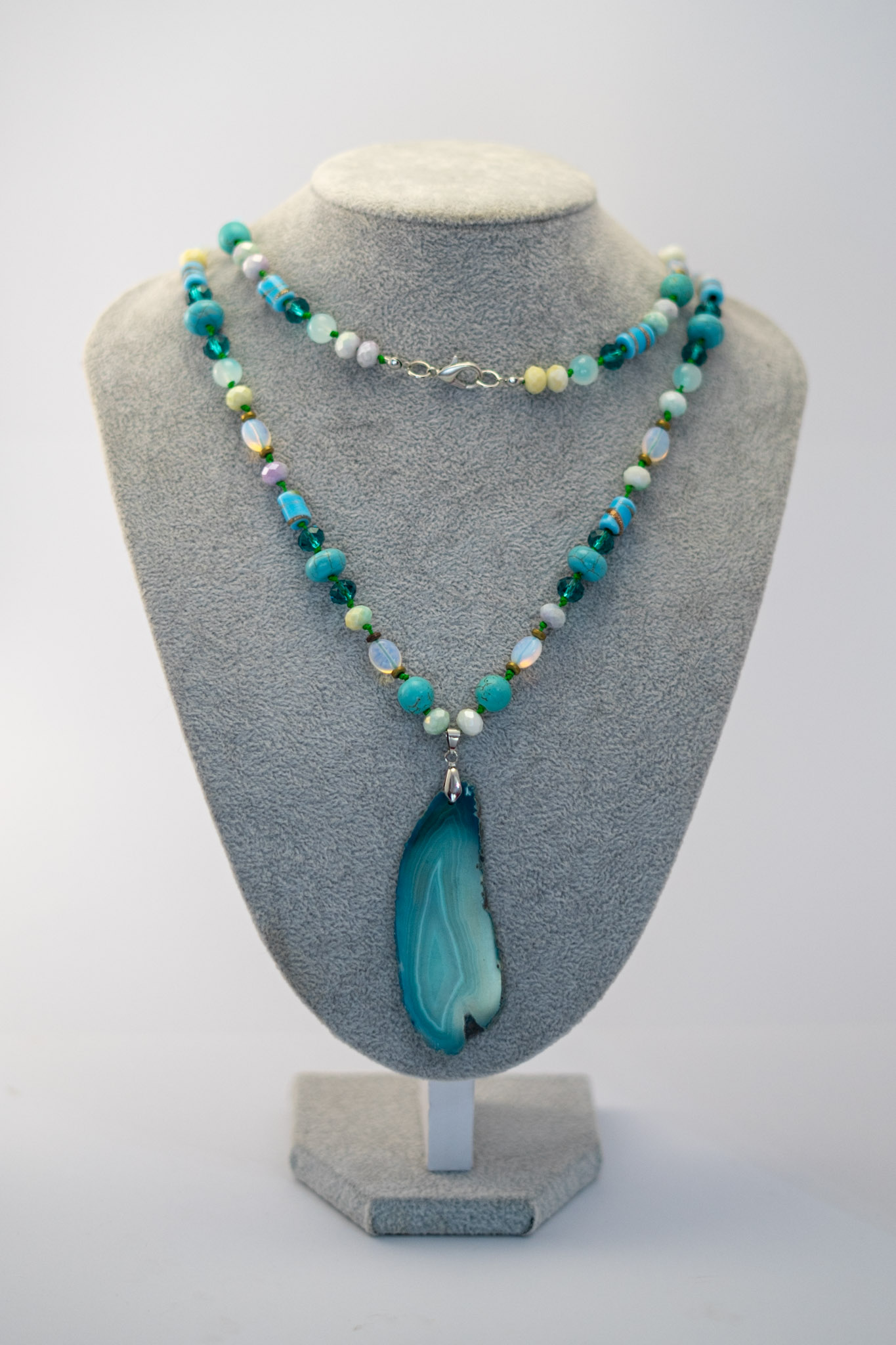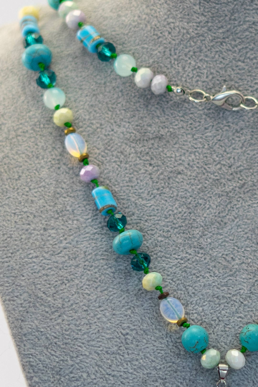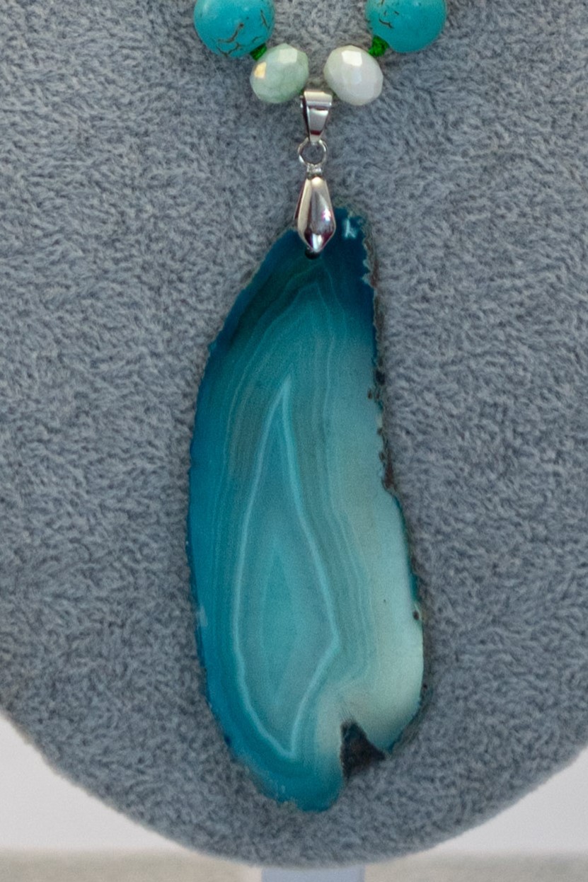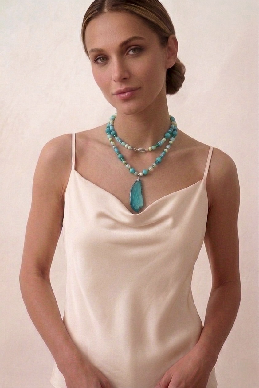 Este collar con dije de ágata turquesa combina armoniosamente piedras turquesa, piedra luna y una selección de cristales en tonos celeste y turquesa, creando un diseño que transmite frescura, calma y claridad.