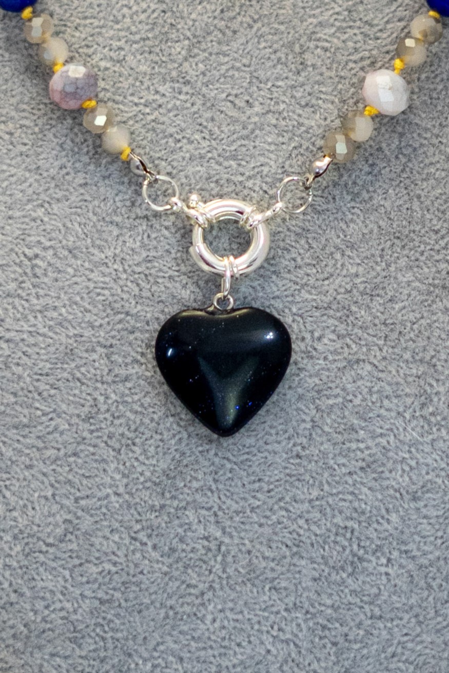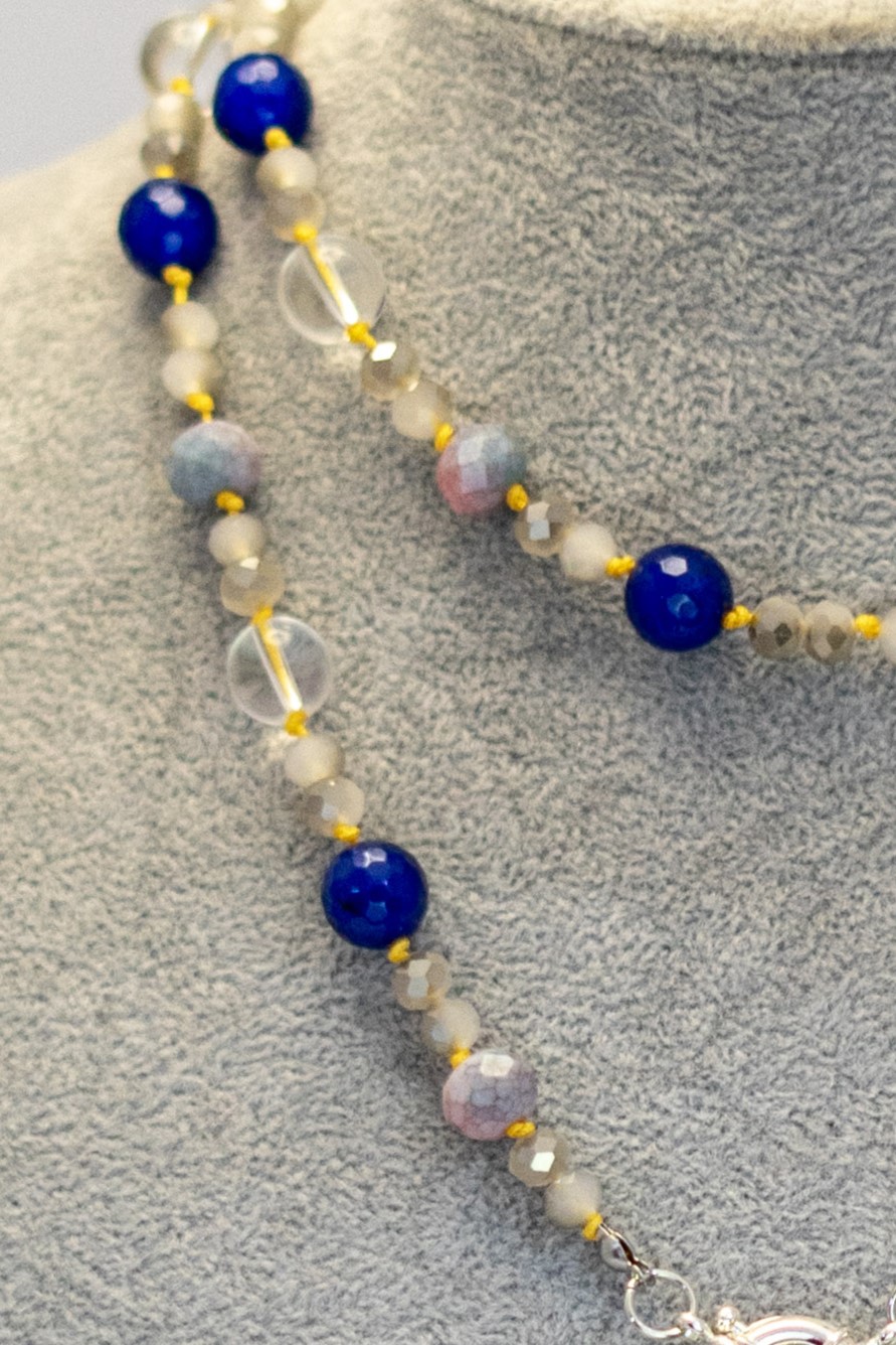 Este collar combina la pureza del cuarzo cristal con la profundidad de las ágatas azules, realzadas por el brillo sutil de cristales matizados que evocan destellos de una noche estrellada. El diseño se completa con un broche enchapado en plata, aportando un acabado elegante y resistente. Una pieza delicada y sofisticada que refleja calma y armonía, ideal para quienes buscan un accesorio que inspire serenidad y destaque con luz propia.