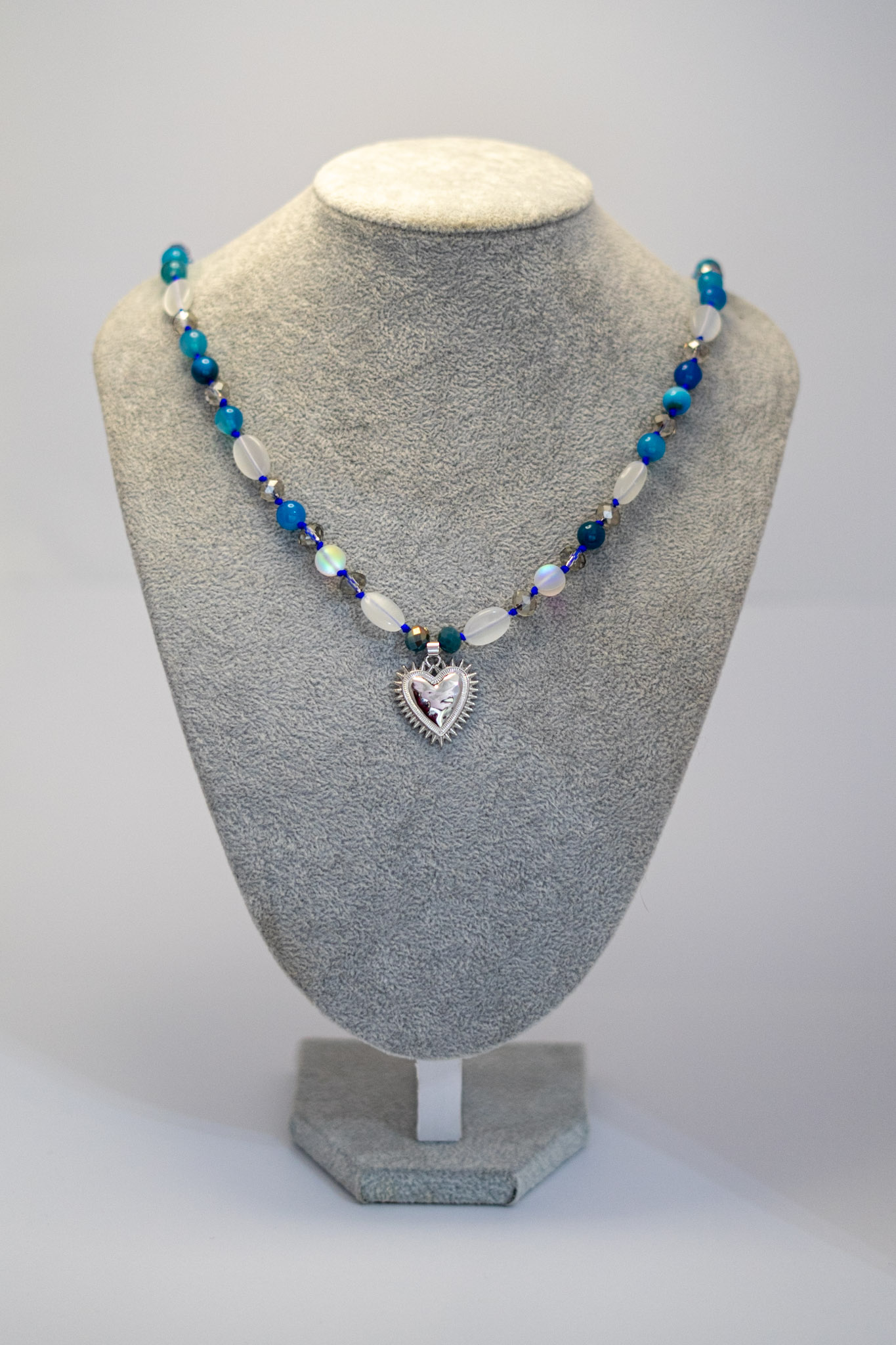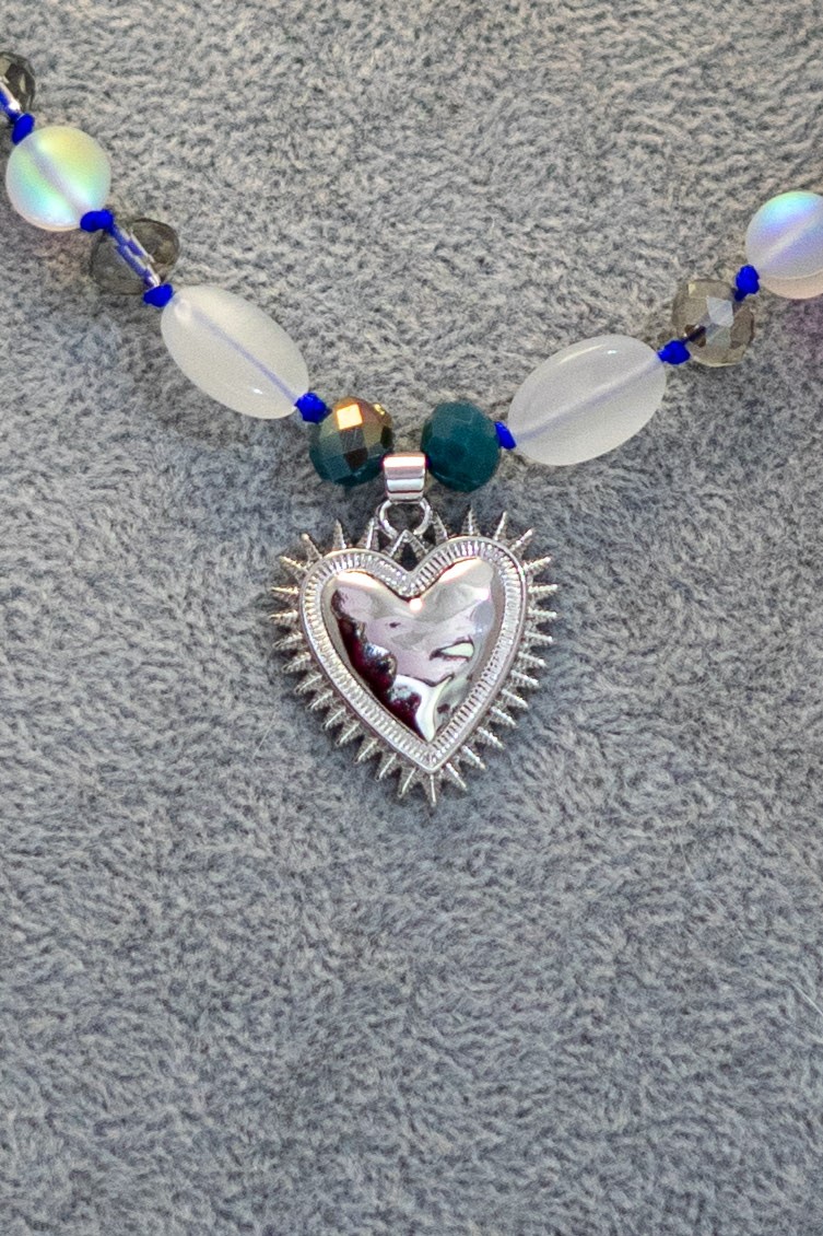 Un diseño fresco y luminoso que combina la serenidad del cuarzo sirena con la profundidad de las ágatas azules, piedras asociadas a la calma y la confianza. Sus delicados cristales aportan destellos sutiles que realzan la elegancia de la pieza. En el centro, un dije en forma de corazón enchapado en plata simboliza amor y conexión, convirtiendo este collar en un accesorio versátil y significativo, ideal para realzar cualquier estilo con un aire de suavidad y equilibrio.