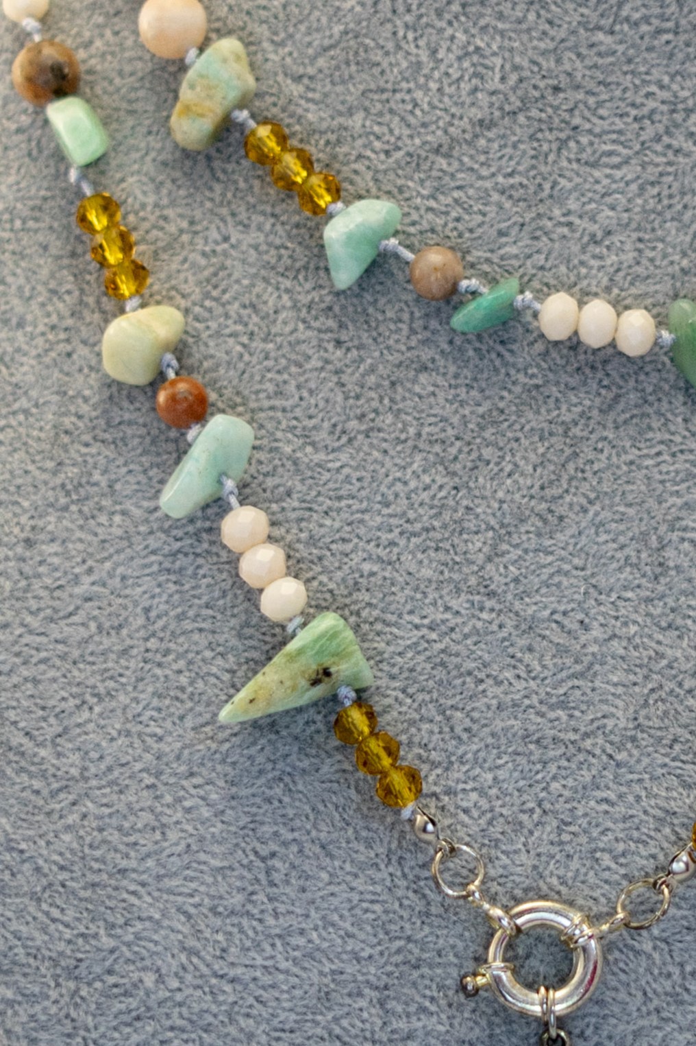 El Collar Amazonita Celeste es una pieza que transmite frescura y calma. Su diseño combina amazonita en tonos celestes con jaspe y una selección de cristales en blancos y amarillos, logrando una armonía sutil y luminosa.