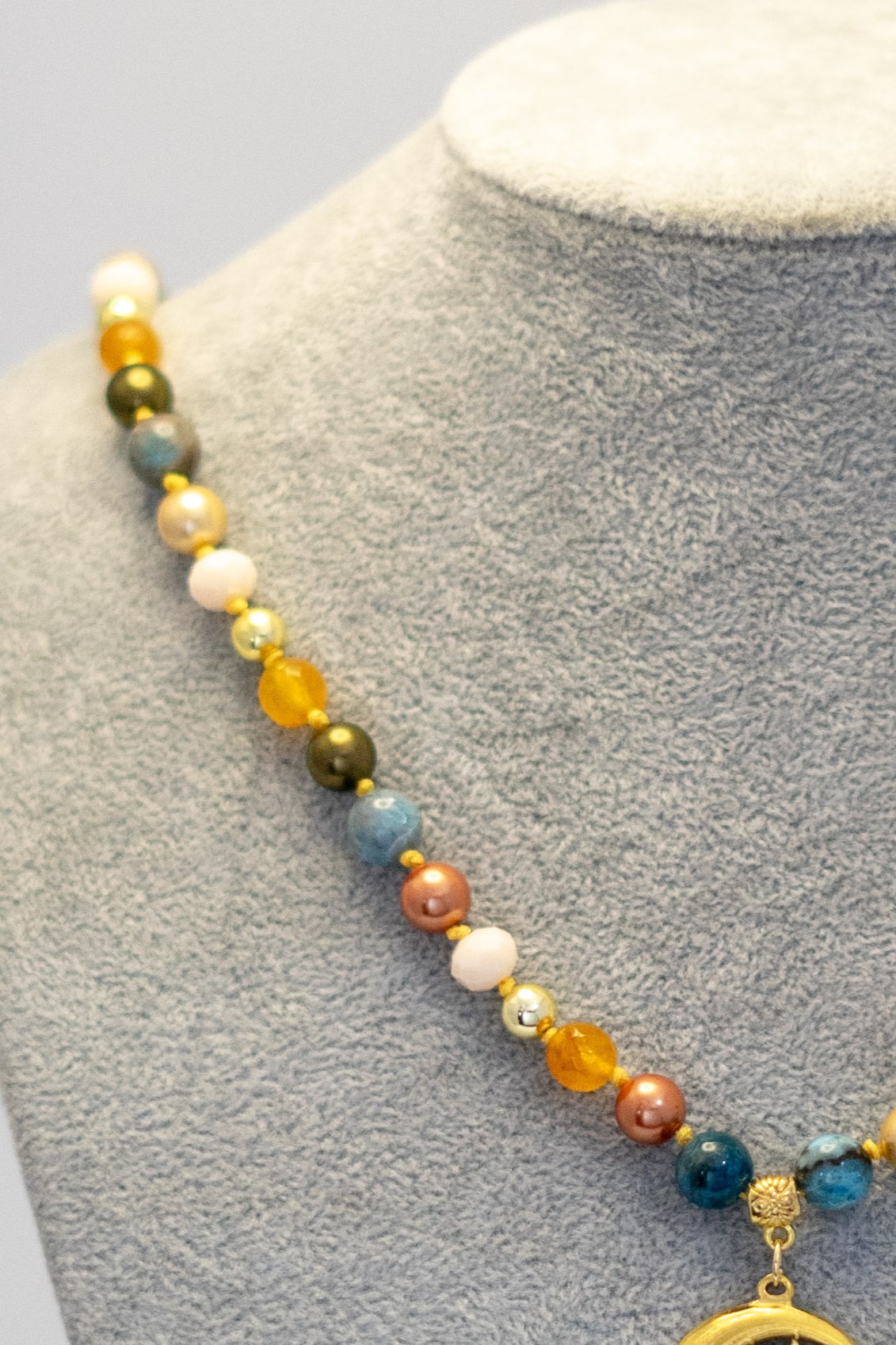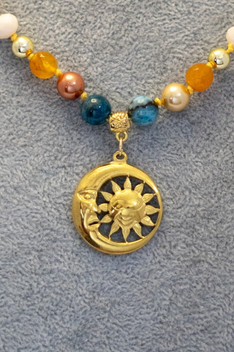 Collar elaborado con piedras de apatita, perlas shell, ágatas amarillas y cristales brillantes, complementado con un dije de luna y sol en tono dorado. El broche y los separadores están enchapados en oro, aportando un acabado elegante y luminoso. Ideal para realzar cualquier look con un toque único y sofisticado.
