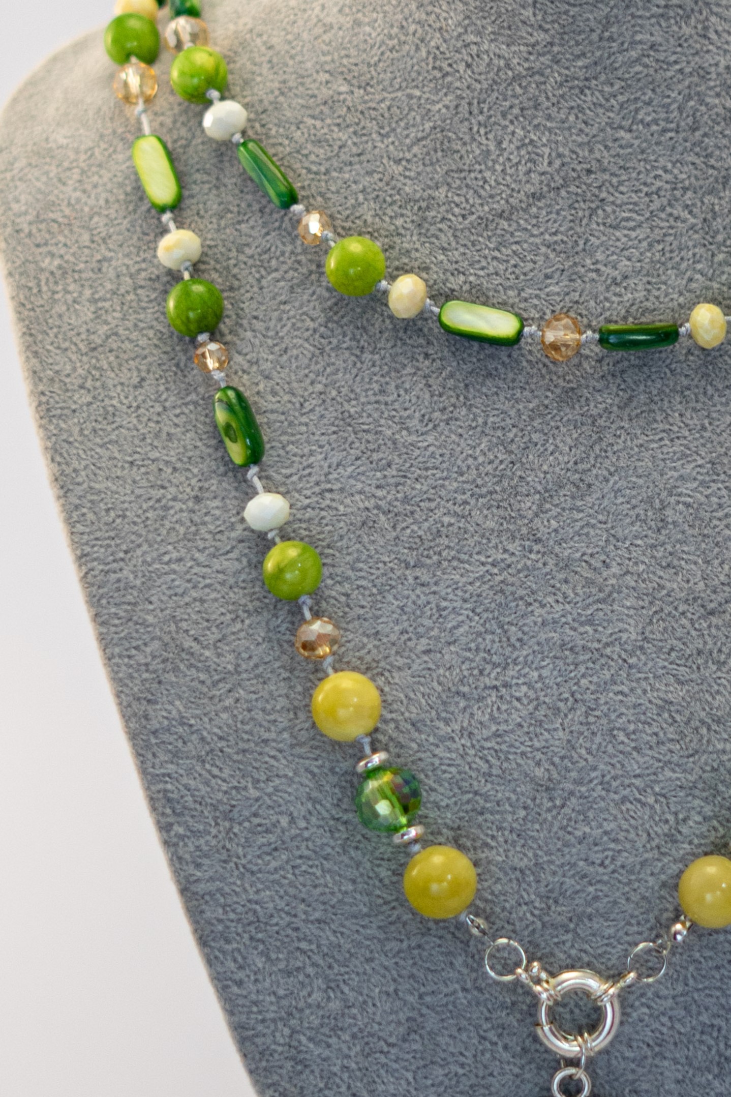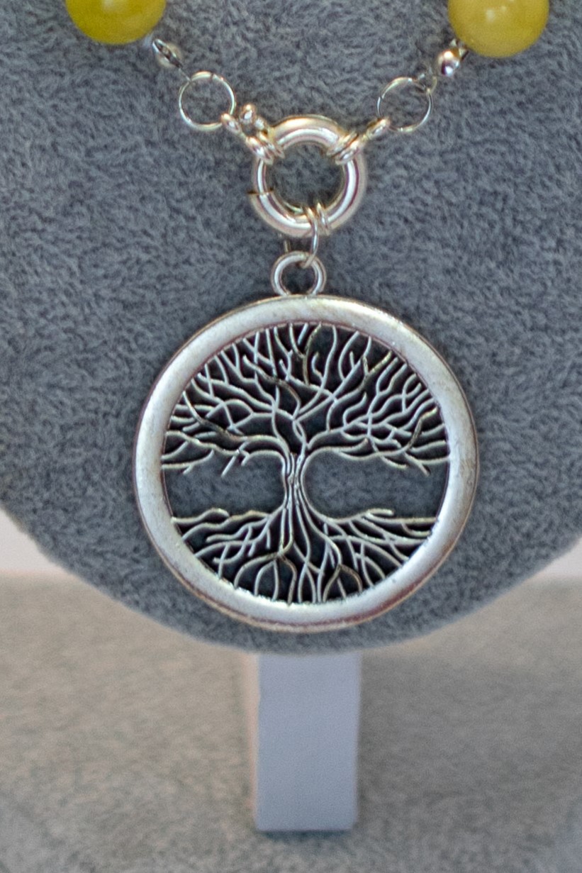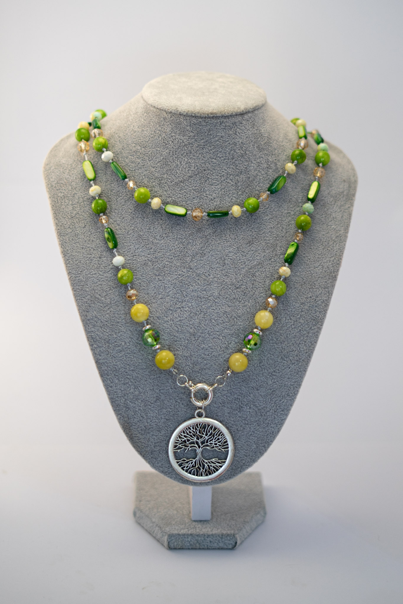 El Collar Árbol Verde es una pieza que simboliza crecimiento y conexión con la naturaleza. Su dije de árbol de la vida en filigrana plateada se combina con ónix, nácar y cristales en variados tonos verdes, creando un diseño equilibrado y lleno de energía positiva.