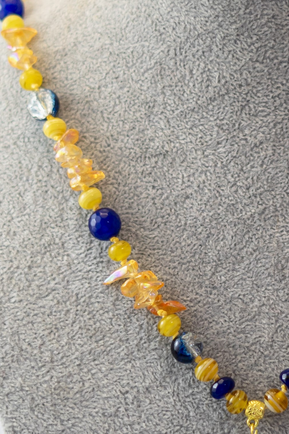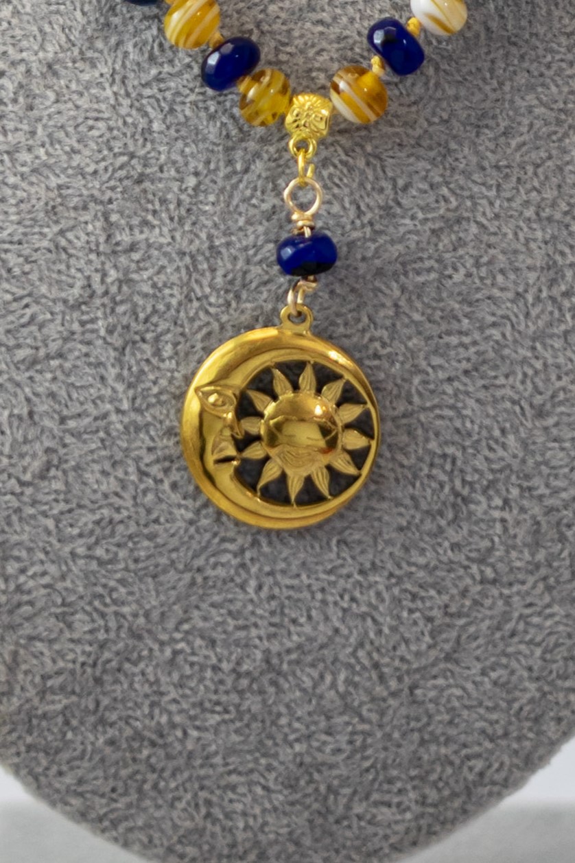 El Collar Caramelo Azul es una fusión de calidez y frescura, destacando por su dije de luna y sol dorado en acero quirúrgico, símbolo de equilibrio y energía. La pieza combina chips de cristal color caramelo con la profundidad serena de las ágatas azules y el detalle único de una ágata rondel azul.