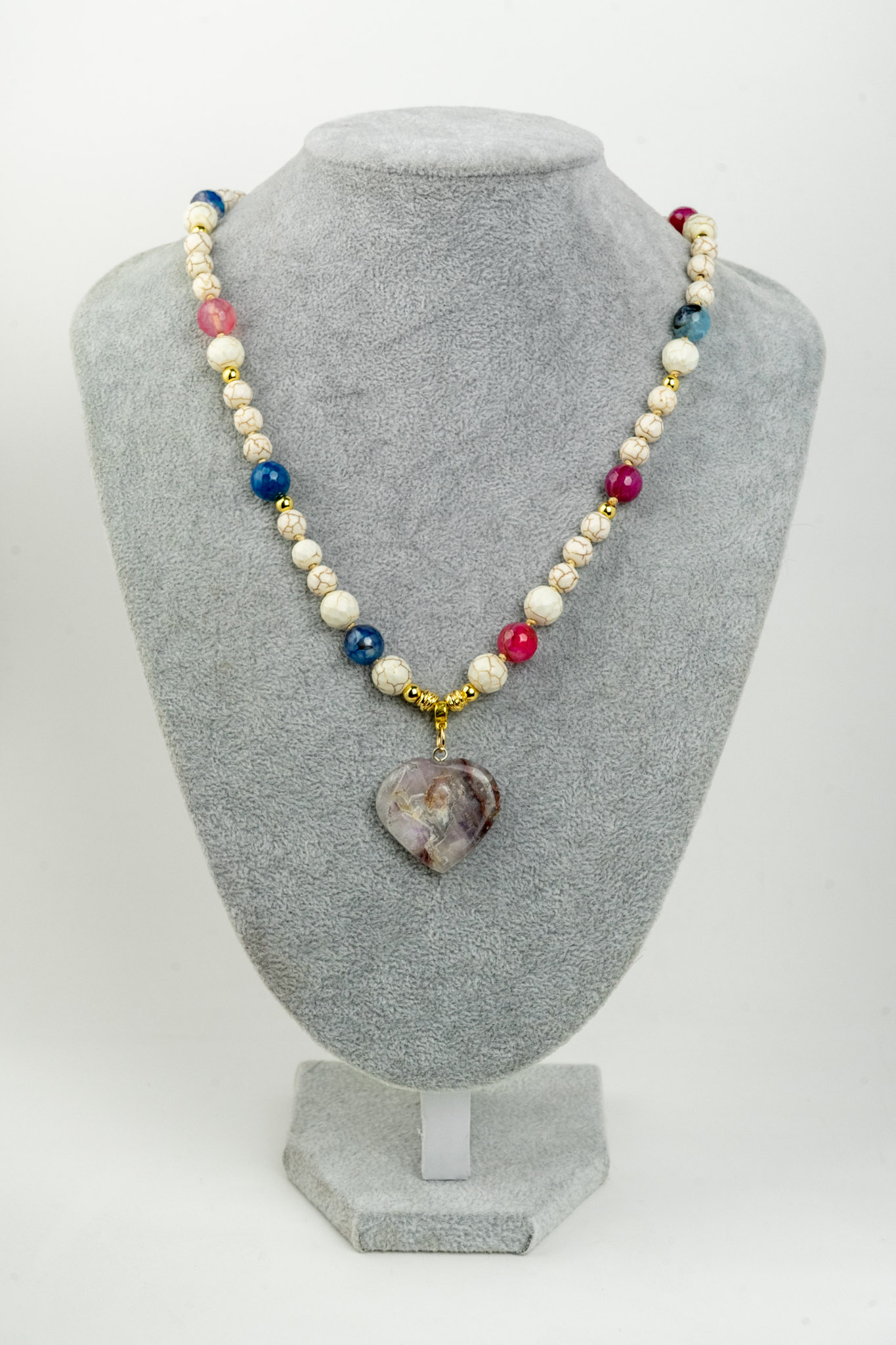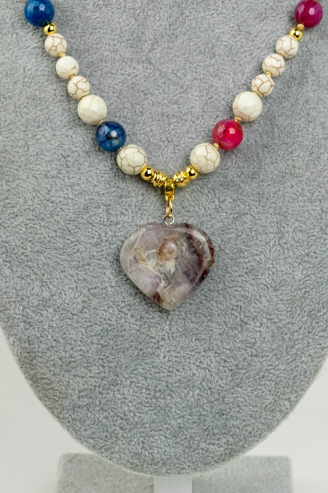 Este delicado collar presenta un hermoso corazón de amatista, piedra asociada a la calma y la armonía. Se complementa con howlita blanca y un sutil mix de ágatas de colores, creando un contraste equilibrado y lleno de estilo. Sus separadores y broche enchapados en oro aportan un acabado elegante y seguro, ideal para realzar cualquier look con un toque especial.