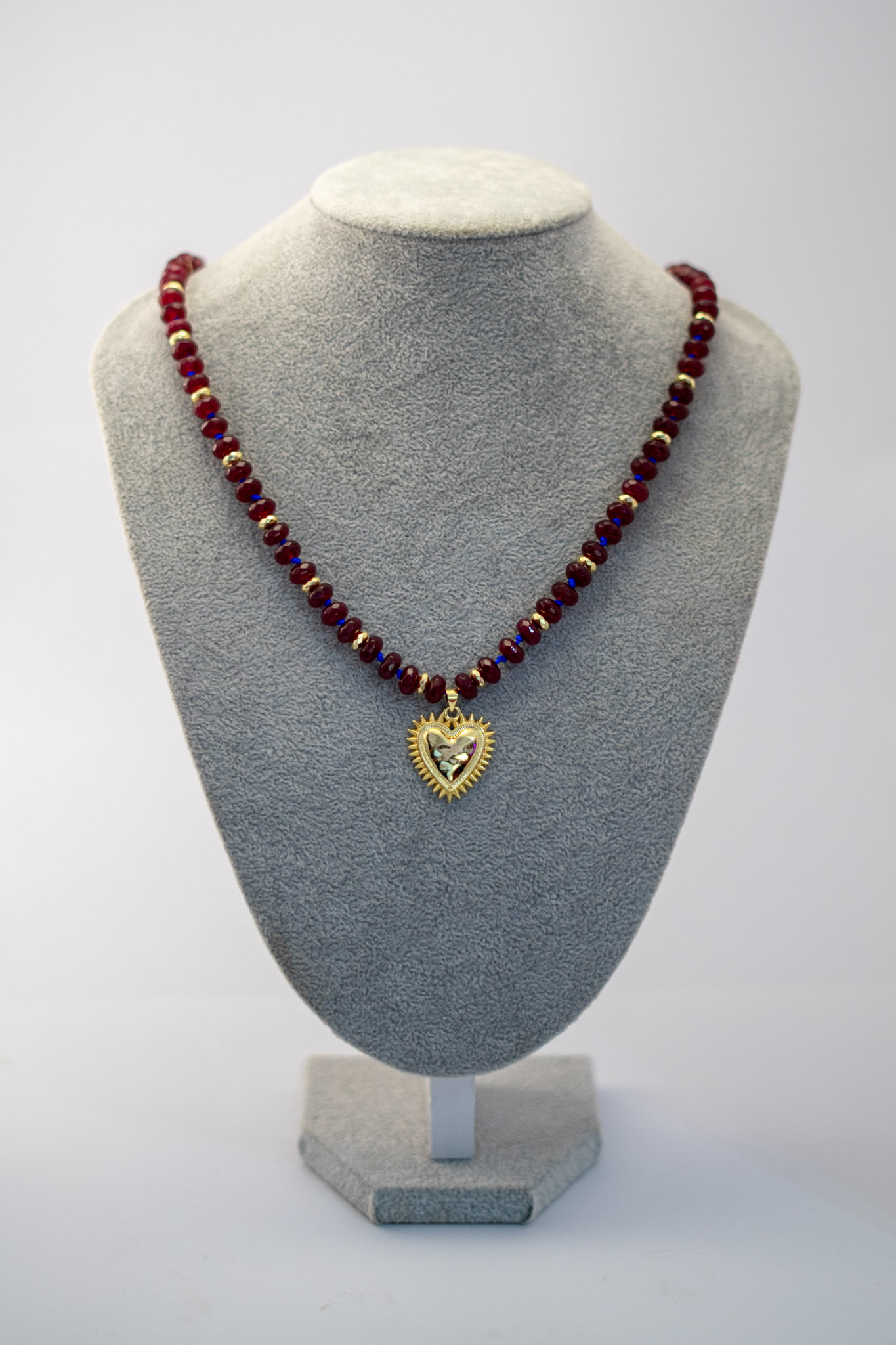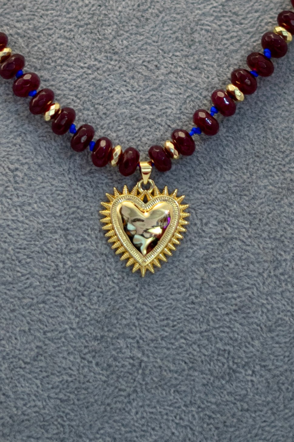 Collar con dije de corazón enchapado en oro, una pieza elegante y femenina que equilibra calidez y sofisticación. El diseño incorpora piedras de ágata rondell en tono burdeos, que aportan profundidad y riqueza cromática, junto a detalles metálicos de hematita que realzan el brillo del conjunto. El toque final lo da un broche enchapado en oro, que asegura un cierre seguro y armonioso con el resto de los elementos. Ideal para ocasiones especiales o para elevar tu estilo cotidiano con una joya delicada y significativa.