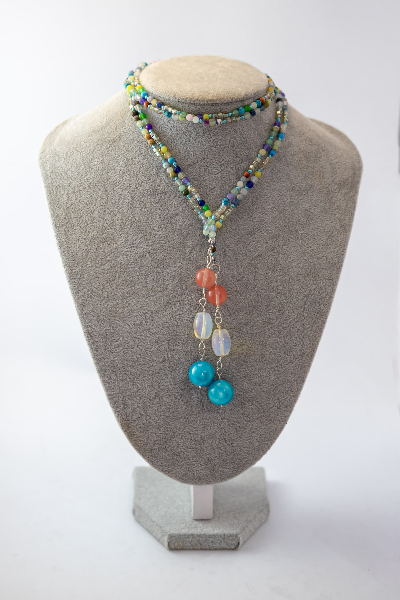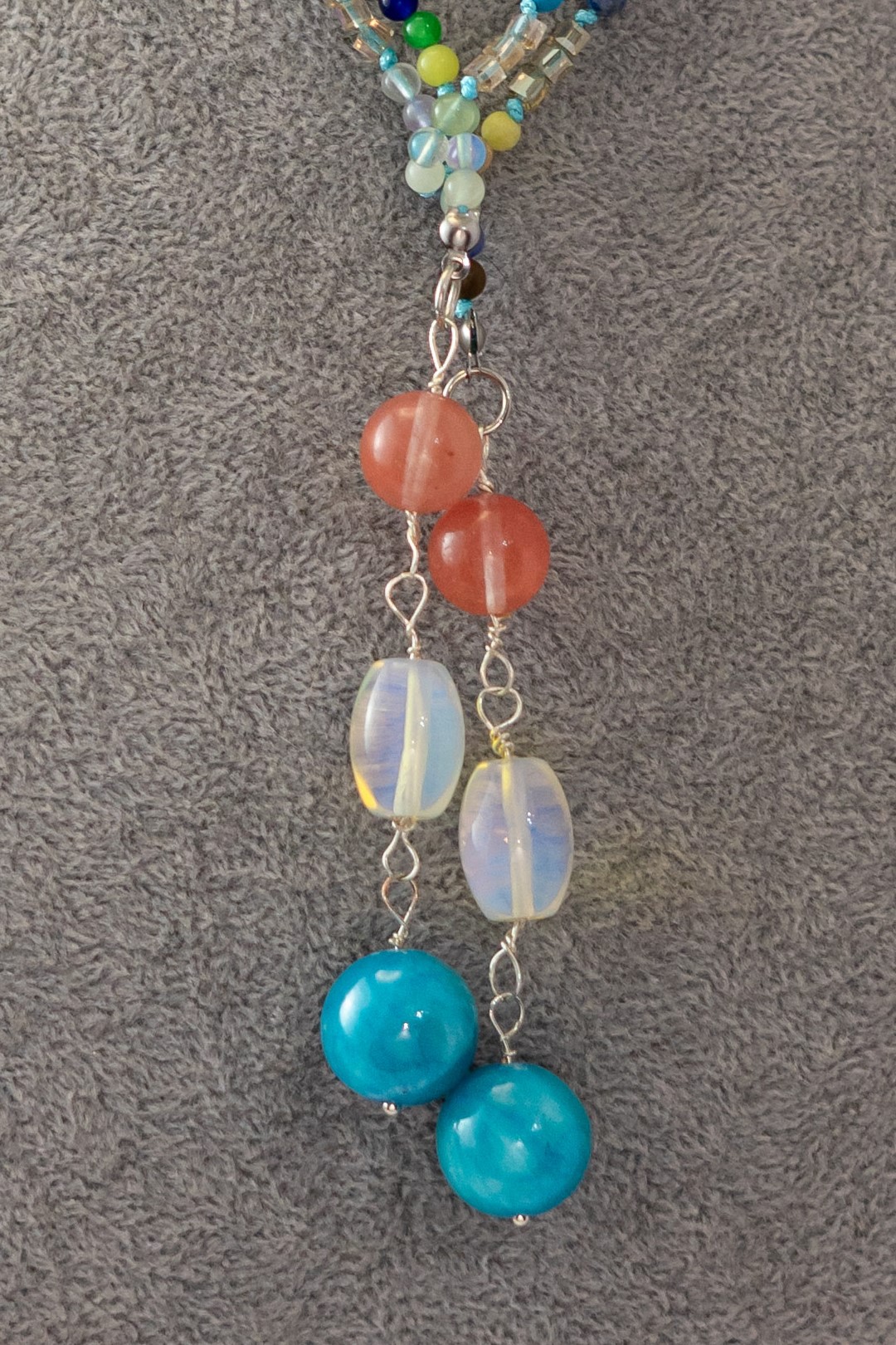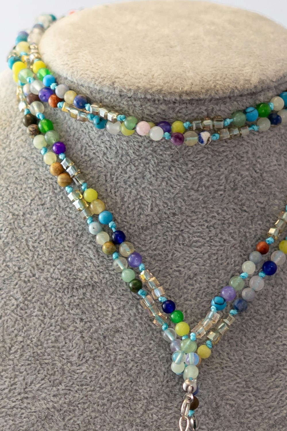 El Collar Corbata Mini Piedras es una joya delicada y armoniosa que destaca por su sutil caída y mezcla de colores suaves. Está elaborado con un mix de mini piedras naturales, incluyendo ónix celeste, que aporta calma y claridad; piedra luna, símbolo de intuición y feminidad; y cuarzo cherry, que entrega una nota cálida y amorosa.