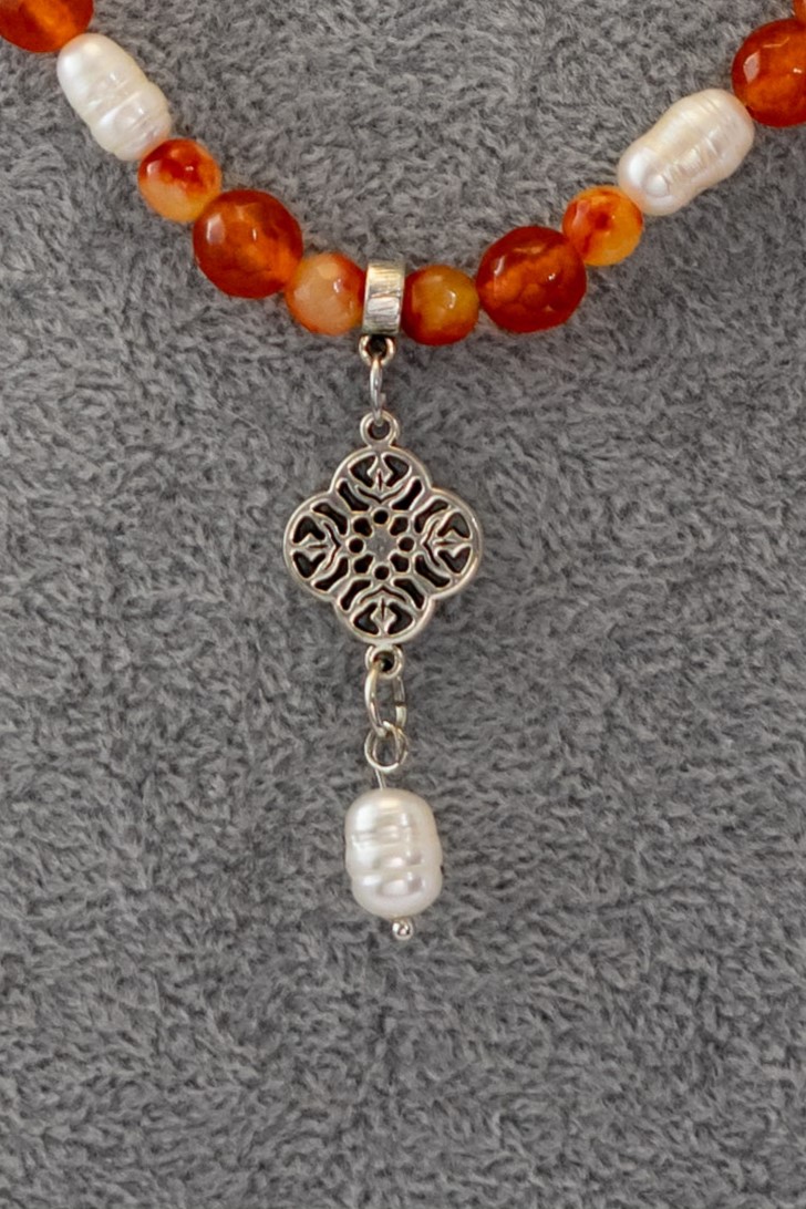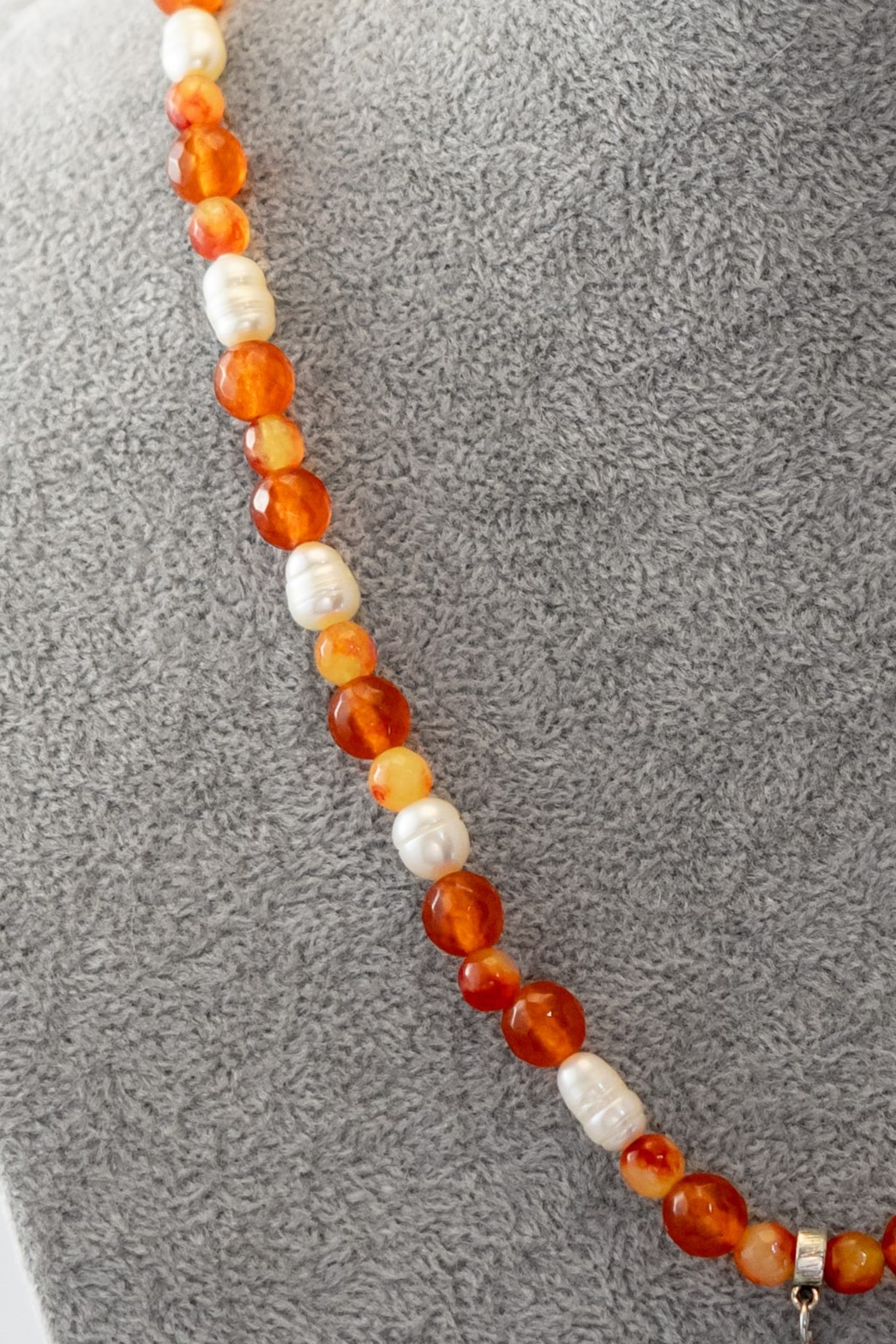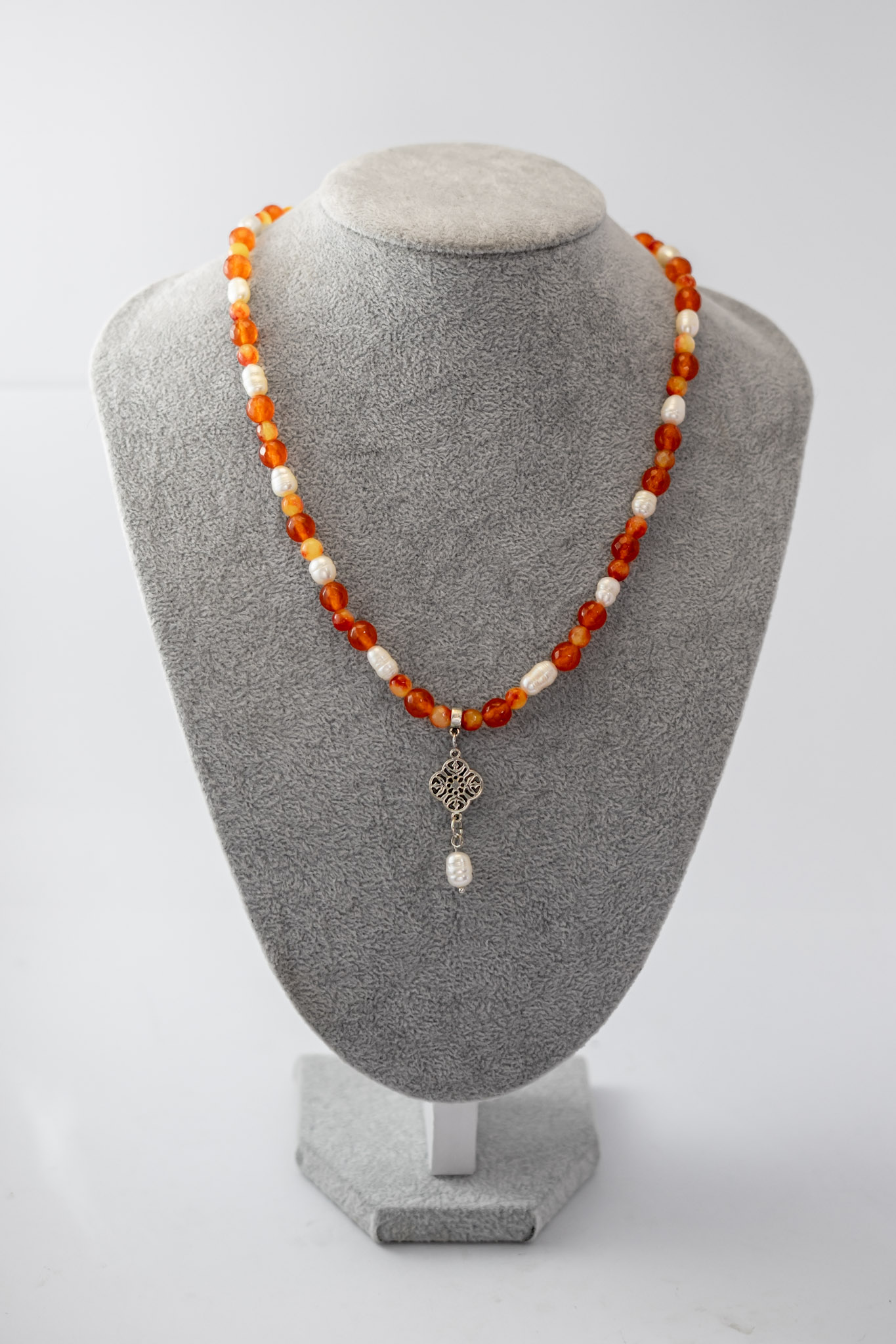 El Collar Cornalina Río destaca por su diseño equilibrado y su estilo atemporal. Está confeccionado con ágata cornalina, una piedra de tonos anaranjados que transmite vitalidad y calidez, complementada con perlas de río, que aportan un toque de elegancia y frescura natural.