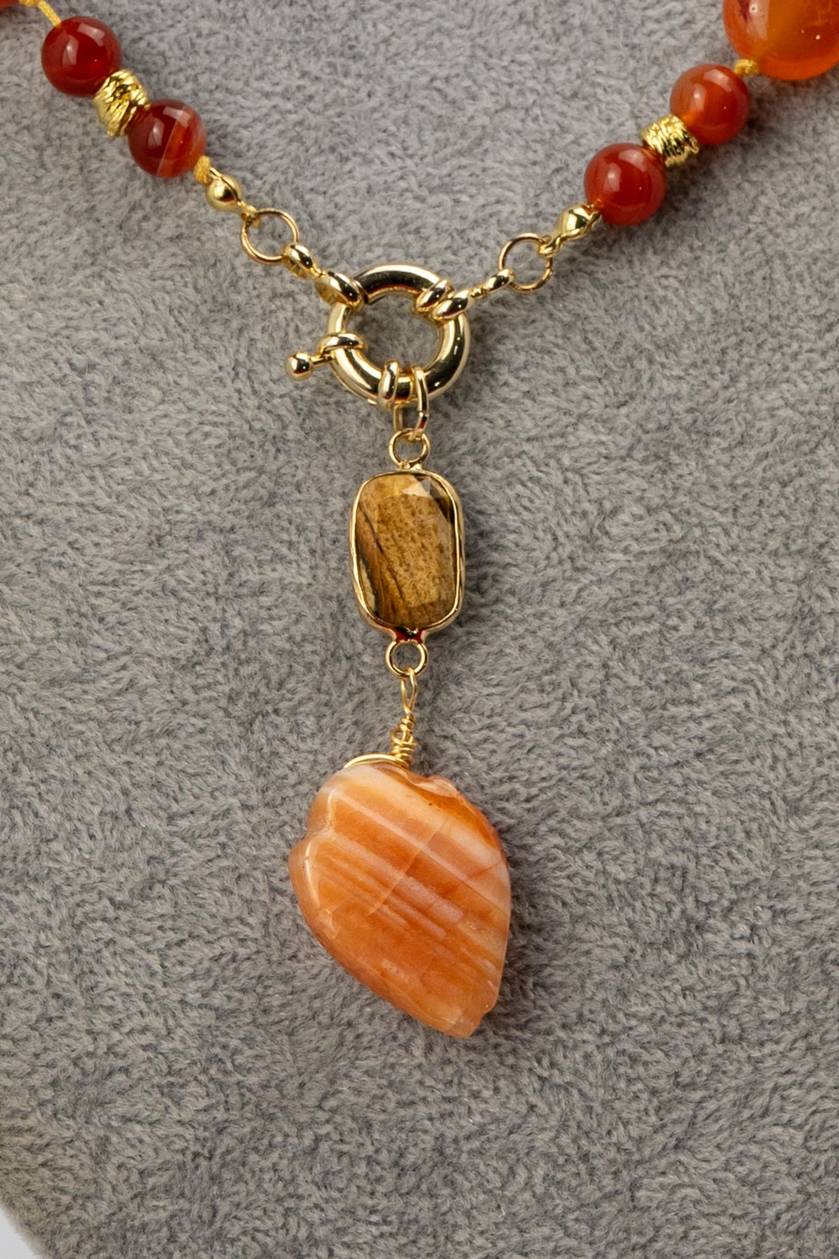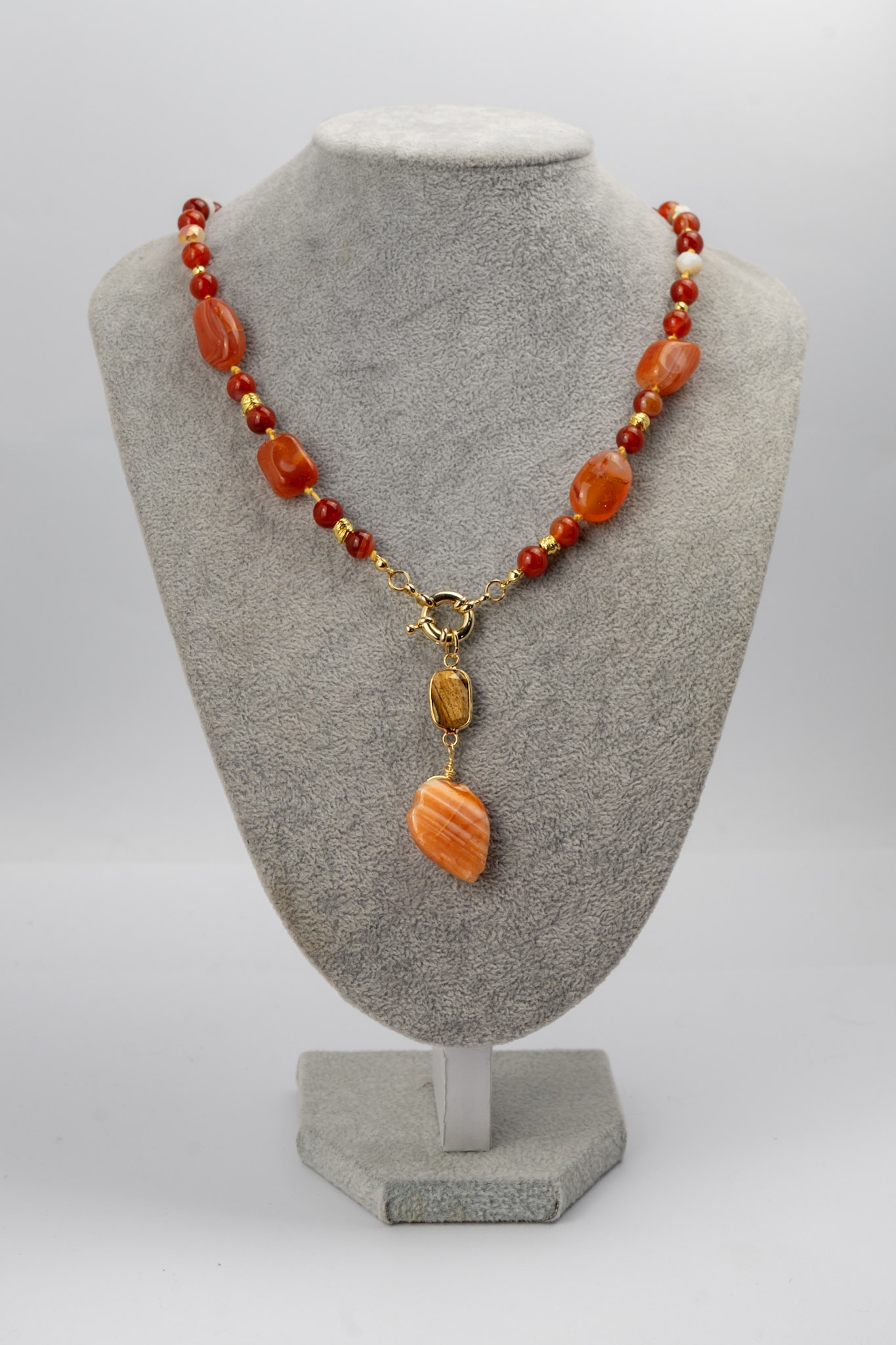 Collar artesanal que combina la energía y calidez de la ágata cornalina con el brillo delicado de cristales, creando un diseño vibrante y elegante. Los broche y separadores enchapados en oro aportan un acabado sofisticado y duradero. Una pieza versátil, ideal para realzar cualquier look con un toque de color y estilo.