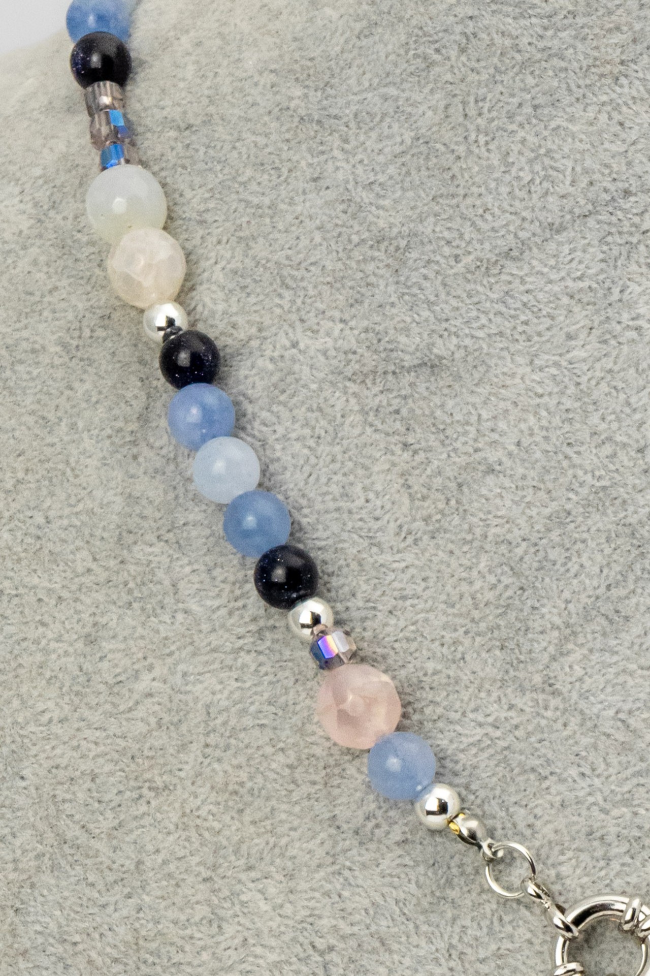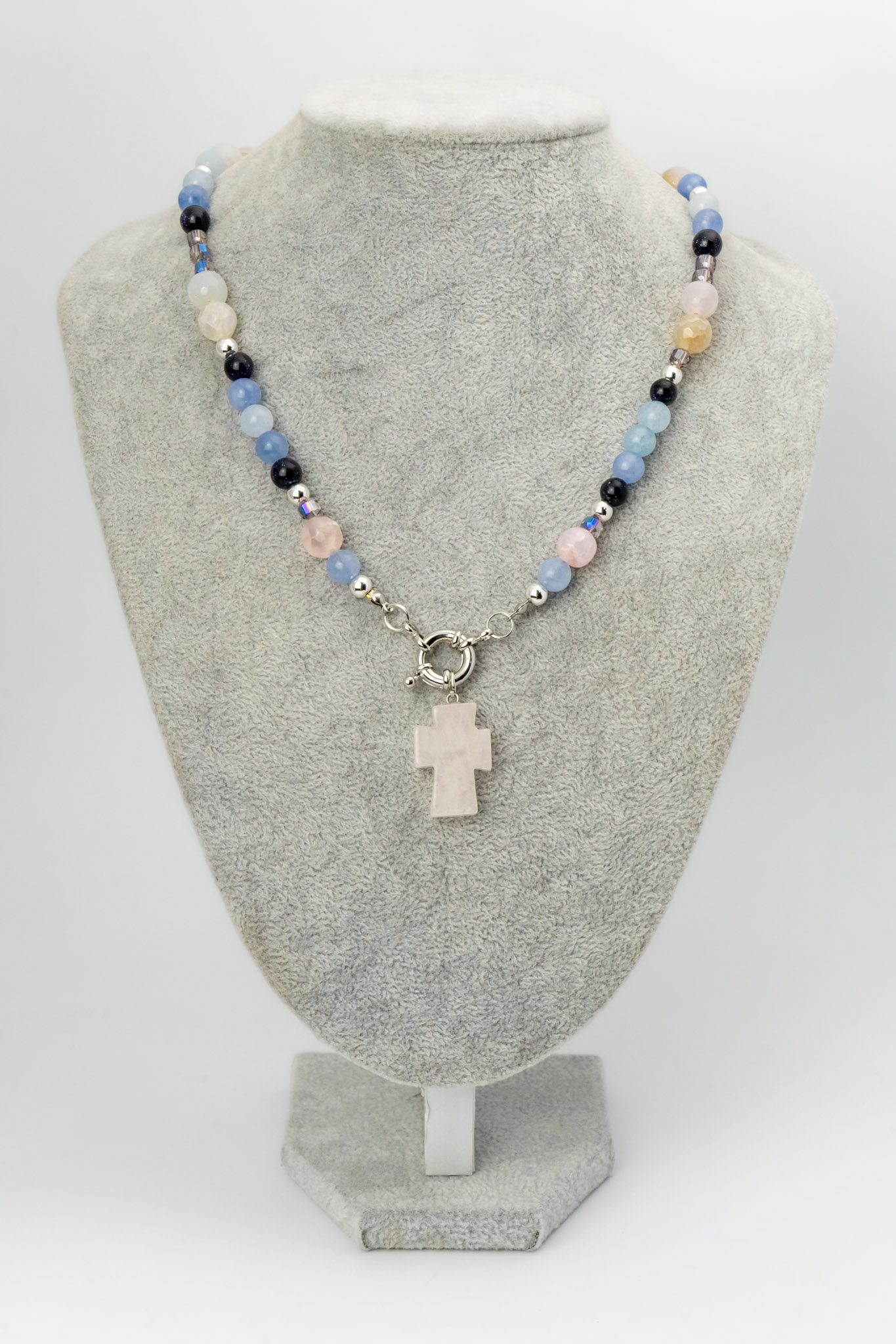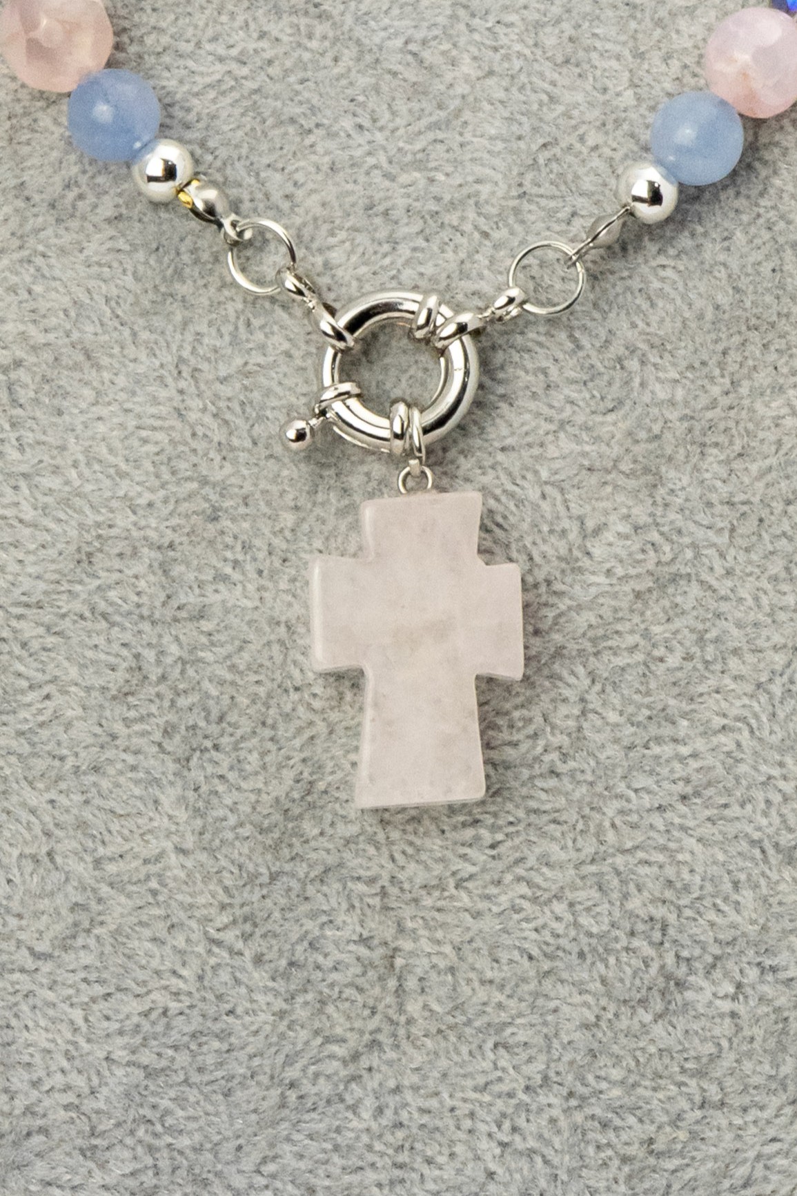 Una joya delicada y amorosa que une una cruz tallada en cuarzo rosa con ágatas translúcidas, acuamarina y cristales. Cada piedra refleja armonía y ternura. Los separadores y broche enchapados en plata completan el diseño, ideal para quienes buscan transmitir calma, amor y serenidad.