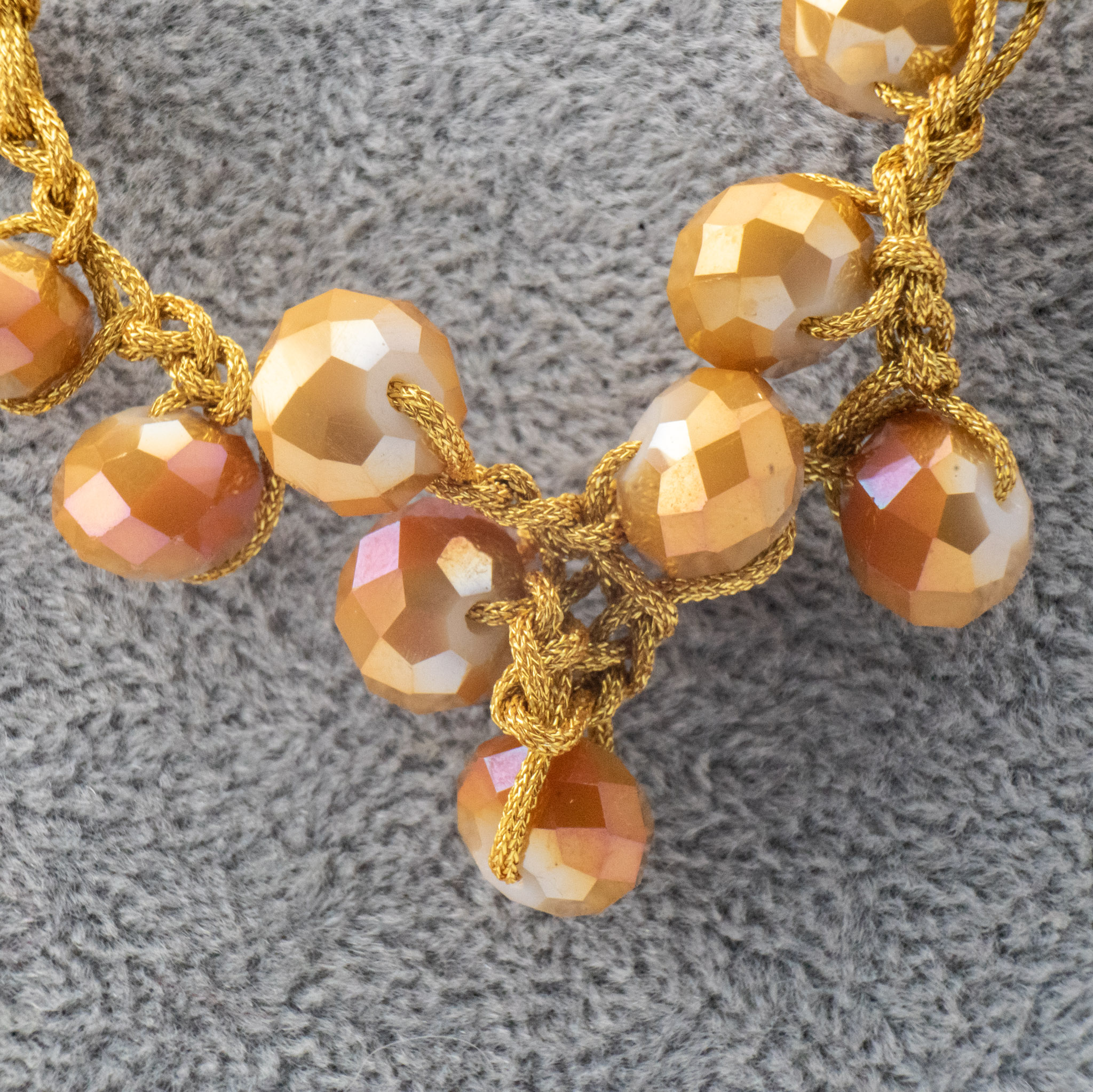 | Materiales Cuentas | Collar tejido a crochet en hilo dorado con cristales en tonos dorados. |