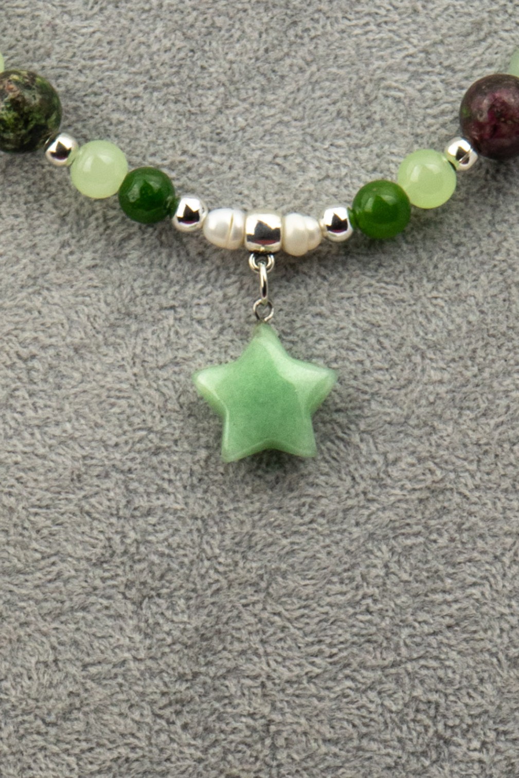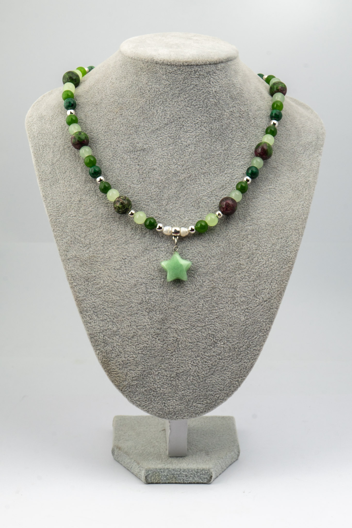 Collar Tierra Jaspe elaborado con ágatas en tonos café y delicados cristales, complementado con un dije en forma de estrella de jade que aporta un toque distintivo y elegante. Los separadores y broche enchapados en oro ofrecen un acabado sofisticado, creando una pieza artesanal ideal para realzar looks naturales con estilo y personalidad.