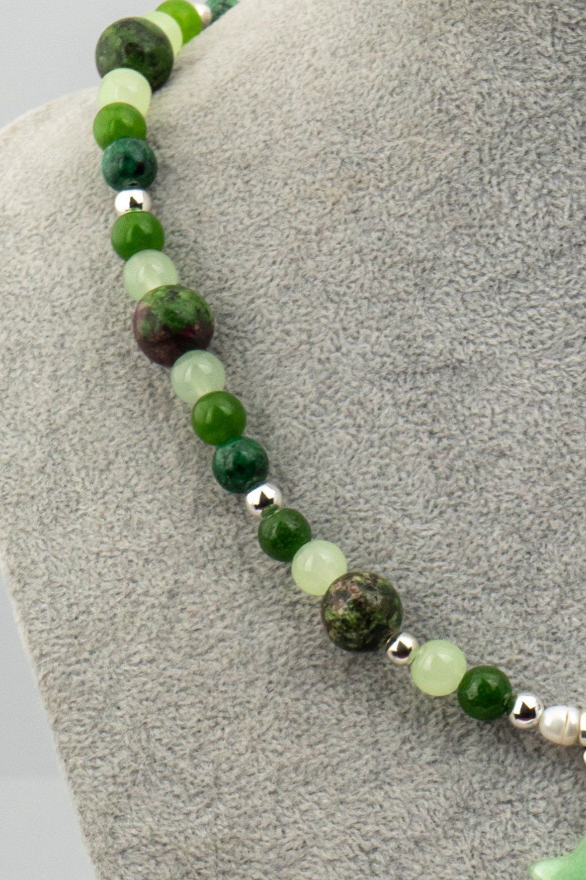 | Cuentas | Zoicita rubí con perlas de río y cristales. Separadores y broche enchapados en plata |