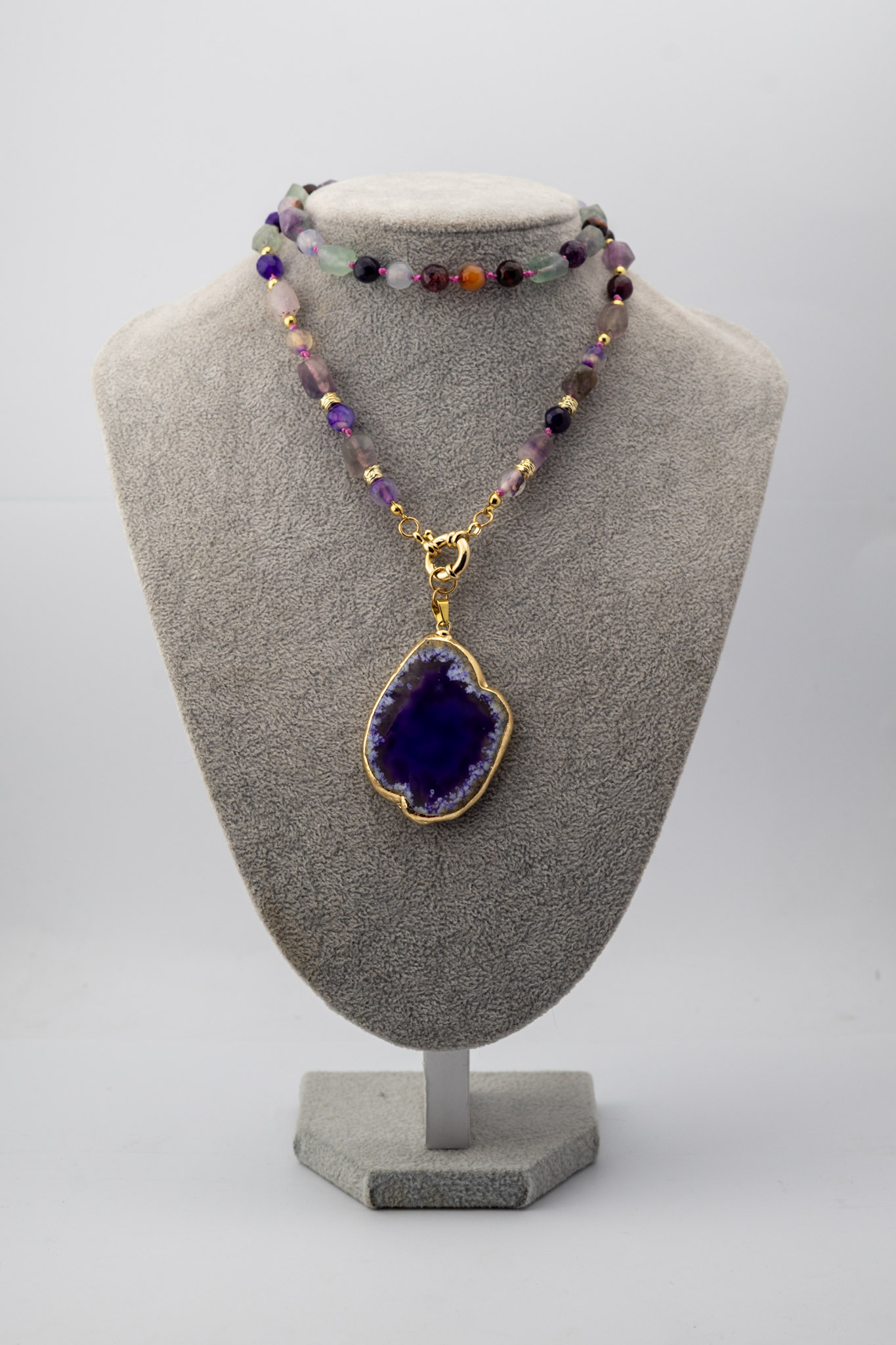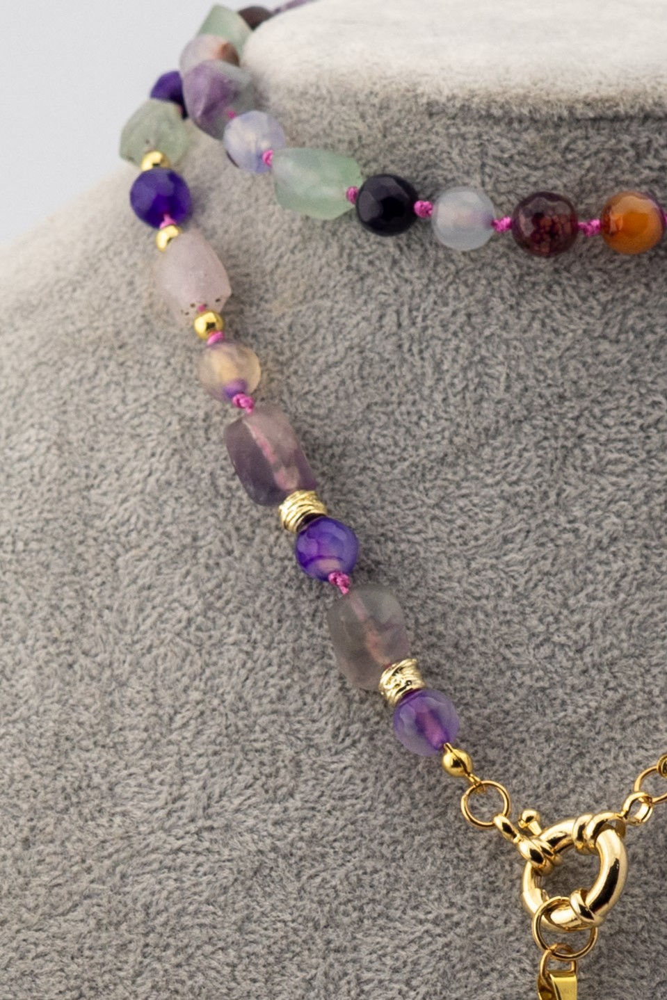 Este collar artesanal destaca por la belleza única de la fluorita, piedra reconocida por sus matices translúcidos y vibrantes, combinada con la elegancia de las ágatas moradas. Cada cuenta está cuidadosamente unida con un broche y separadores enchapados en oro, otorgando un acabado delicado y sofisticado. Una joya única y versátil, ideal para realzar tu estilo o como un regalo especial cargado de color y distinción.