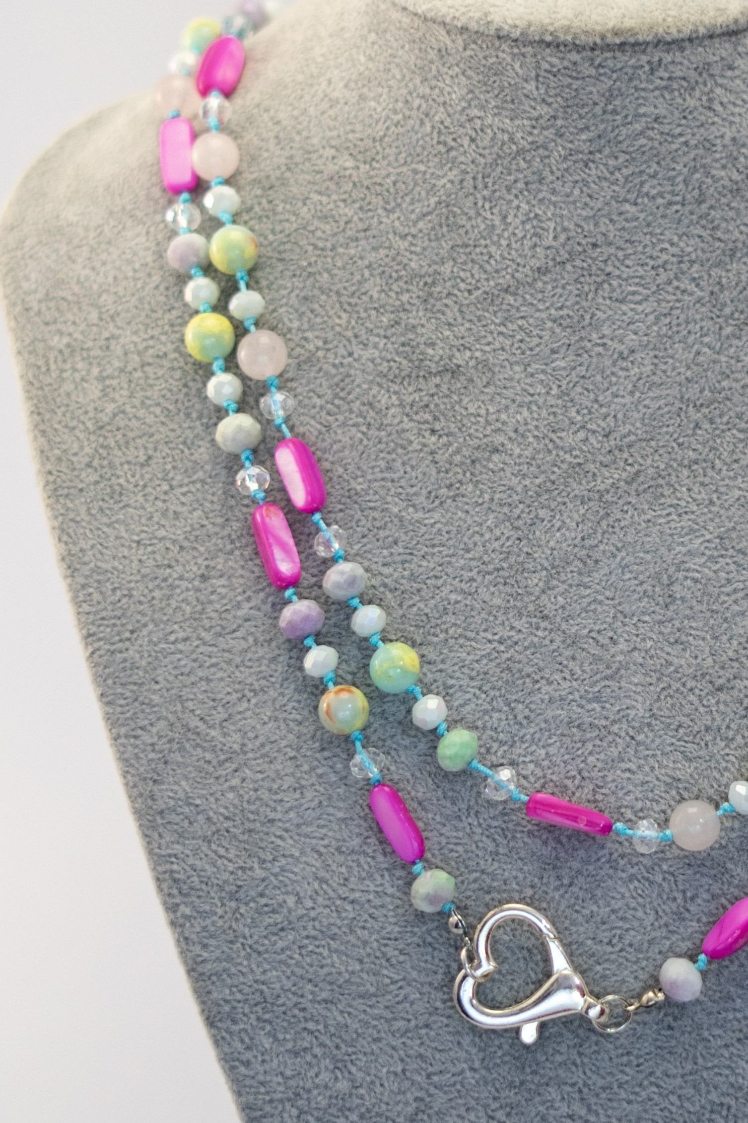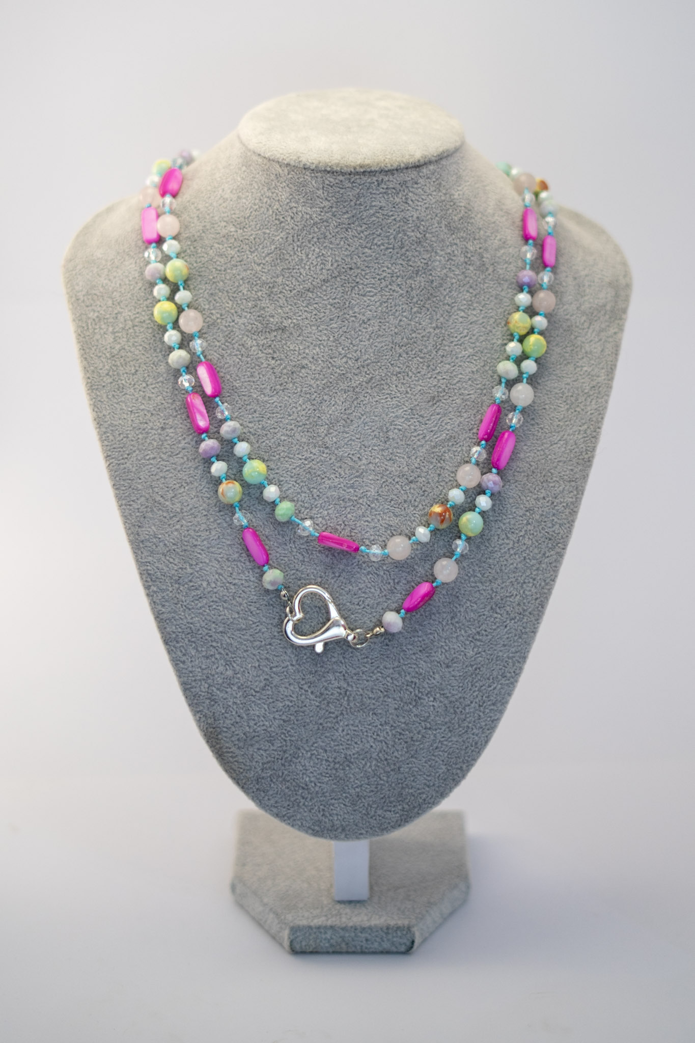 El Collar Fucsia y Aqua combina el brillo del nácar en tonos fucsia con la suavidad del jaspe aqua, ágatas y cristales, creando una pieza vibrante, fresca y femenina.