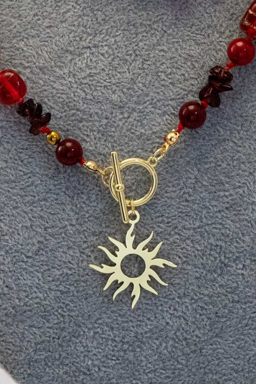 Este collar artesanal combina la intensidad del granate con la energía cálida del jaspe rojo, adornados con cristales hindú y hematitas que aportan brillo y contraste. El diseño se centra en un dije de sol enchapado en oro, símbolo de vitalidad y fuerza, acompañado de un broche enchapado en oro que refuerza su acabado elegante. Una pieza única que transmite poder y sofisticación, ideal para quienes buscan un accesorio con carácter y estilo atemporal.