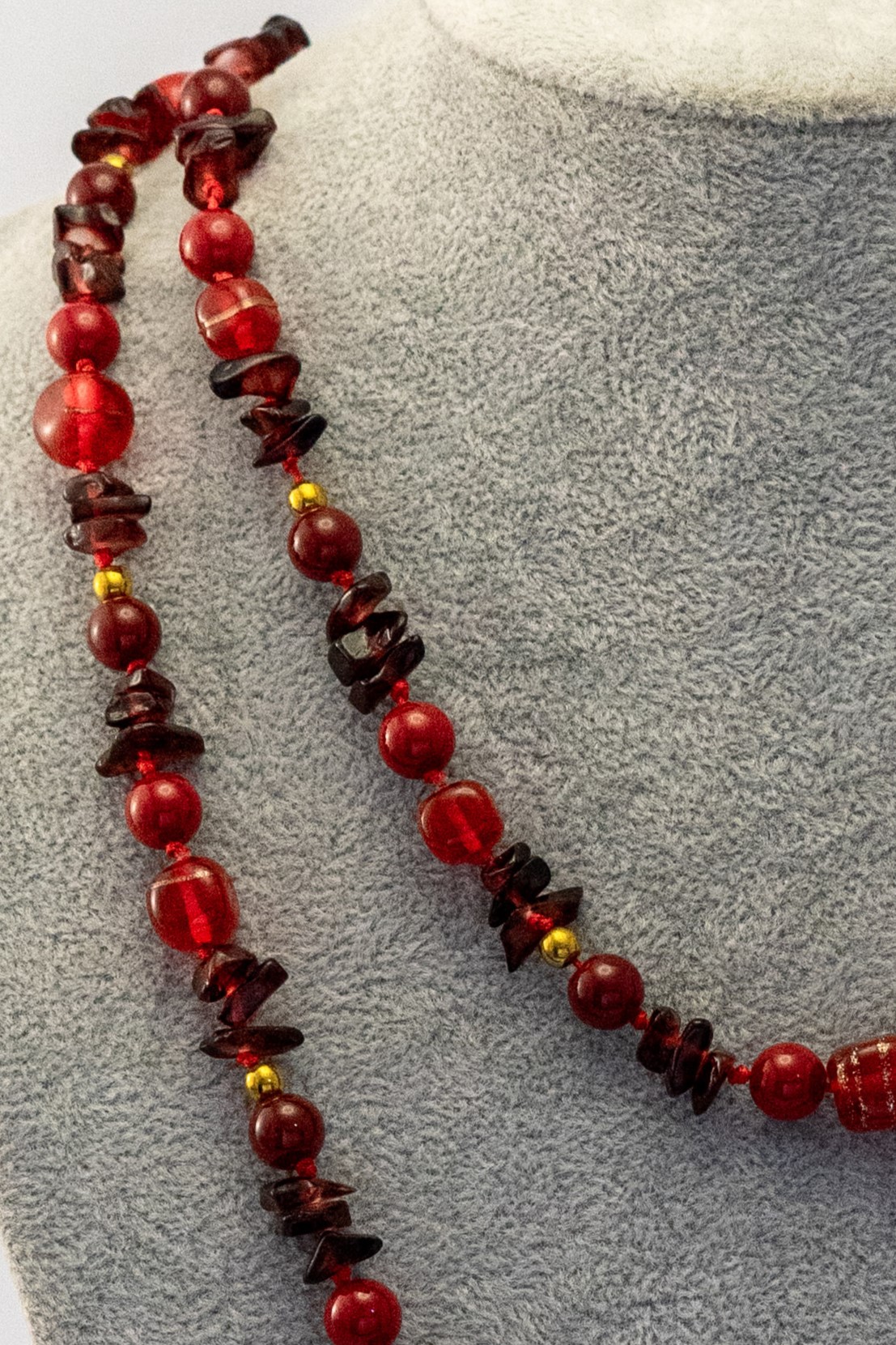 | Materiales Cuentas | Piedra granate con jaspe rojo, cristales hundú y hematitas. Broche y dije enchapado en oro |