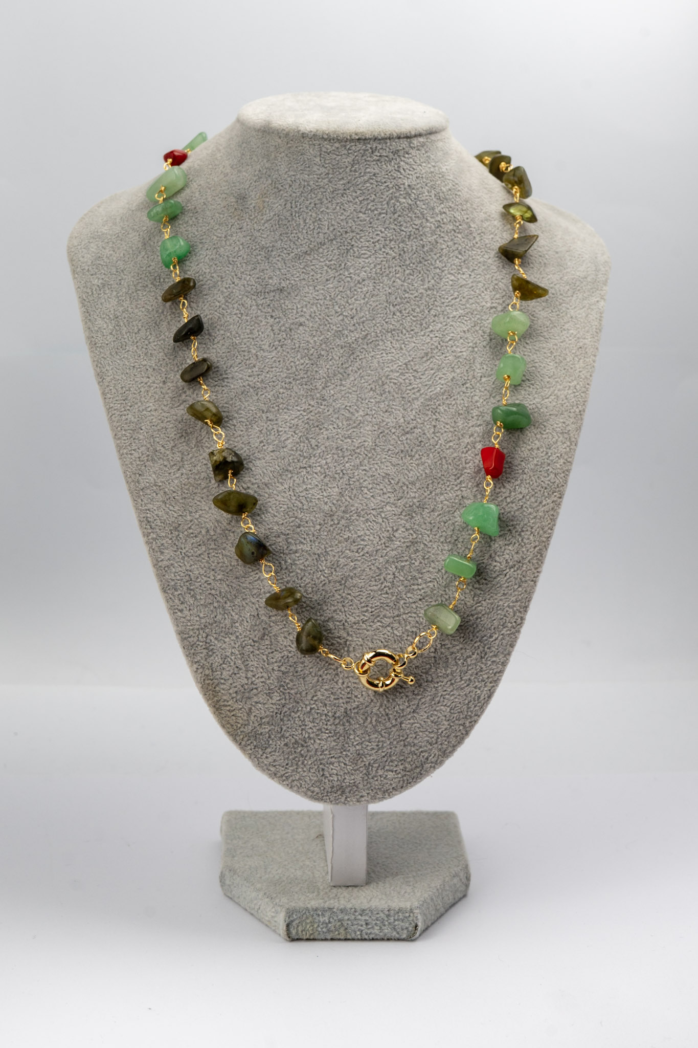 Collar artesanal que combina la suavidad del jade verde con el vibrante coral rojo y el brillo único de la labradorita. Su diseño elegante se completa con un broche enchapado en oro, ofreciendo un acabado sofisticado y duradero. Una pieza versátil, perfecta para añadir color y estilo a cualquier atuendo.