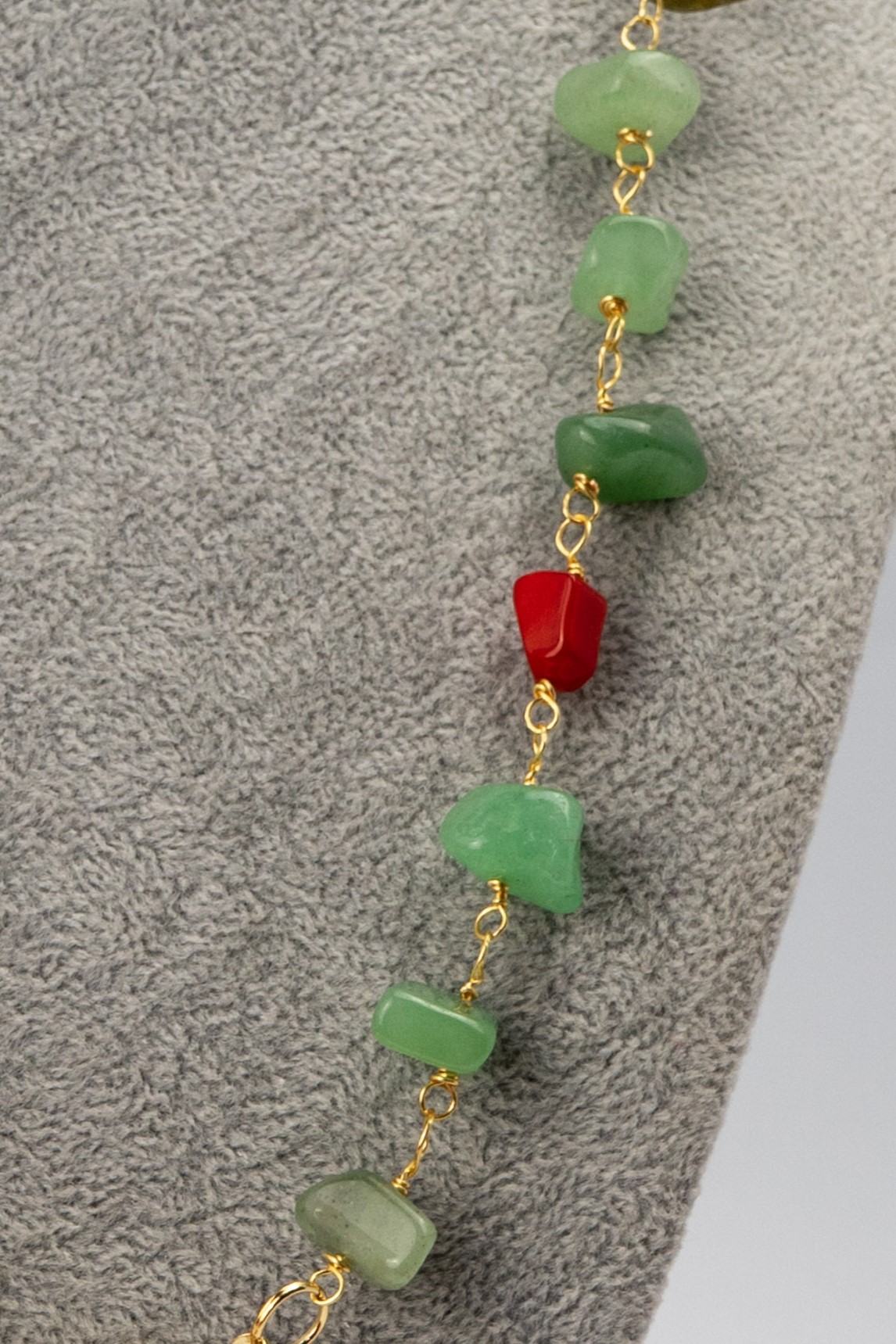 | Cuentas | Jade verde con coral rojo y labradorita. Broche enchapado en oro |