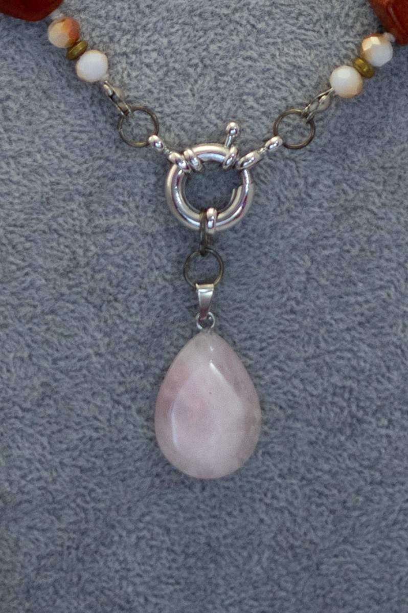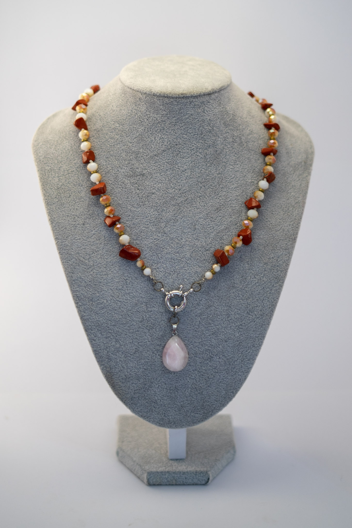 Este collar fusiona la calidez del jaspe marrón con la intensidad de las ágatas burdeos, realzadas por el brillo delicado de cristales blancos y la fuerza de las hematitas. El diseño se completa con un dije de cuarzo rosa, piedra asociada al amor y la armonía emocional. Cada pieza está cuidadosamente seleccionada para aportar equilibrio, elegancia y energía positiva. Perfecto para quienes buscan un accesorio con estilo natural y significado profundo. Elaborado con materiales de alta calidad para una belleza duradera.