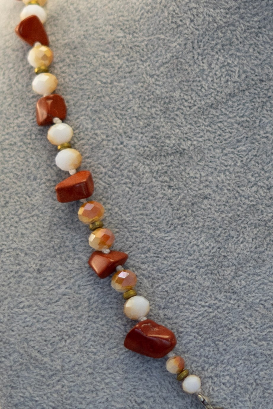 | Materiales Piedras | Jaspe café con ágatas burdeo, cristales blancos y hematitas |