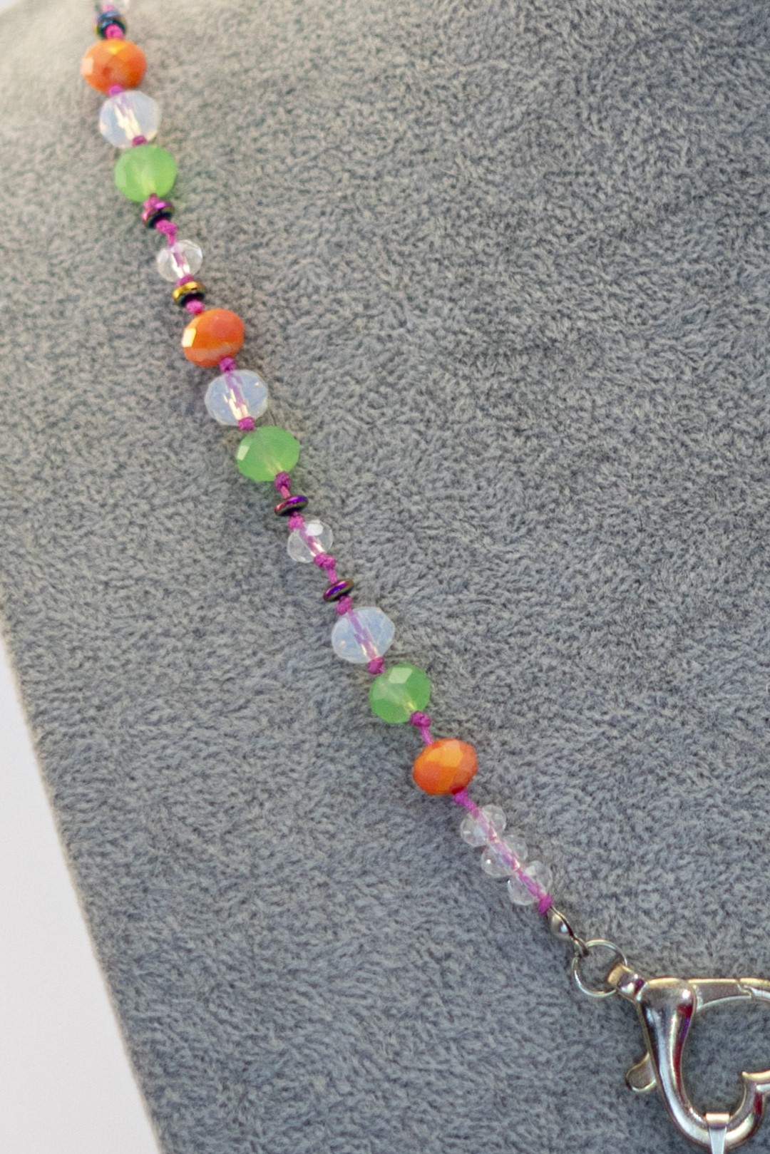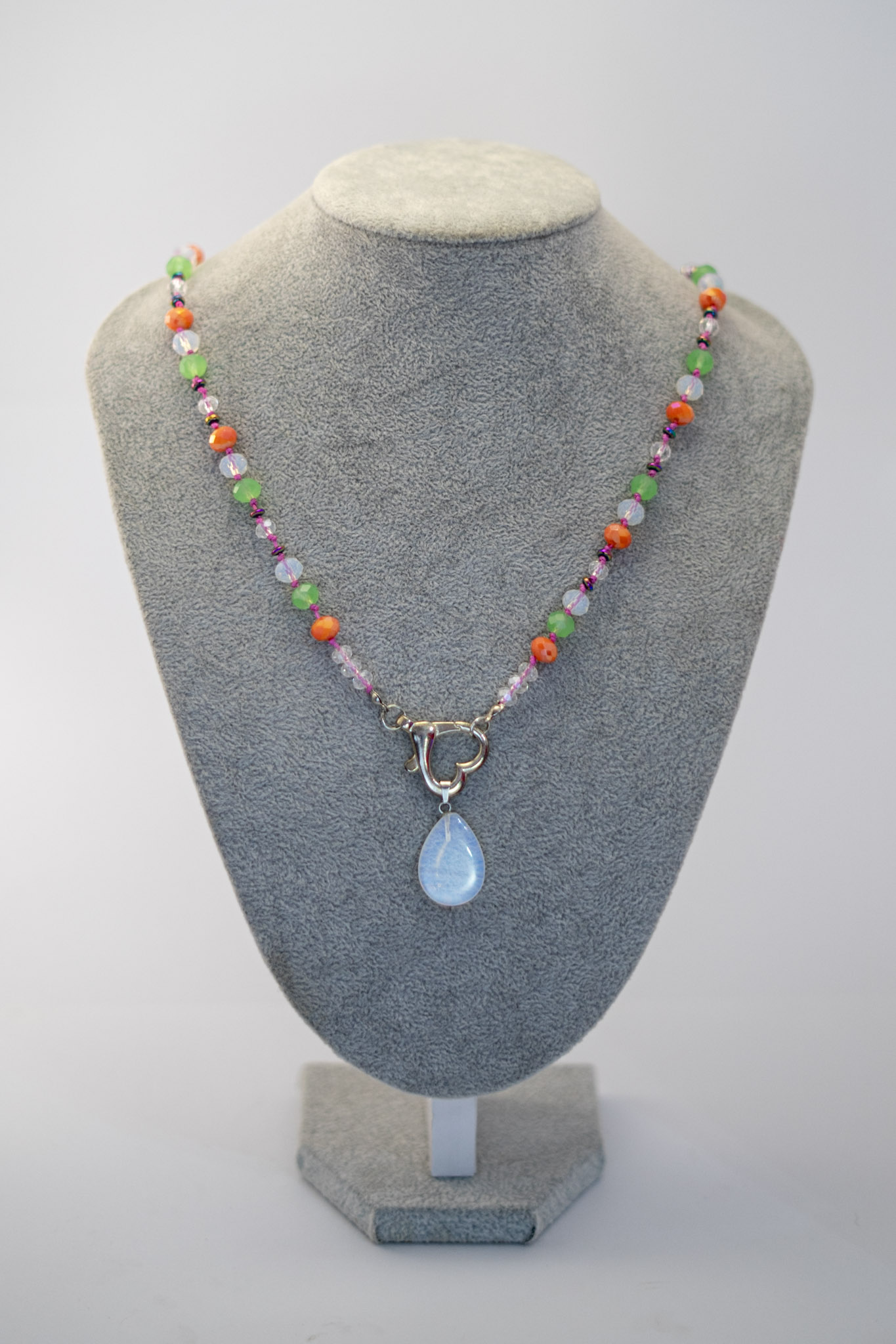 El Collar Lágrima Luna y Cristales es una pieza delicada y expresiva que destaca por su dije de piedra luna en forma de lágrima, acompañado de cristales en tonos verdes y naranjas, además de sutiles hematitas que aportan brillo y equilibrio.