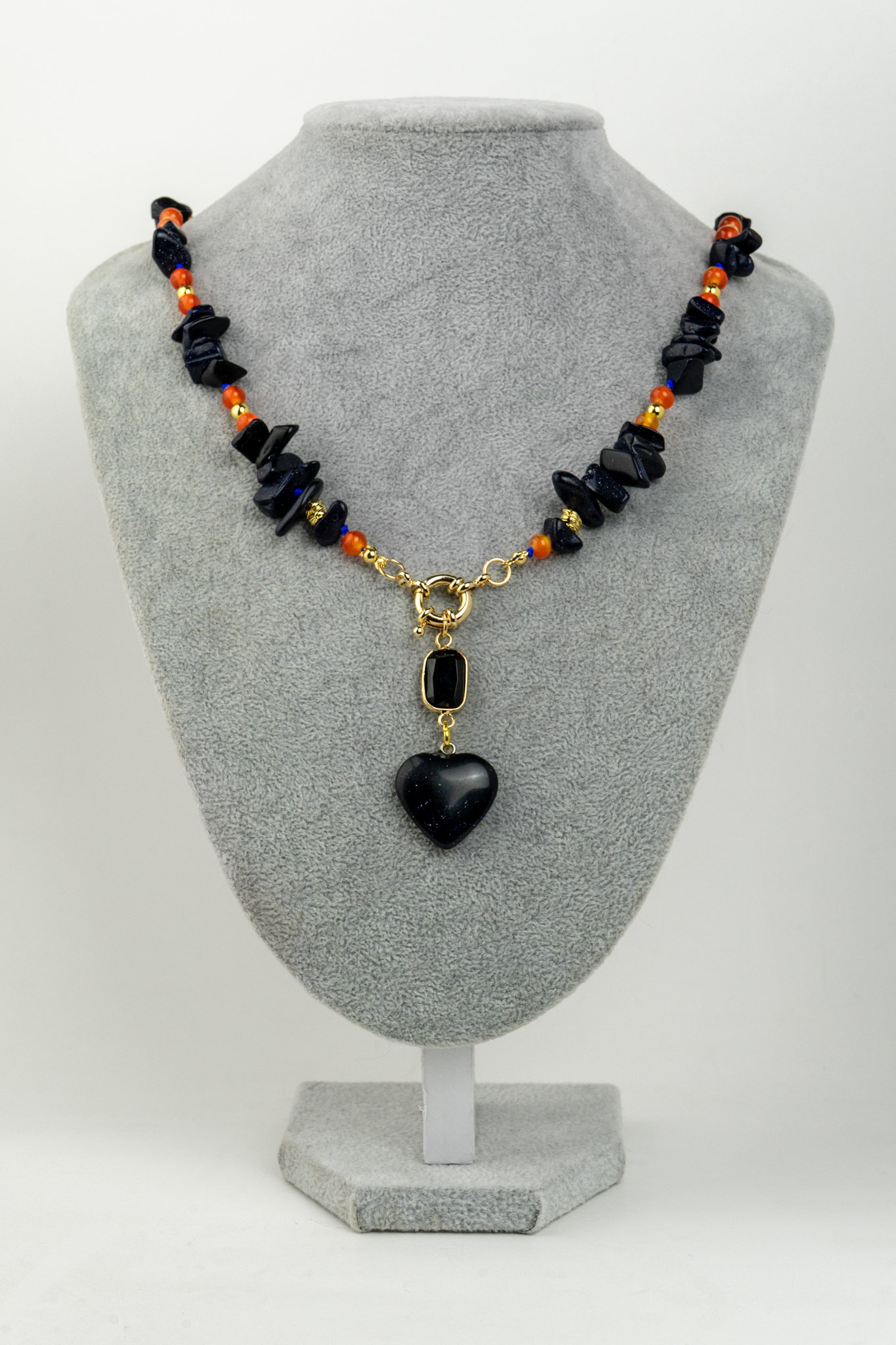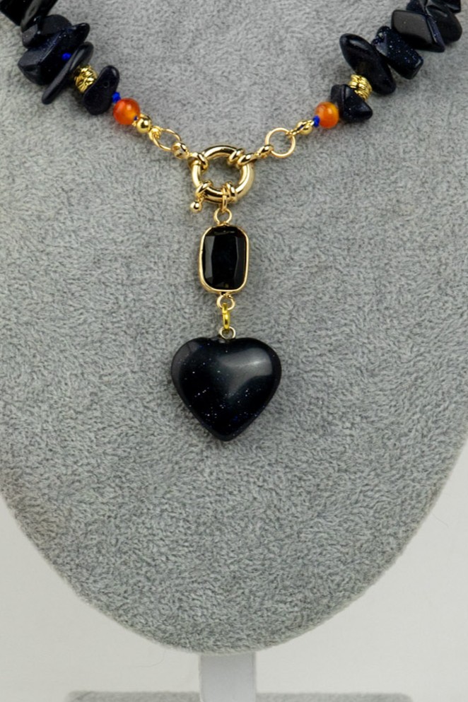 Este encantador collar destaca por su mágico corazón de lluvia de estrellas, acompañado de delicados chips de lluvia de estrellas que aportan un brillo sutil y etéreo. Se complementa con cálidas ágatas naranjas, creando un contraste vibrante y armonioso. Su diseño evoca luz y movimiento, ideal para quienes buscan una pieza especial y con personalidad. Los separadores y broche enchapados en oro entregan un acabado elegante y seguro.