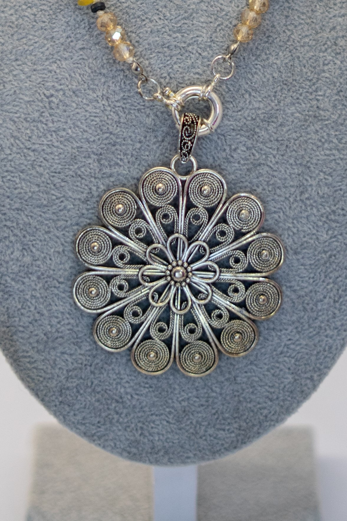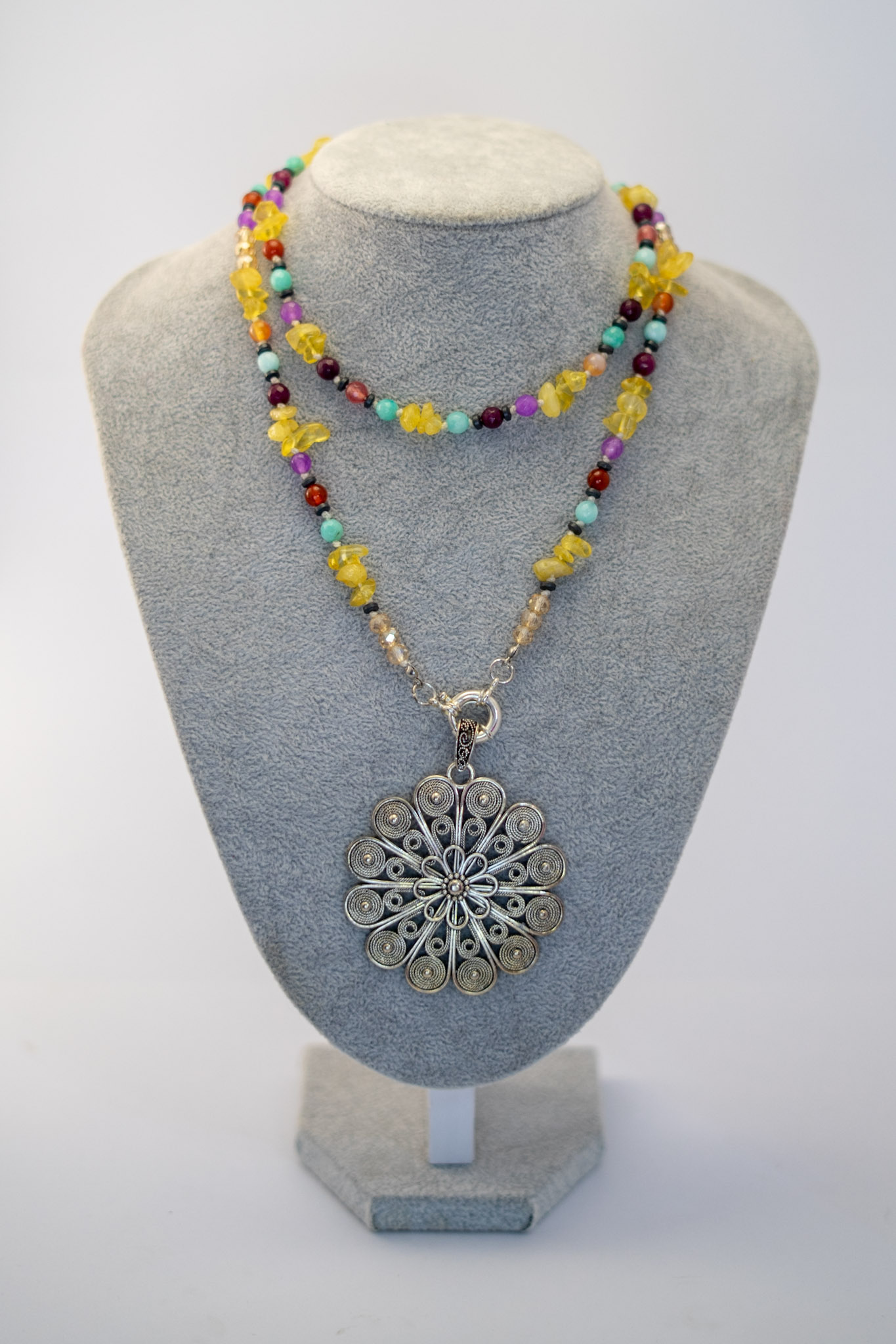 El Collar Mandala Citrino combina un delicado mandala en filigrana plateada con piedras naturales como cuarzo citrino, ágatas y hematitas, creando una pieza llena de significado y armonía.