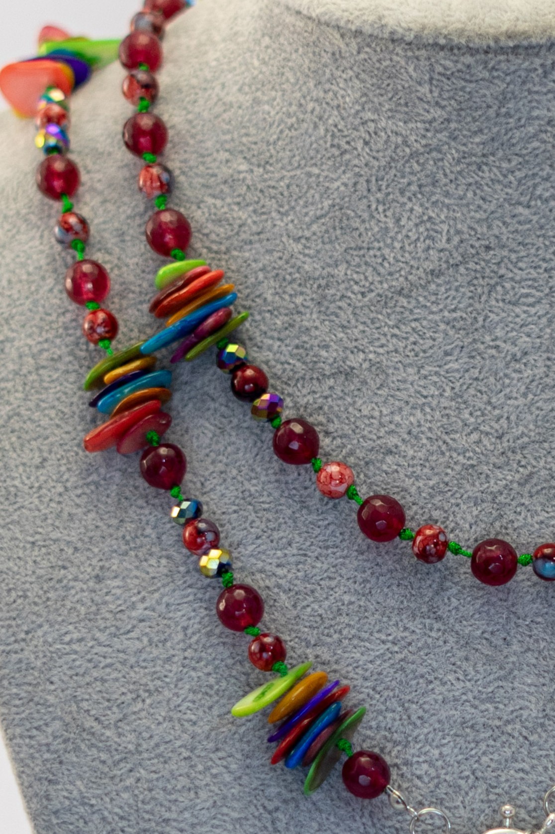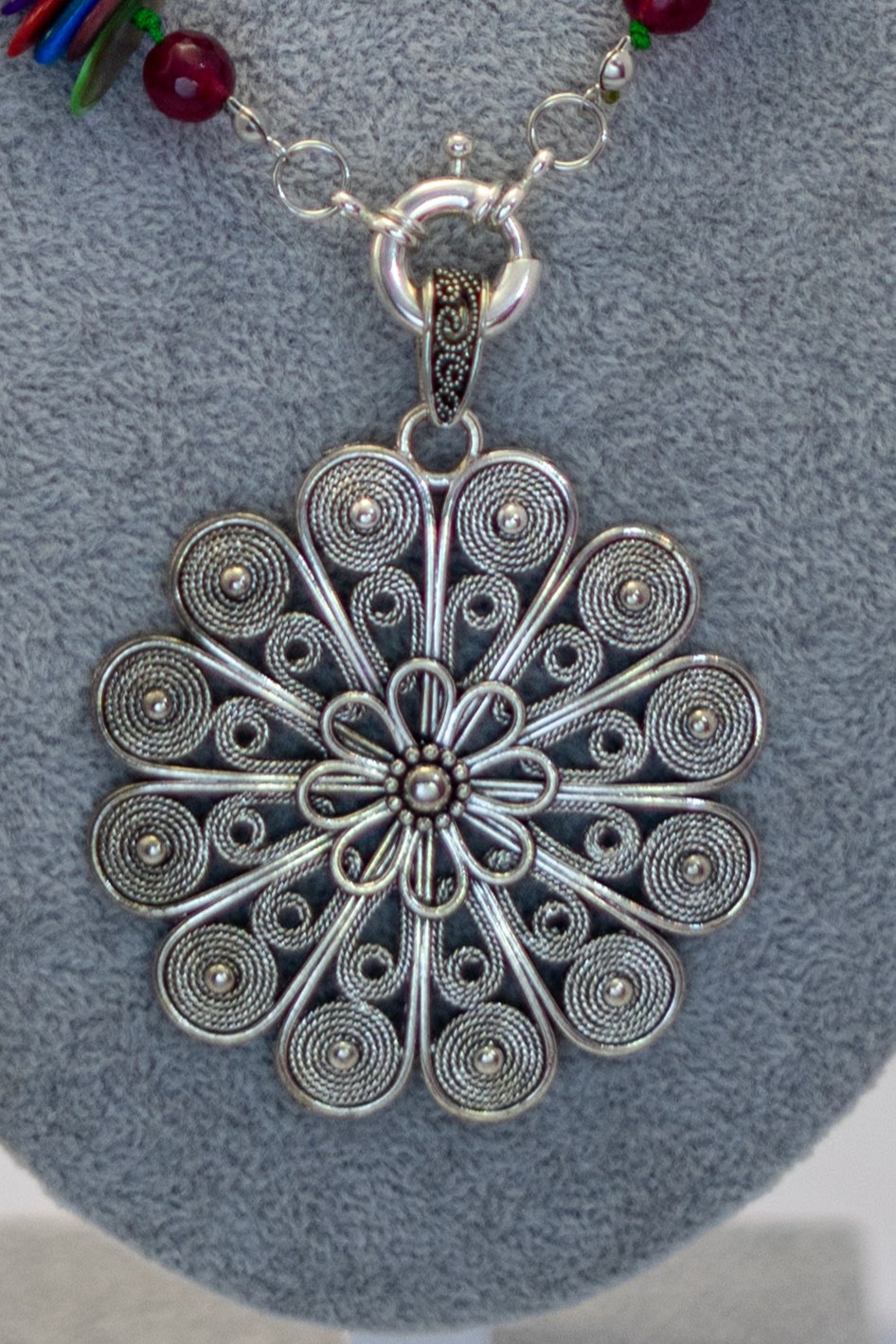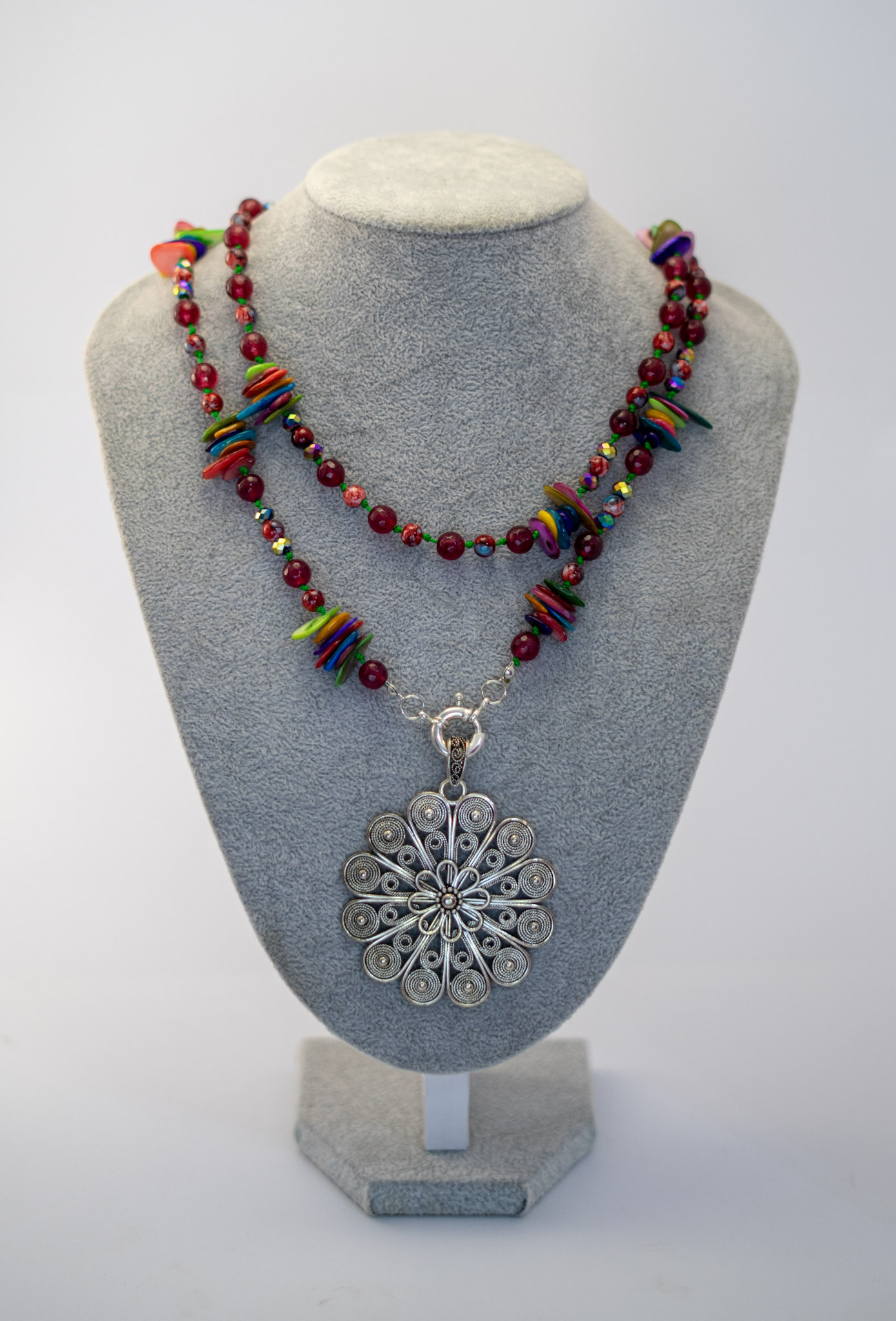 Este collar combina la sutileza del nácar multicolor con la fuerza de las ágatas burdeos y el brillo único de cristales tornasolados, creando una pieza vibrante y llena de energía. Su diseño se complementa con un delicado dije de mandala en filigrana plateado, símbolo de armonía y equilibrio. Cada detalle ha sido cuidadosamente trabajado para ofrecer un accesorio elegante y con personalidad. Ideal para quienes buscan un toque distintivo y colorido en su look. Elaborado con materiales de alta calidad para una belleza duradera.