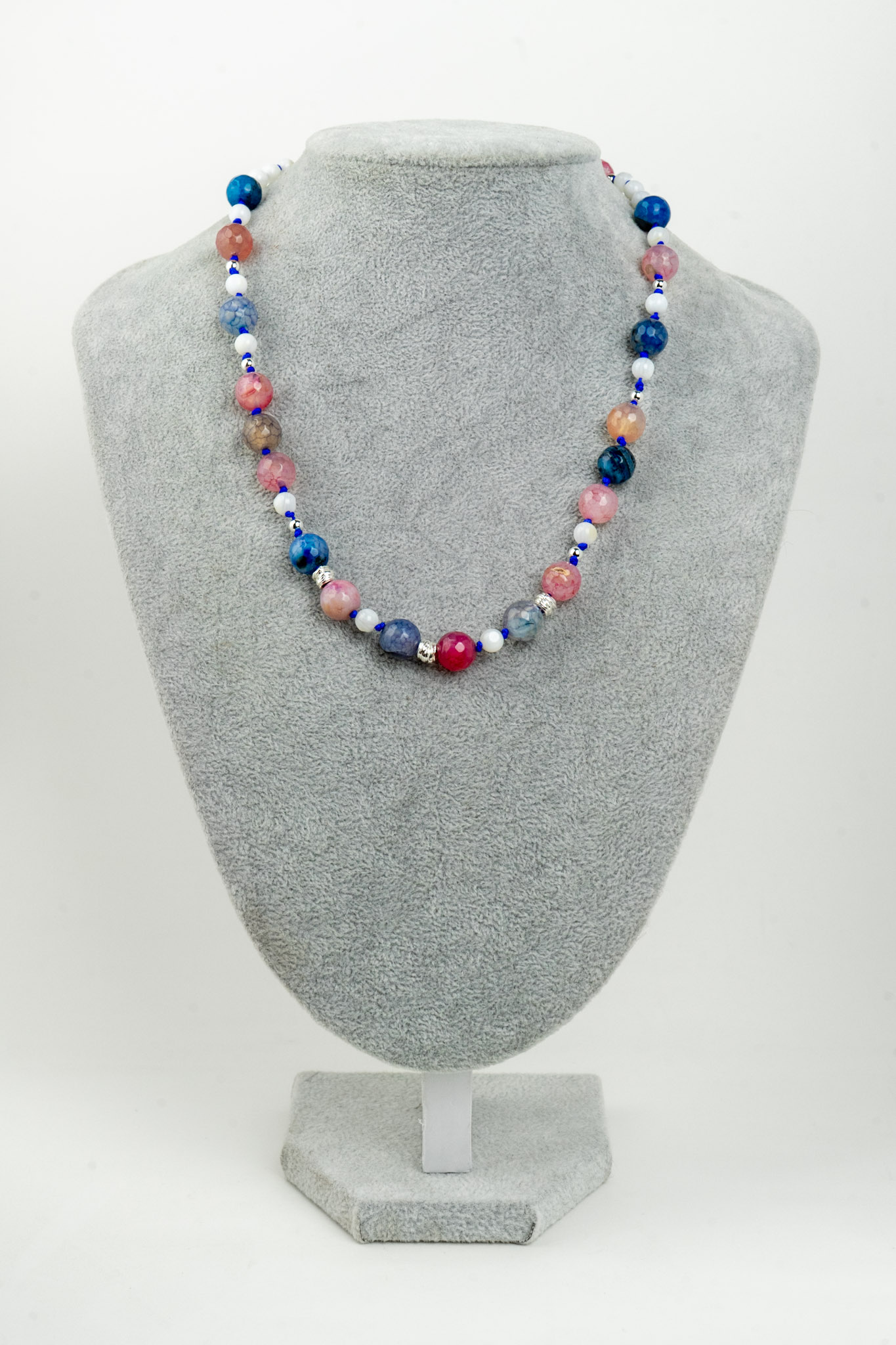 Este elegante collar combina un armonioso mix de ágatas de colores con la suavidad del nácar, creando una pieza equilibrada y llena de luz. Sus tonalidades aportan frescura y versatilidad, ideal para complementar distintos estilos. Los separadores y broche enchapados en plata entregan un acabado refinado y seguro, realzando su diseño con un toque sofisticado.