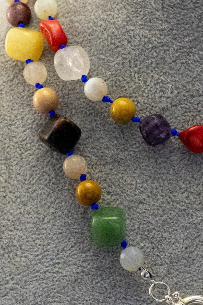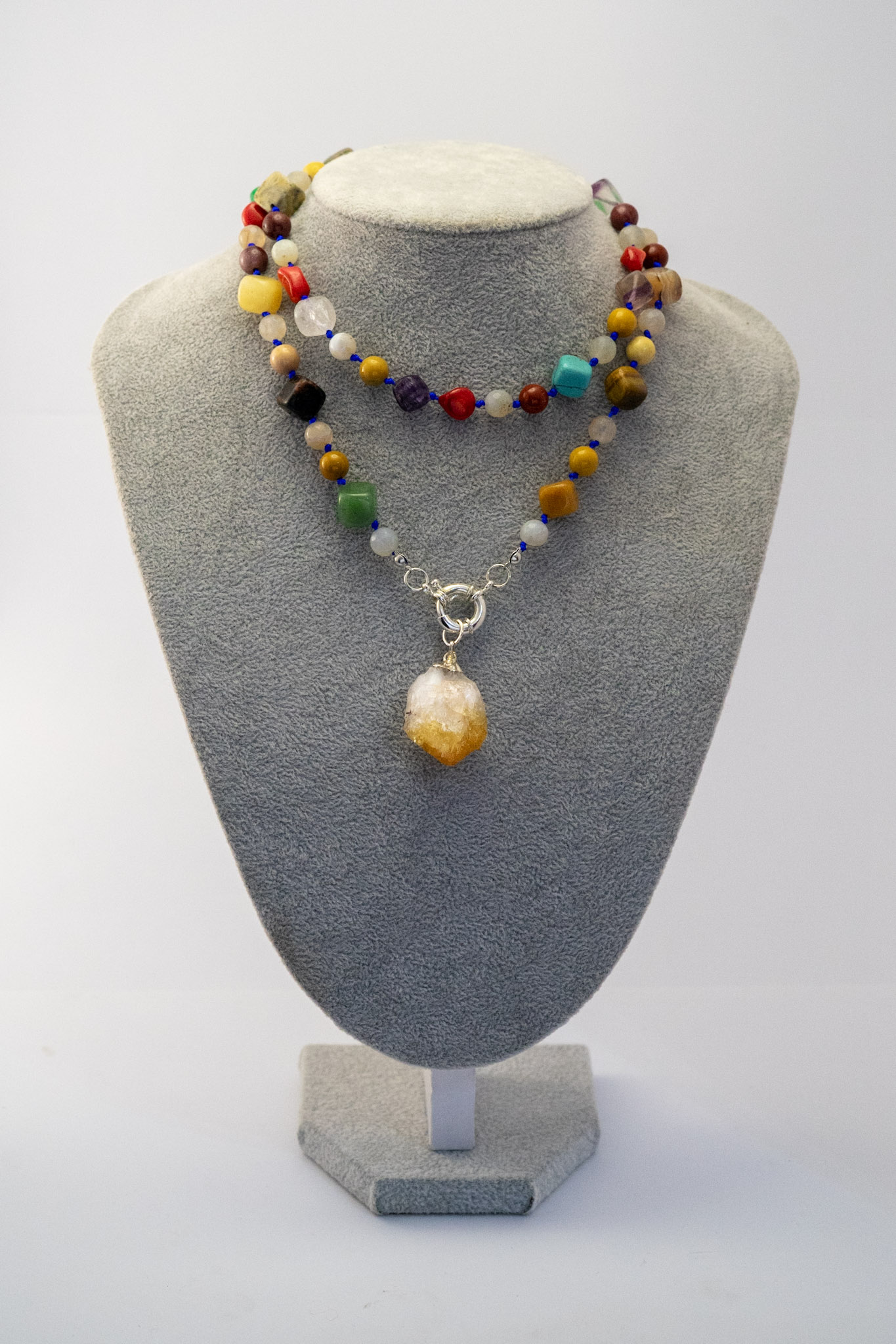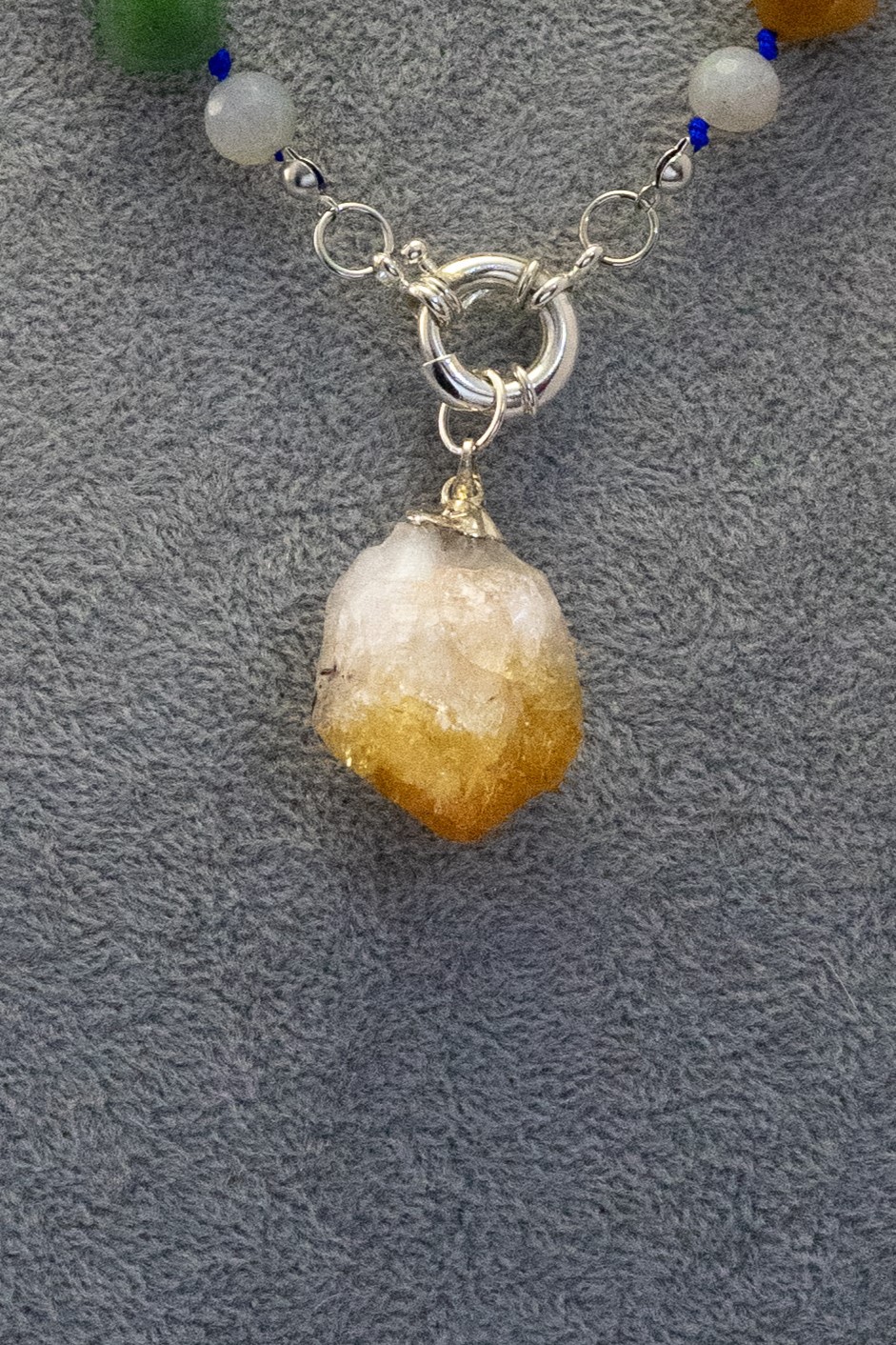 Collar con dije de citrino natural, una piedra que irradia luz, energía y vitalidad. Esta joya destaca por su vibrante combinación de piedras naturales como ojo de tigre, coral, aventurina, uníquita, cuarzo cristal, turquesa, amatista y otras gemas seleccionadas por su color, textura y energía. El resultado es un diseño lleno de vida, ideal para quienes buscan un accesorio colorido, único y con una profunda conexión con la naturaleza.
