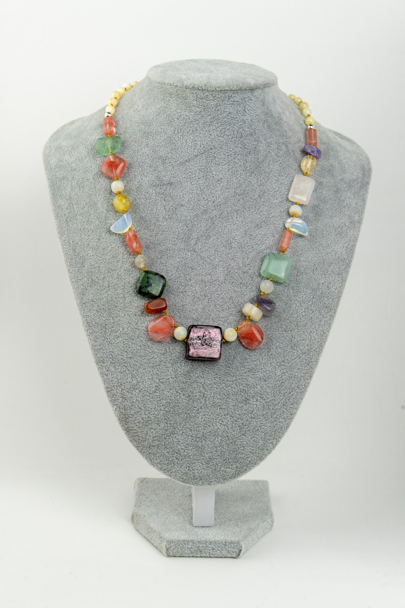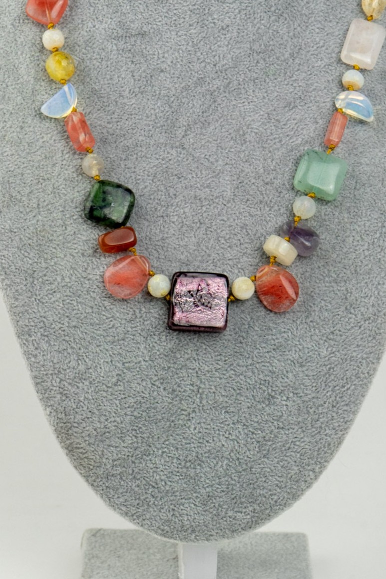 Este moderno collar destaca por su diseño con mix de piedras rectangulares, combinando ágata cornalina, aventurina, ónix, piedra luna, cuarzo rosa, entre otras, creando una pieza equilibrada y visualmente atractiva. Su variedad de tonos aporta dinamismo y sofisticación, ideal para complementar distintos estilos. El broche enchapado en plata entrega un acabado elegante y seguro, pensado para el uso diario o ocasiones especiales.