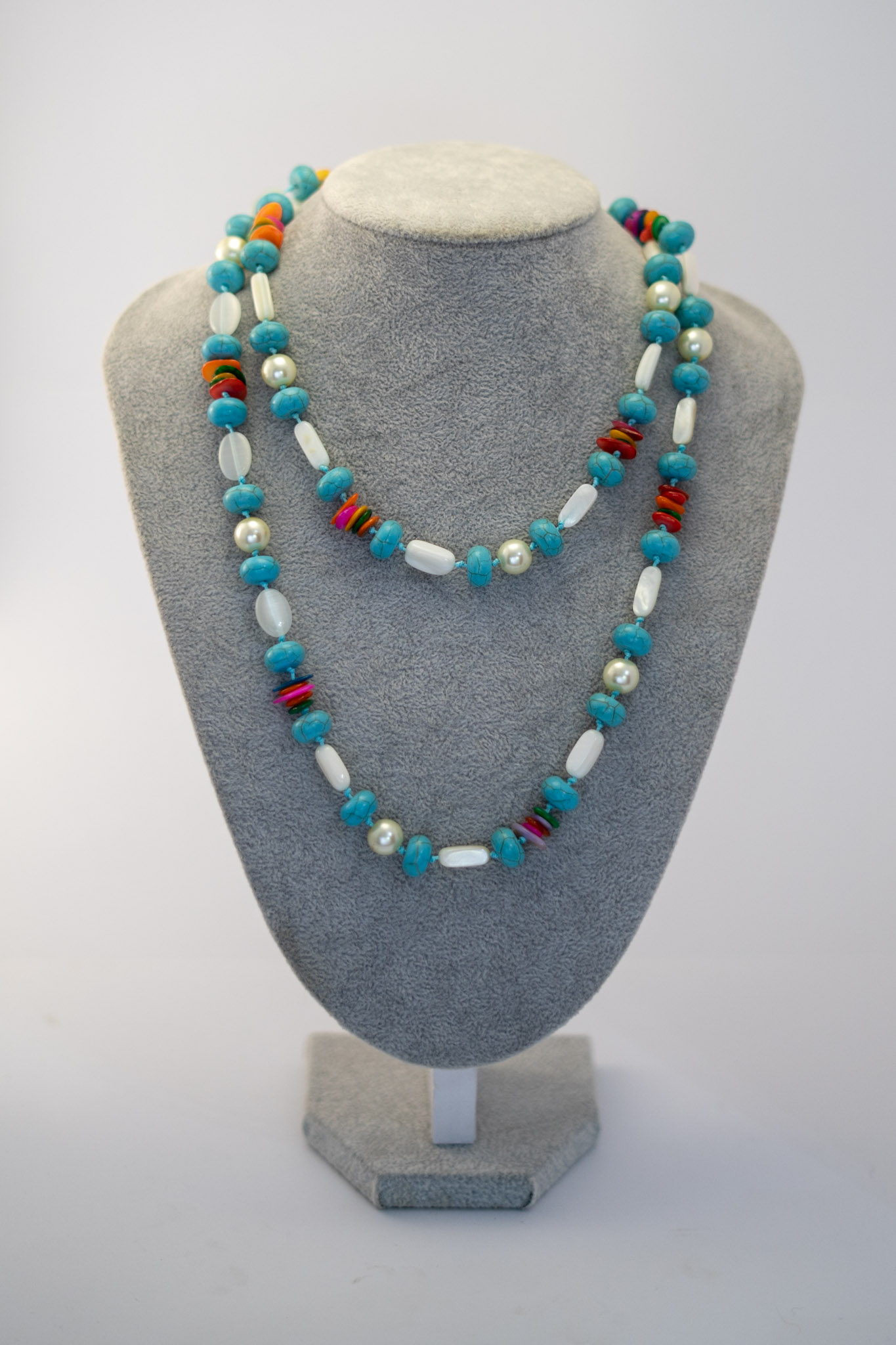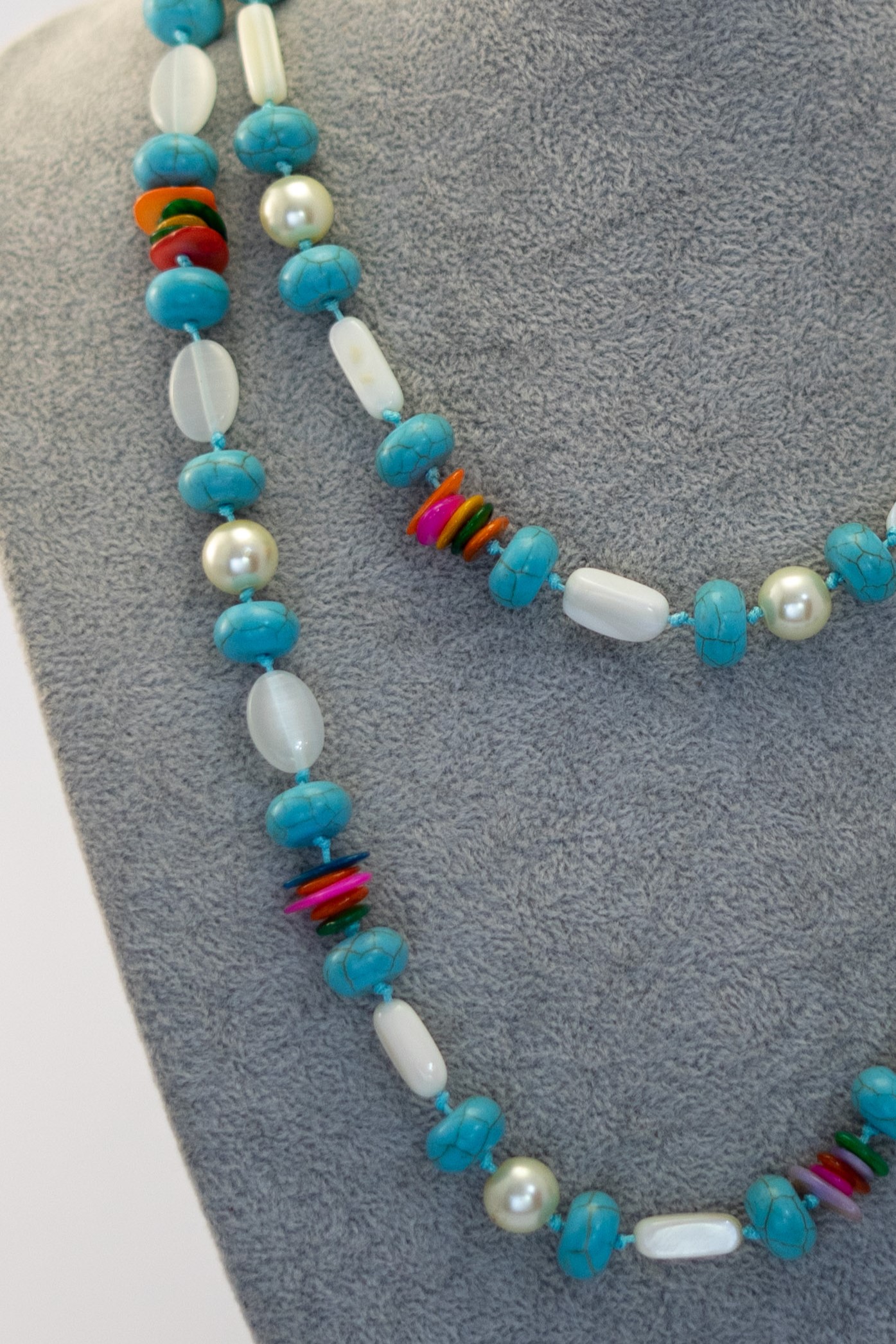 El Collar Mix Turquesa y Blanco es una pieza fresca y luminosa que combina materiales cuidadosamente seleccionados: piedras turquesa, nácar, piedra luna y perlas de vidrio en tonos crema, todo unido por un elegante broche tipo timón en color plateado que le da un detalle distintivo.