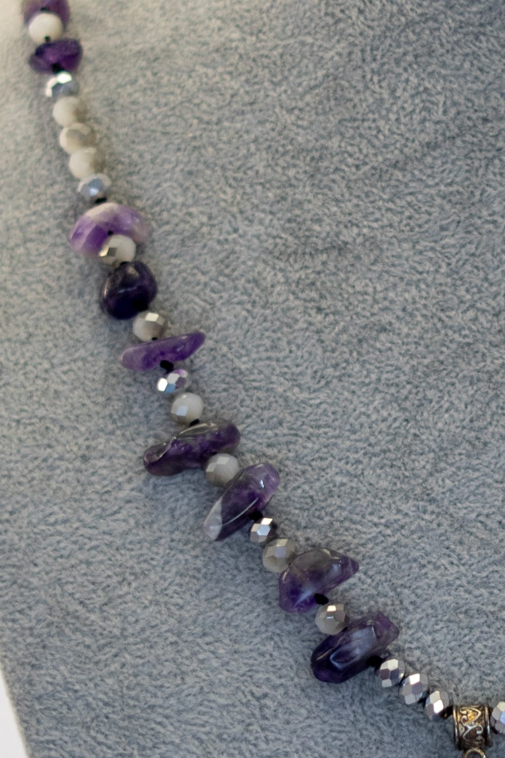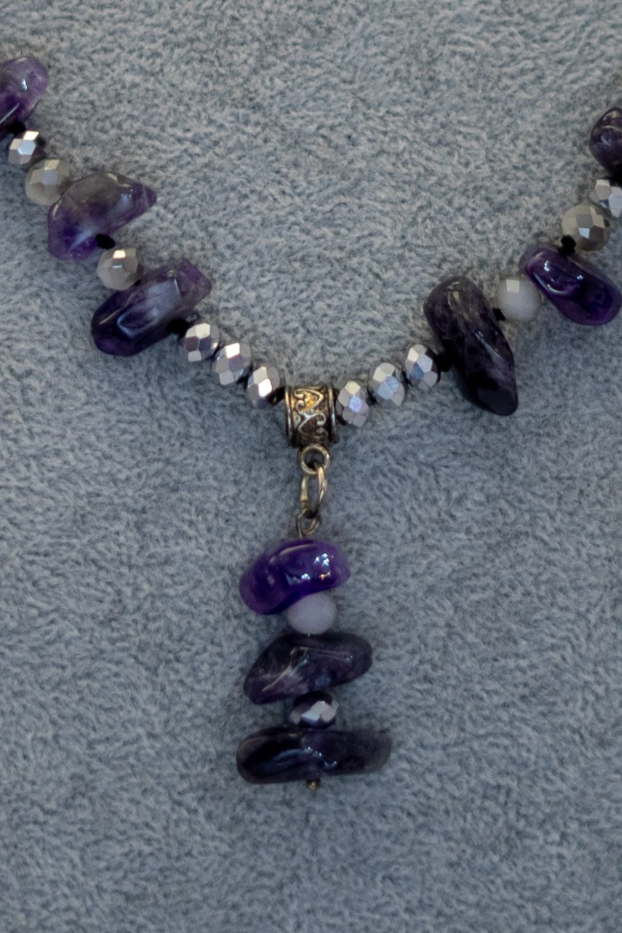 Este collar combina la energía espiritual de las amatistas con el brillo sutil de cristales grises, creando una pieza equilibrada y sofisticada. El diseño se realza con un dije elaborado con piedras amatistas, aportando armonía y conexión espiritual. Cada detalle ha sido cuidadosamente trabajado para ofrecer un accesorio único y elegante. Ideal para quienes buscan un toque de color con significado en su look diario. Elaborado con materiales de alta calidad que garantizan durabilidad y belleza.