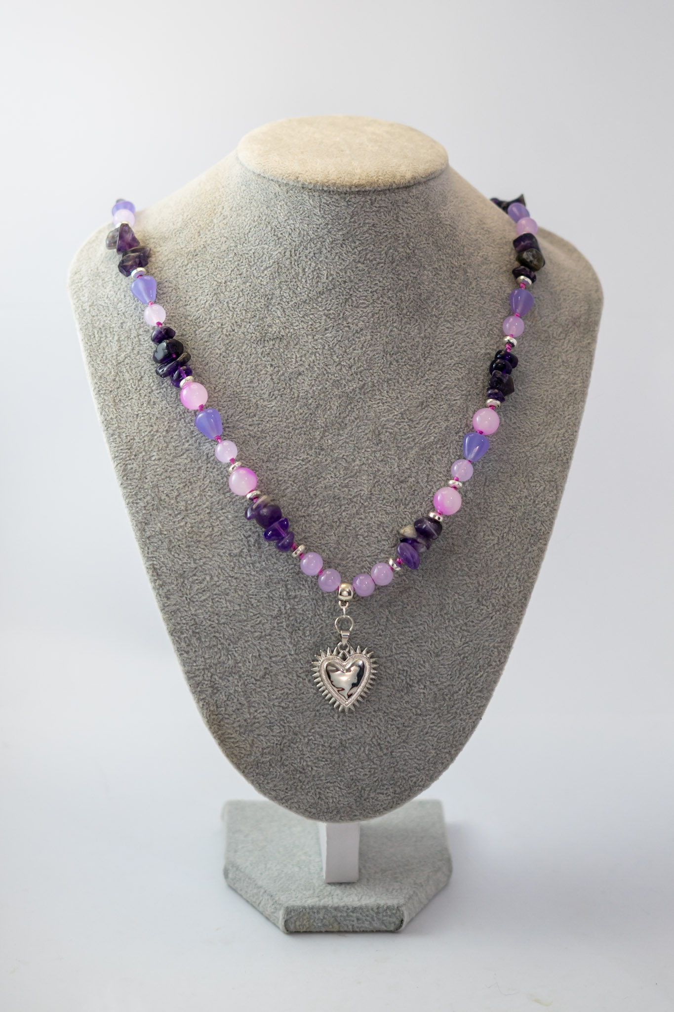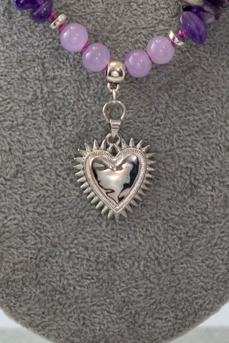El Collar Morado Corazón es una pieza delicada y expresiva, diseñada en una armonía de tonos lilas y violetas. Su detalle central, un dije de corazón enchapado en plata, resalta entre los chips de amatista, conocidos por su belleza natural y propiedades energéticas.