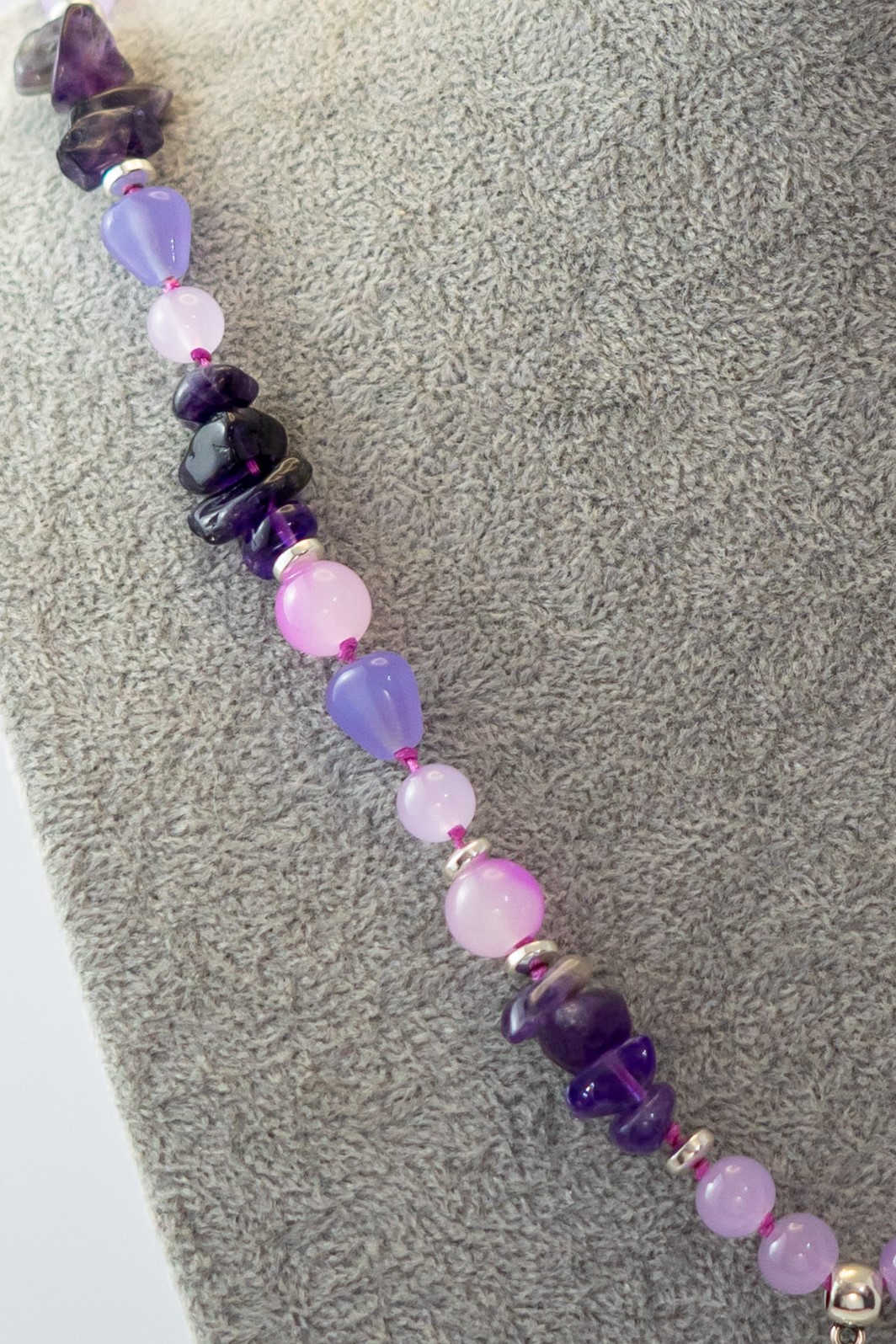 Las ágatas lila y las hematitas añaden profundidad y brillo, creando un juego de luces y texturas elegante. Perfecto para regalar o para llevar cerca del corazón, es un accesorio que transmite serenidad, cariño y estilo.