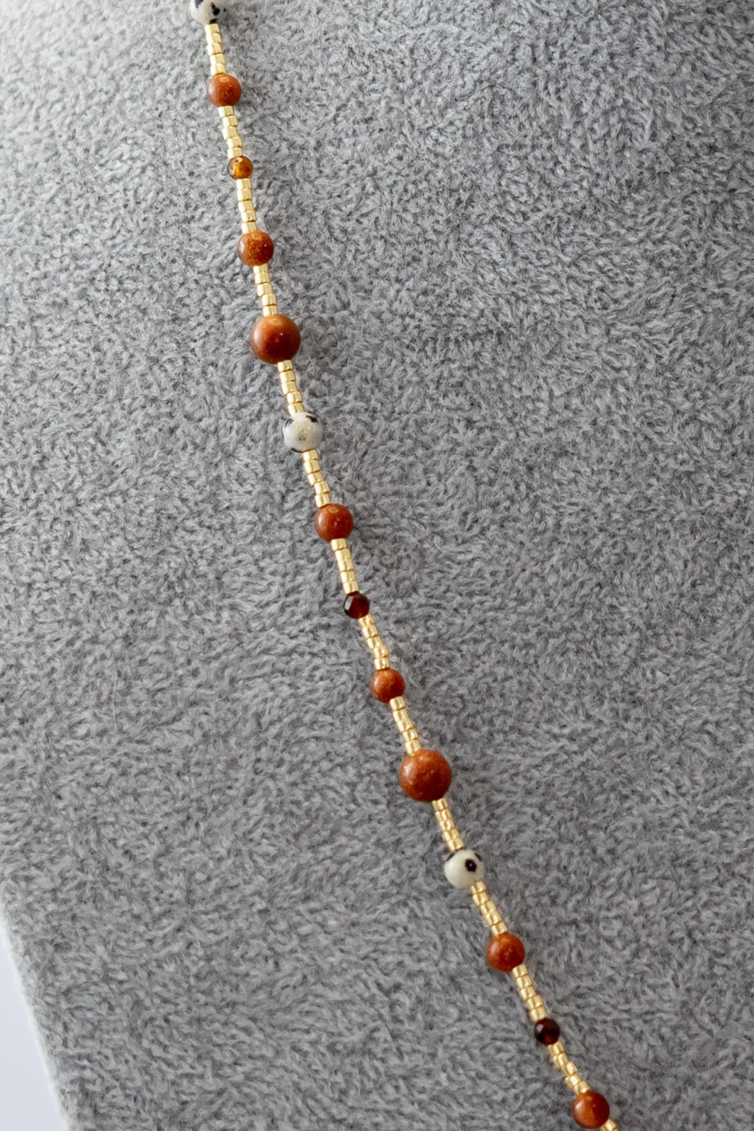 | Materiales Cuentas | Mostacilla japonesa, piedra del sol y circonitas en tonos café |