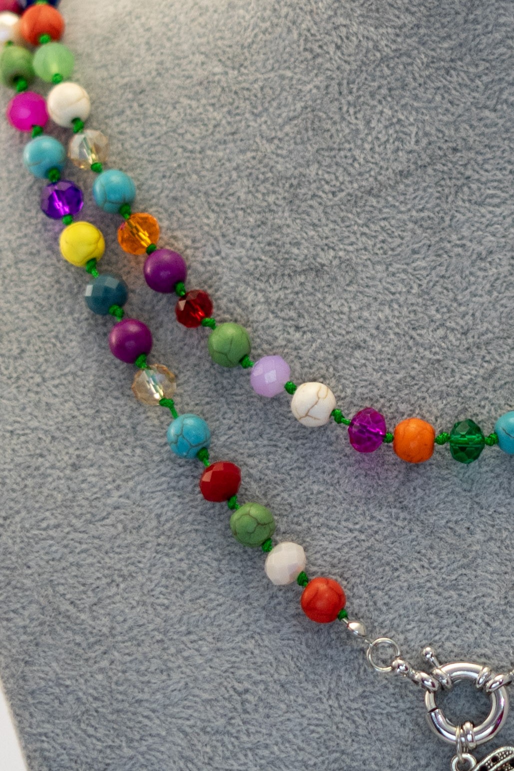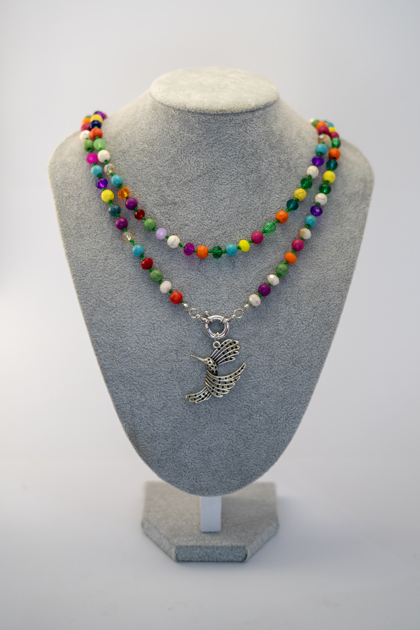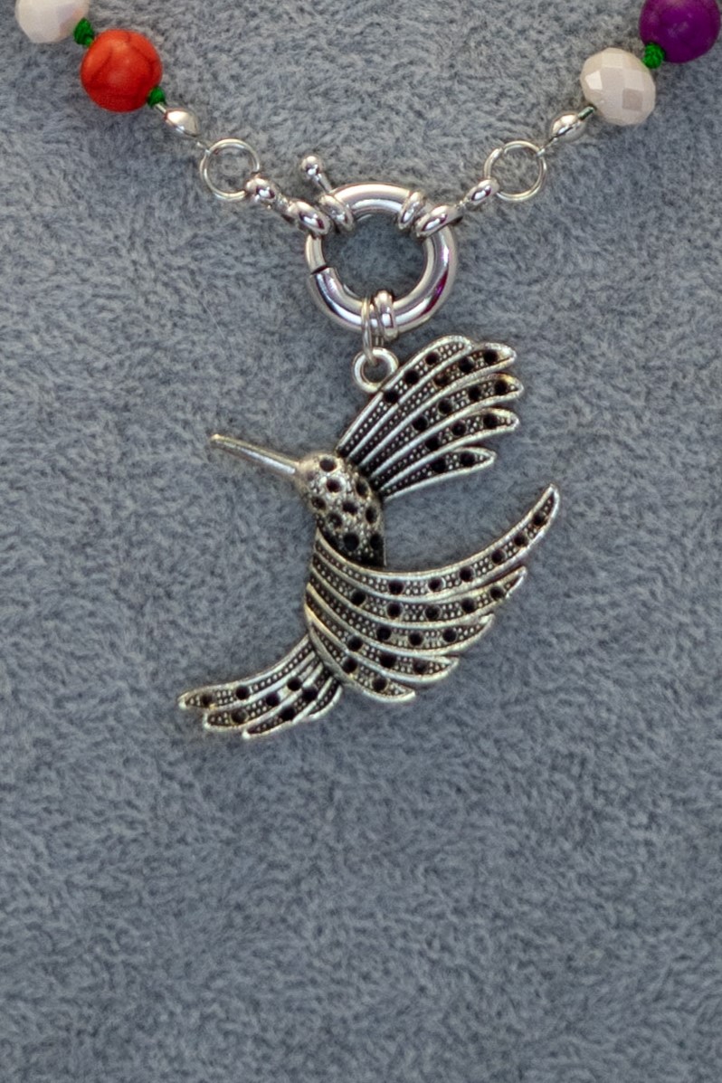 El Collar Multicolor Colibrí es una pieza llena de vida y color. Su dije de colibrí en plata simboliza ligereza y libertad, mientras que las cuentas de howlita y cristales en variados tonos multicolores crean un diseño dinámico y armonioso.