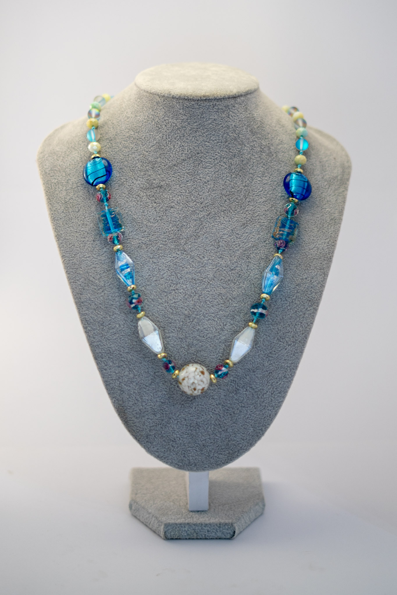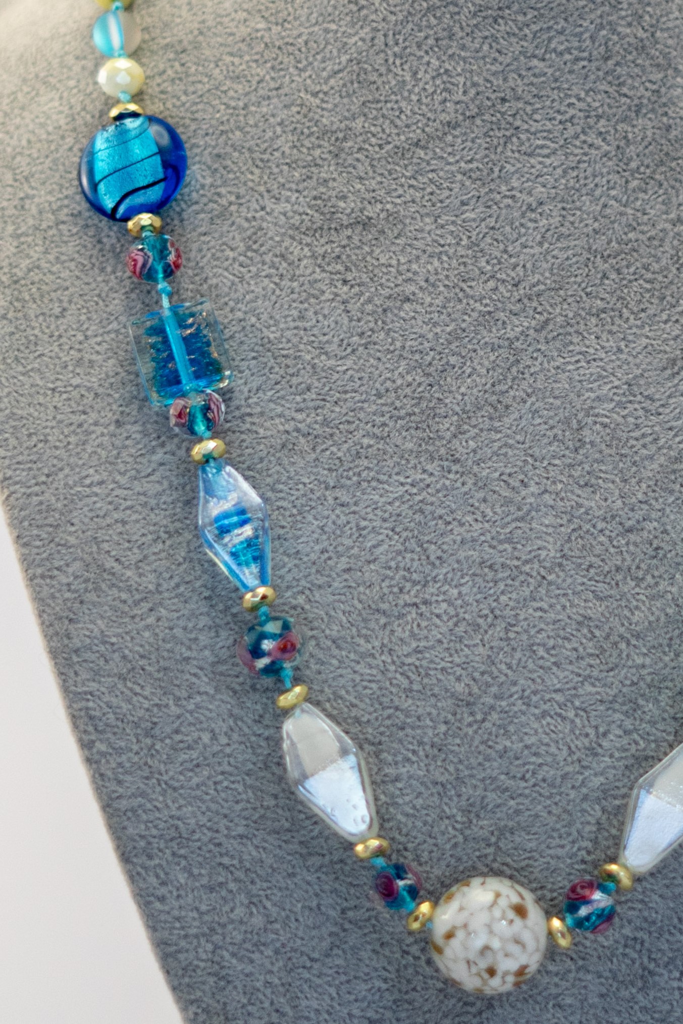 El Collar Murano Celeste es un susurro de luz y frescura. Hecho a mano con cristales hindúes en blanco, cuentas de murano celeste, cuarzo sirena y cristales grises que reflejan suavemente la luz en cada movimiento.