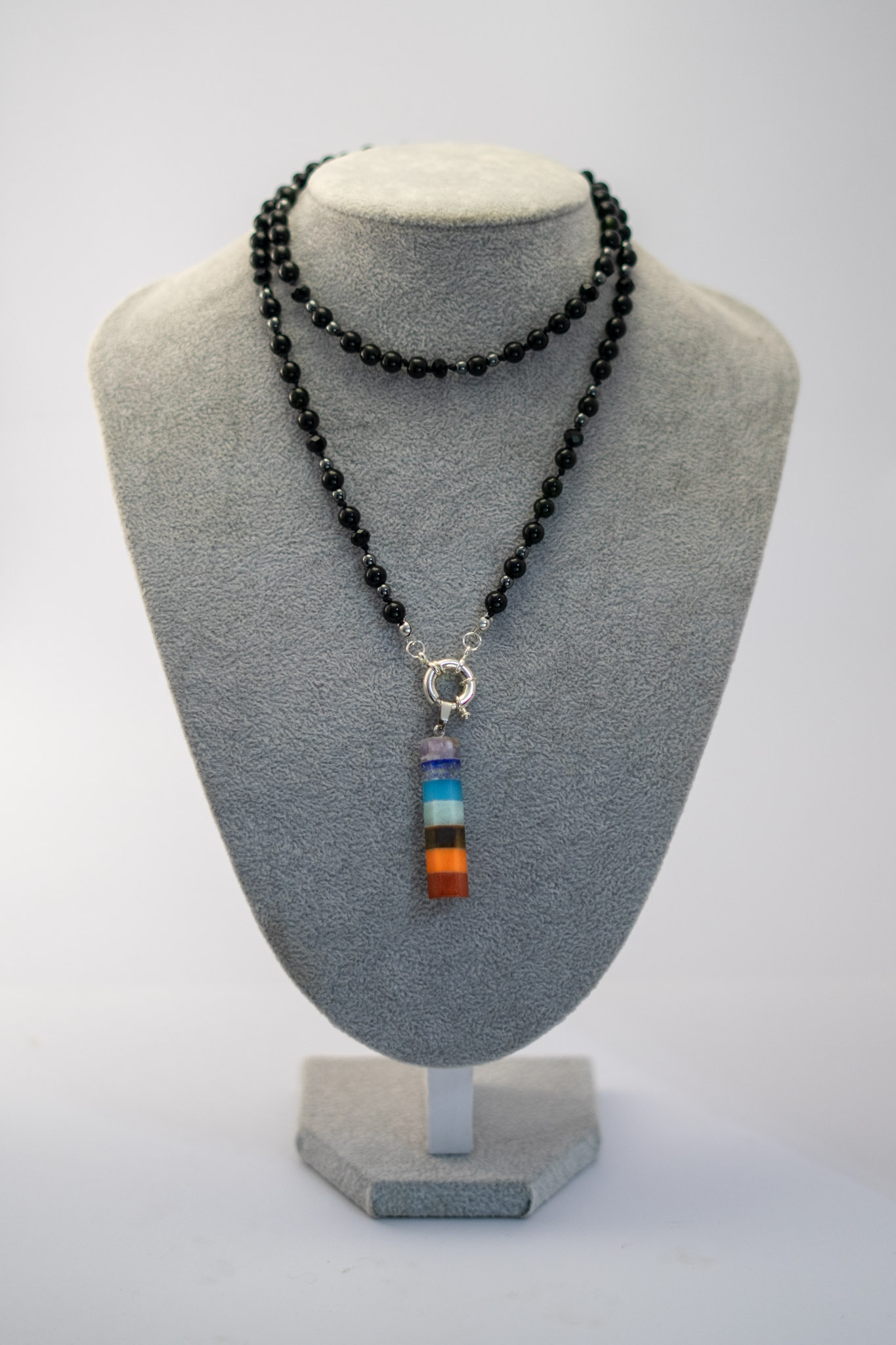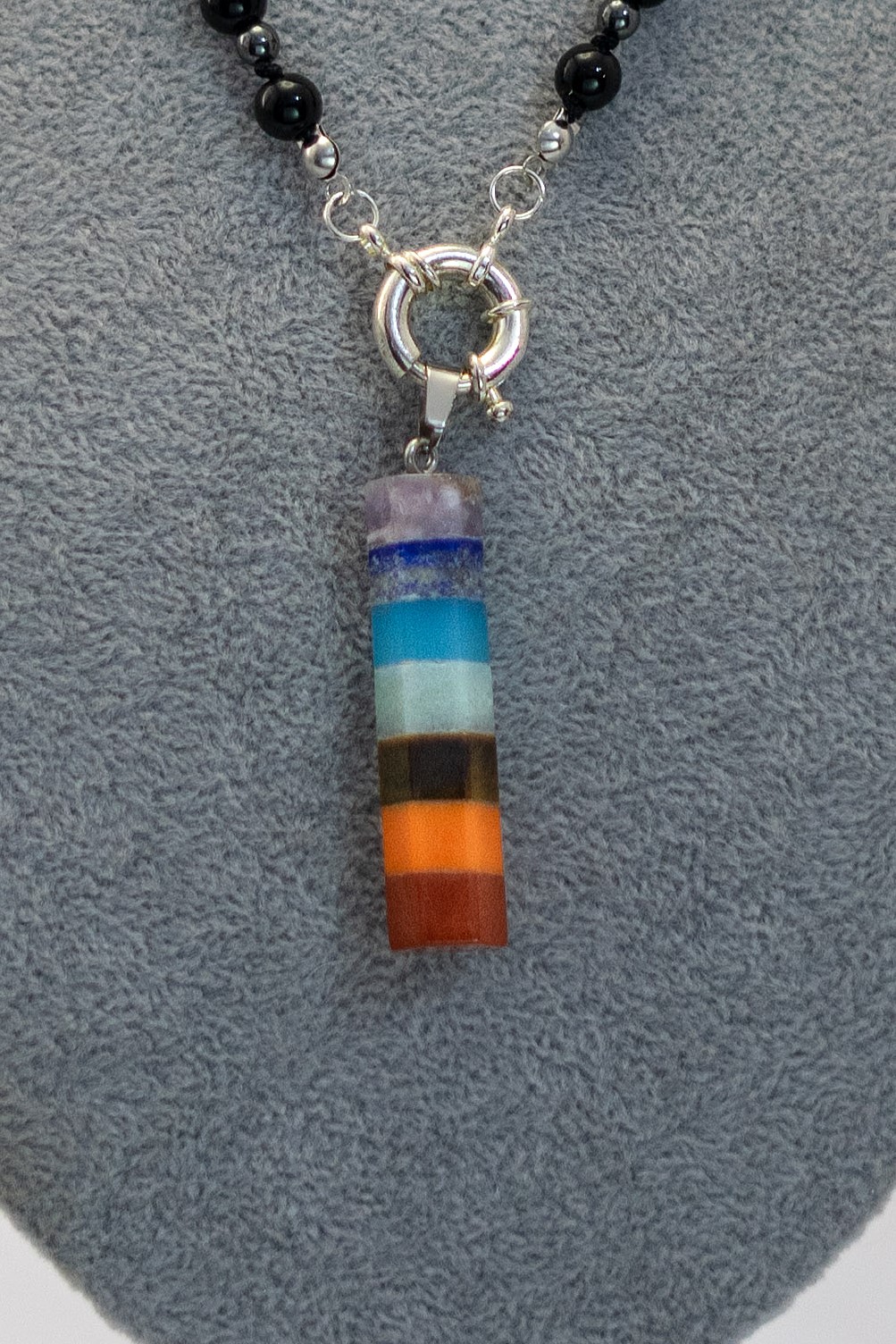 Su dije central representa los 7 chakras, cada uno con su propia piedra, pensado para armonizar tu energía y recordarte la conexión contigo misma. El broche plateado le da un toque de luz que resalta entre los tonos oscuros.