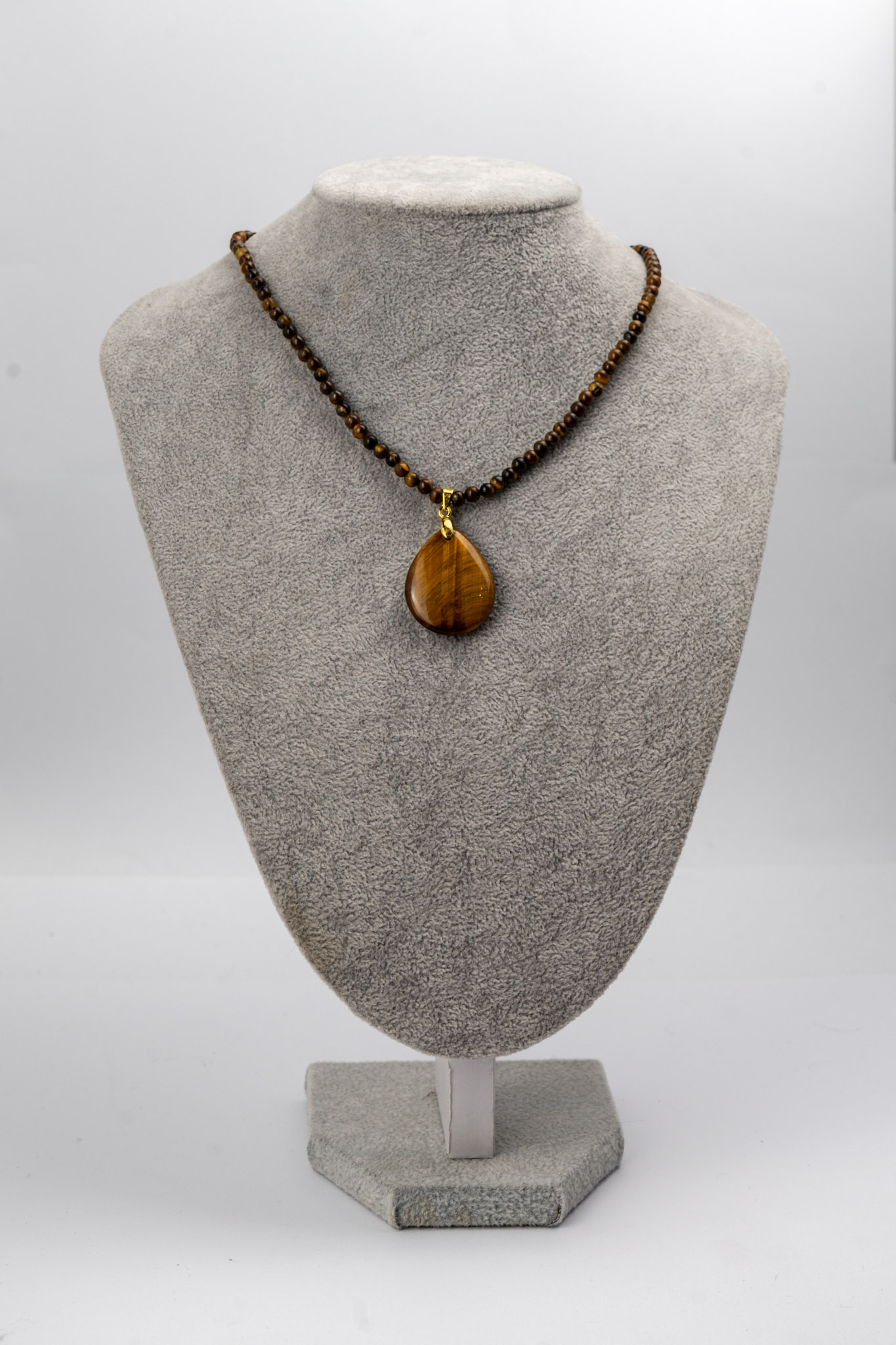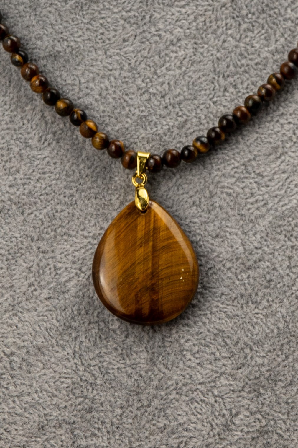 Collar artesanal que destaca por la calidez y fuerza del ojo de tigre café, piedra conocida por su energía y protección. Cuenta con broche enchapado en oro y cadena de alargue de 5 cm para un ajuste cómodo y versátil. Una pieza elegante y atemporal, perfecta para añadir carácter y estilo a cualquier atuendo.
